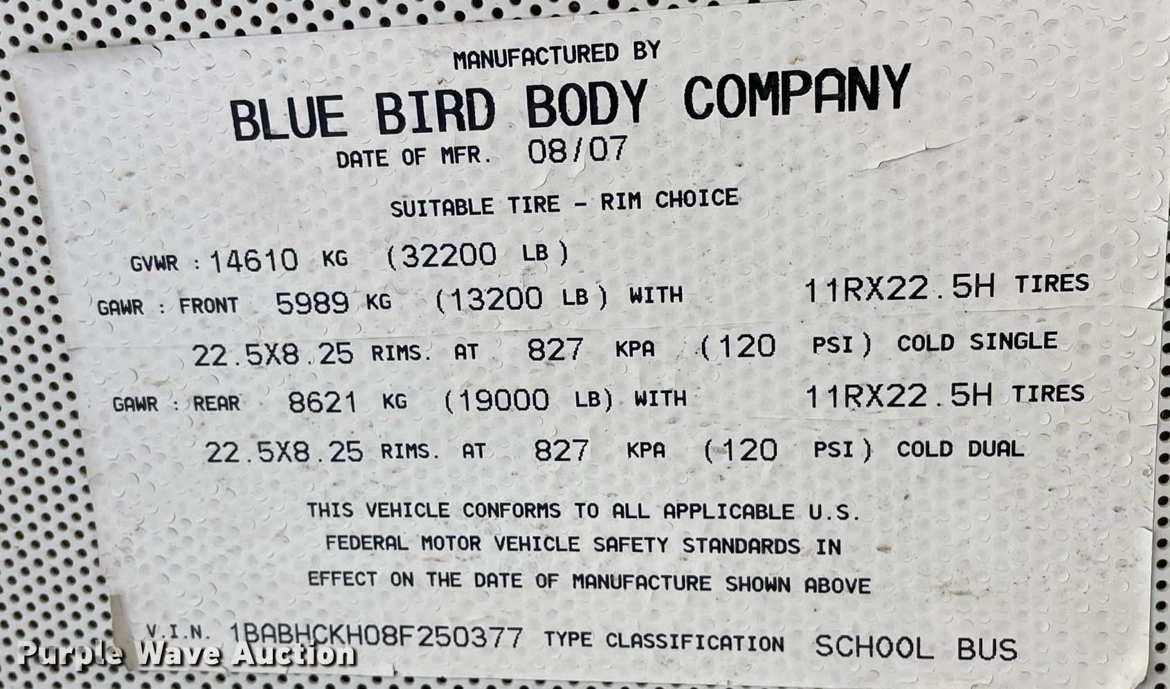 Purple Wave is selling a used Bus in Kansas. This item is a 2008 Blue Bird All American FE School bus with the following: Miles: Unknown, VIN: 1BABHCKH08F250377
