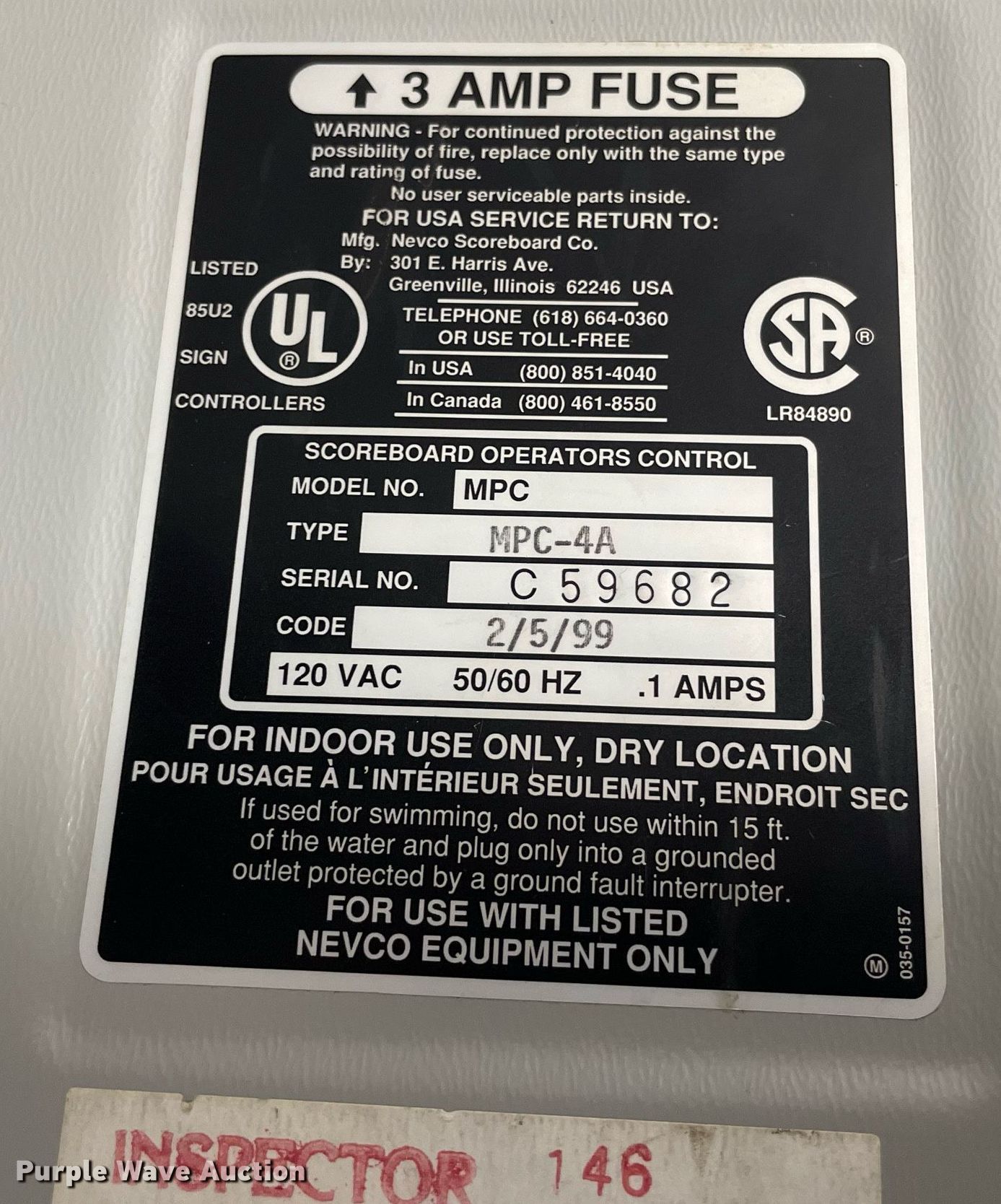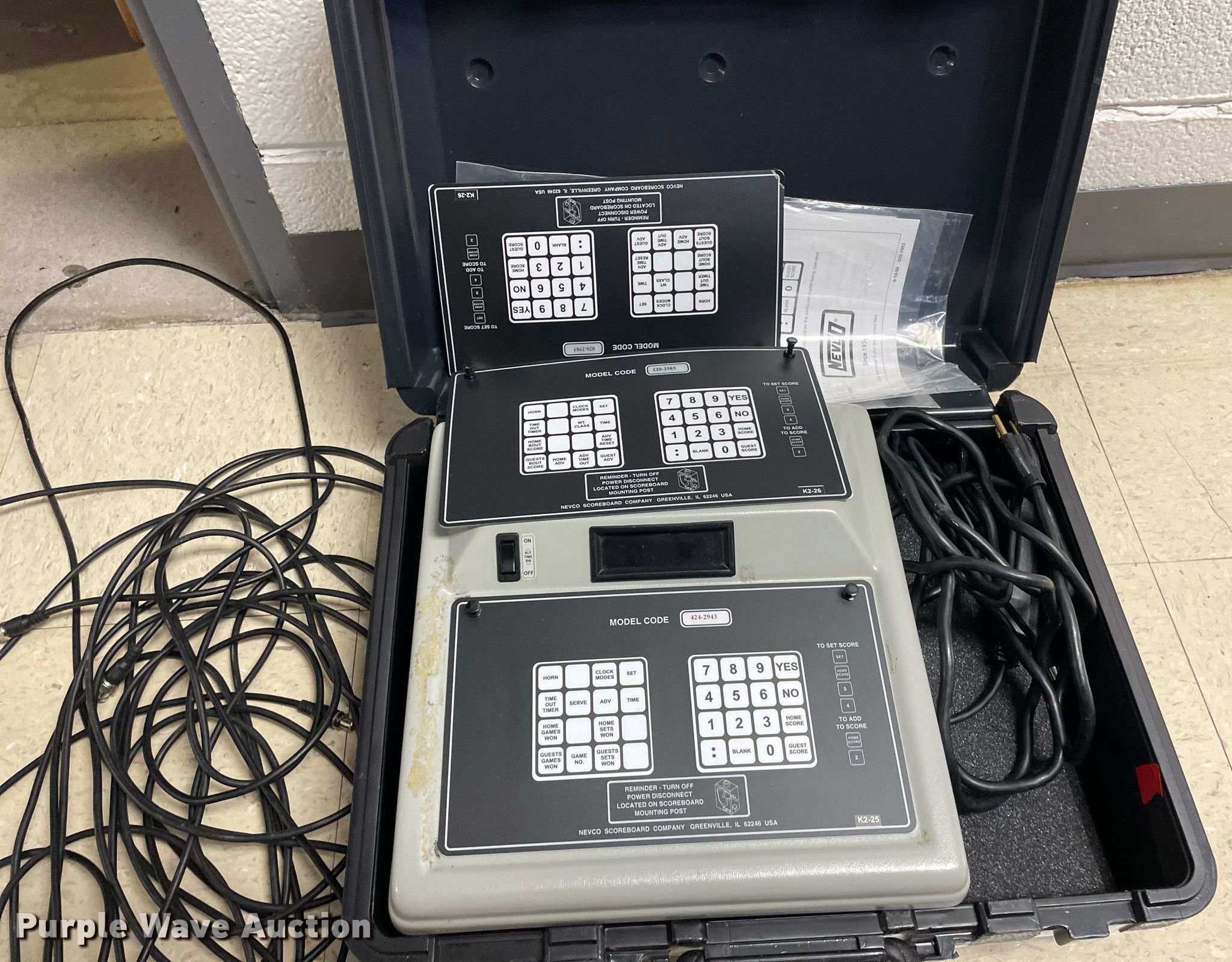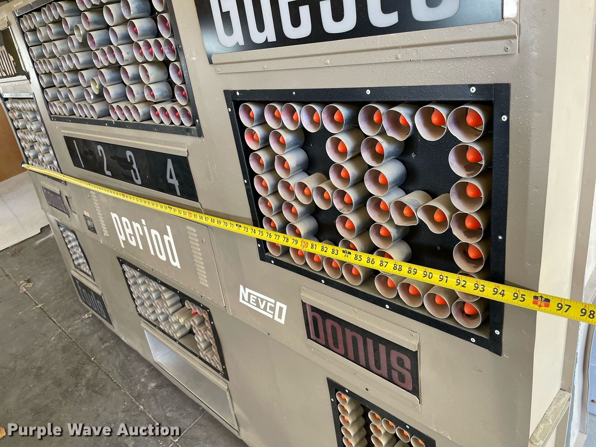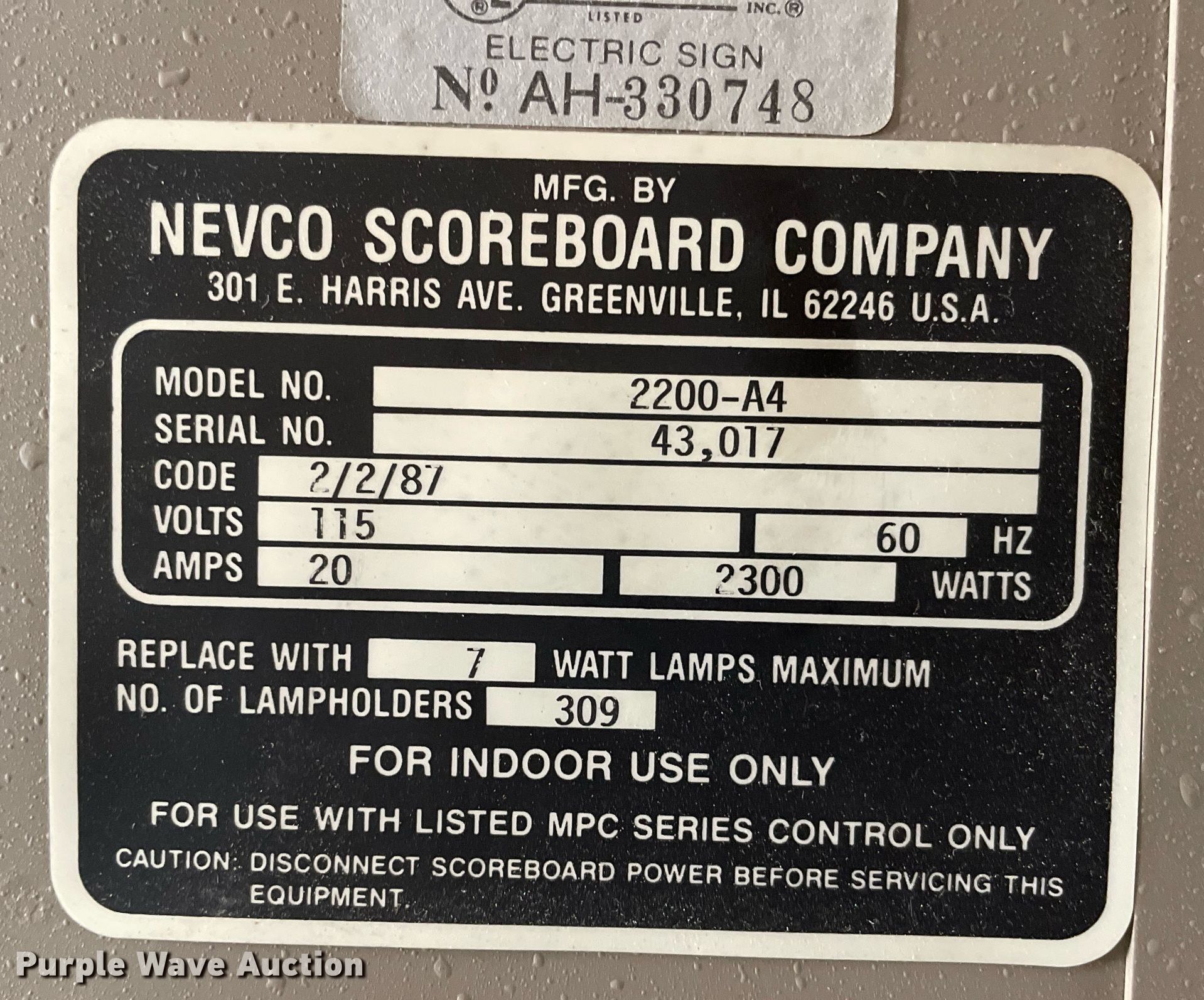 Purple Wave is selling a used Sporting Goods in Kansas. This item is a (2) Nevco scoreboards with the following: Models:, 2200-A4, 2000-A4, (2) Nevco 2006-E shot clocks, Nevco MPC controller