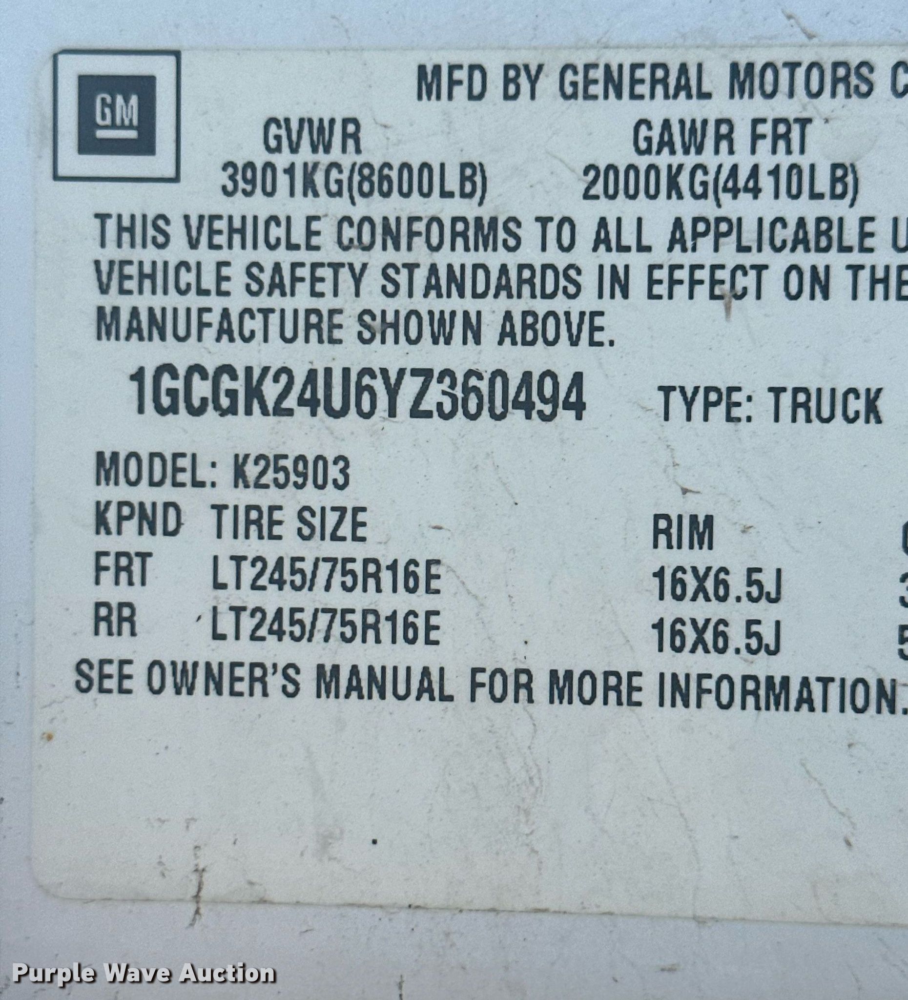 2000 Chevrolet Silverado 2500 flatbed pickup truck. Miles: 116,371 on odometer, VIN: 1GCGK24U6YZ360494. Engine Displacement: 6.0L V8 OHV, Cylinders: 8, Fuel type: Gas. Transmission Automatic, Four wheel drive. Interior AC, Heat, Cruise control. Features Flatbed 8' 6" L x 86" W. Tires Size: 245/75R16. Kansas title. Title distribution may be delayed up to 14 days from verification of funds. Lane County. Dighton, KS 67839