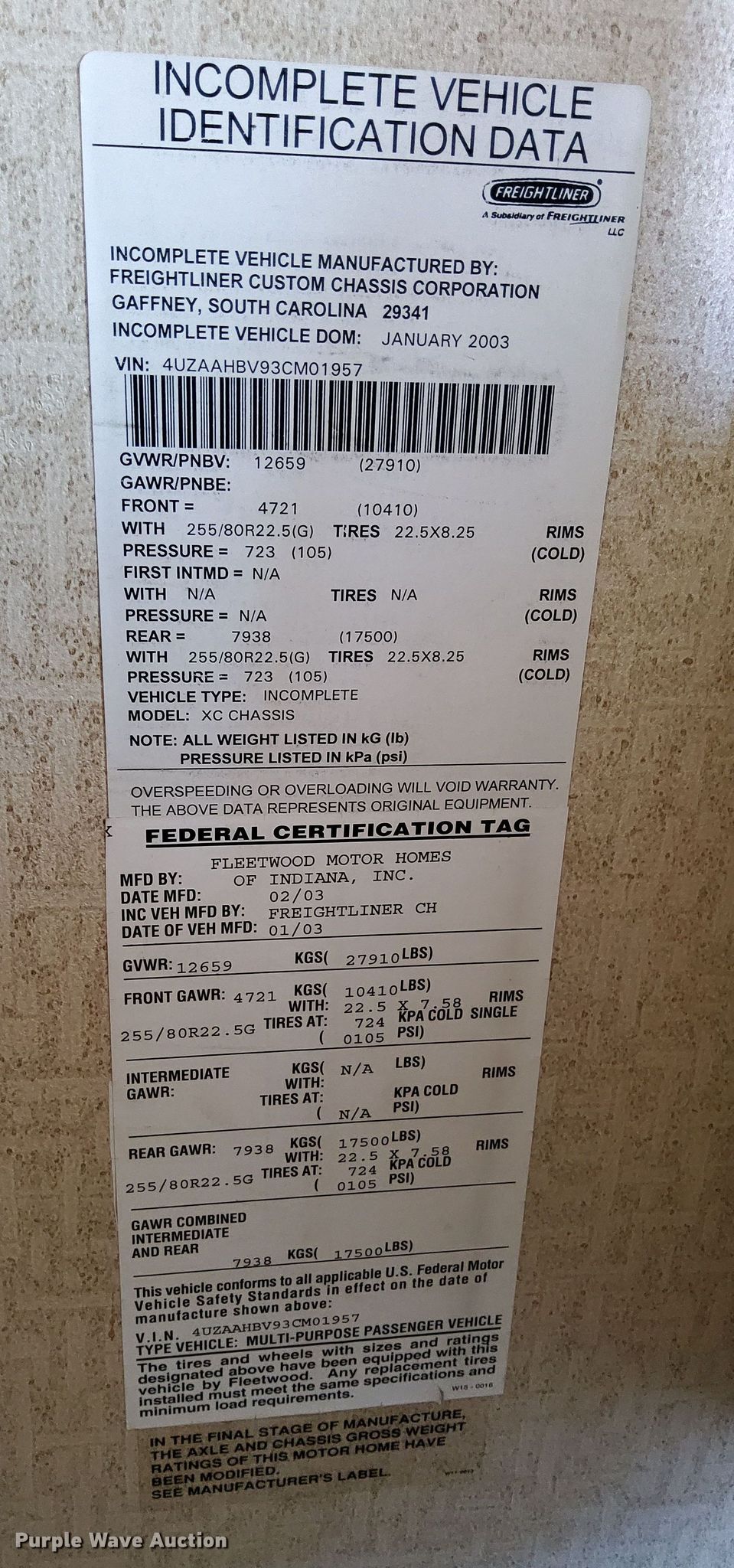 2003 Fleetwood Bounder RV. Miles: 681 on odometer Actual miles unknown, Camper length: 37', VIN: 4UZAAHBV93CM01957. Engine Cummins, Displacement: 5.9L, Cylinders: 6, Fuel type: Diesel, HP: 300. Transmission Automatic. Chassis Axles: Single, Suspension: Air, Brakes: Air. Interior Kitchen: Sink, Refrigerator, Freezer, Microwave, Oven, Stove: Propane, Living room: Table, Couch, Pull out couch, Bathroom, Washer, Dryer, Beds: 1 Bed type: Queen, TVs: 2, Satellite, Heater units: 2, AC units: 2. Features Slide outs: 2, Awnings: 1 Awning type: Manual, Auto leveler, Generator Onan 7500, Fuel type: Diesel, kW: 7.5, Rear hitch. Tires Size: 265/75R22.5, Brand: Toyo. Notes Engine replaced at 35,193 miles, Odometer replaced at 35,193 miles. View repairs. Colorado title. Mileage has not been verified. Exempt will be written in the odometer disclosure on the title. 12167 County Rd 28. Fort Lupton, CO 80621