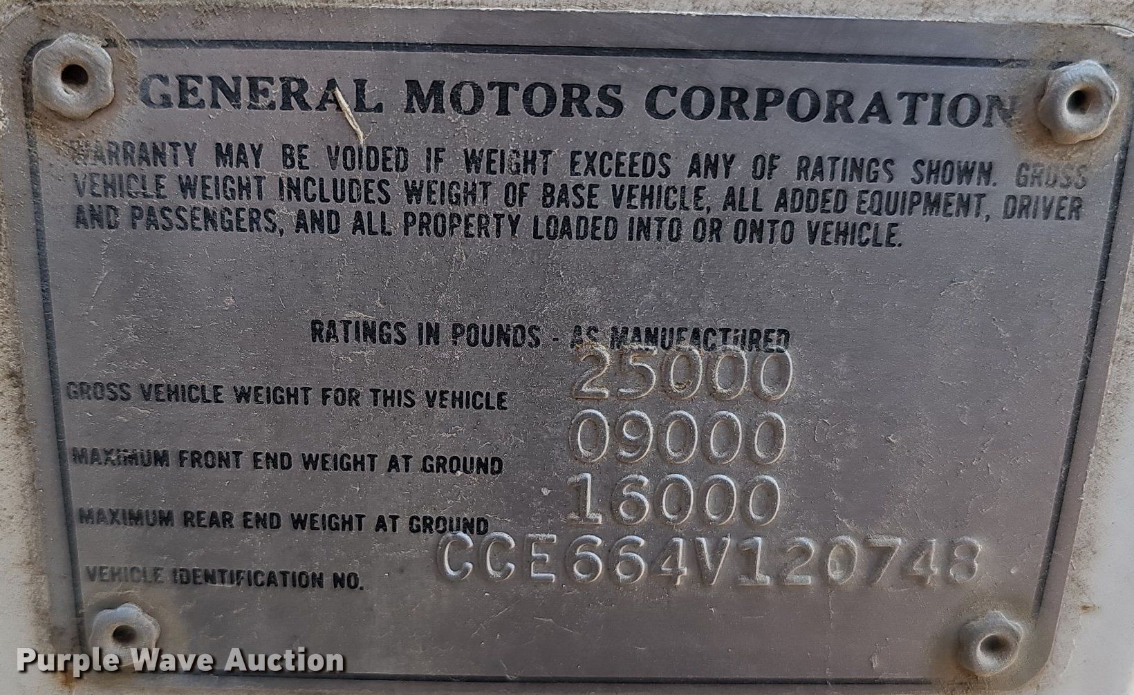 1974 Chevrolet C65 grain truck. Miles: 40,001 on odometer Actual mileage unknown, VIN: CCE664V120748. Engine Cylinders: 8, Fuel type: Gas. Transmission Manual, Speed: 5, plus 2. Chassis Axles: Single, Suspension: Spring, Brakes: Hydraulic, PTO, GVWR: 25,000 lbs FAWR: 9,000 lbs, RAWR: 16,000 lbs, Wheelbase: 208". Features Dump bed Obeco, 18' L x 93 1/2" W, Side height: 48", Side board height: 18", Bed type: Steel, Ram: Single , End gate: Manual. Tires Size: 9.00-20. Notes Glass missing, Non-operational engine , Unknown operating condition. Nebraska title. Mileage has not been verified. Exempt will be written in the odometer disclosure on the title. Title distribution may be delayed up to 14 days from verification of funds. Stark and Sons Construction Co. Inc.. 21803 R & R Road. Gretna, NE 68028