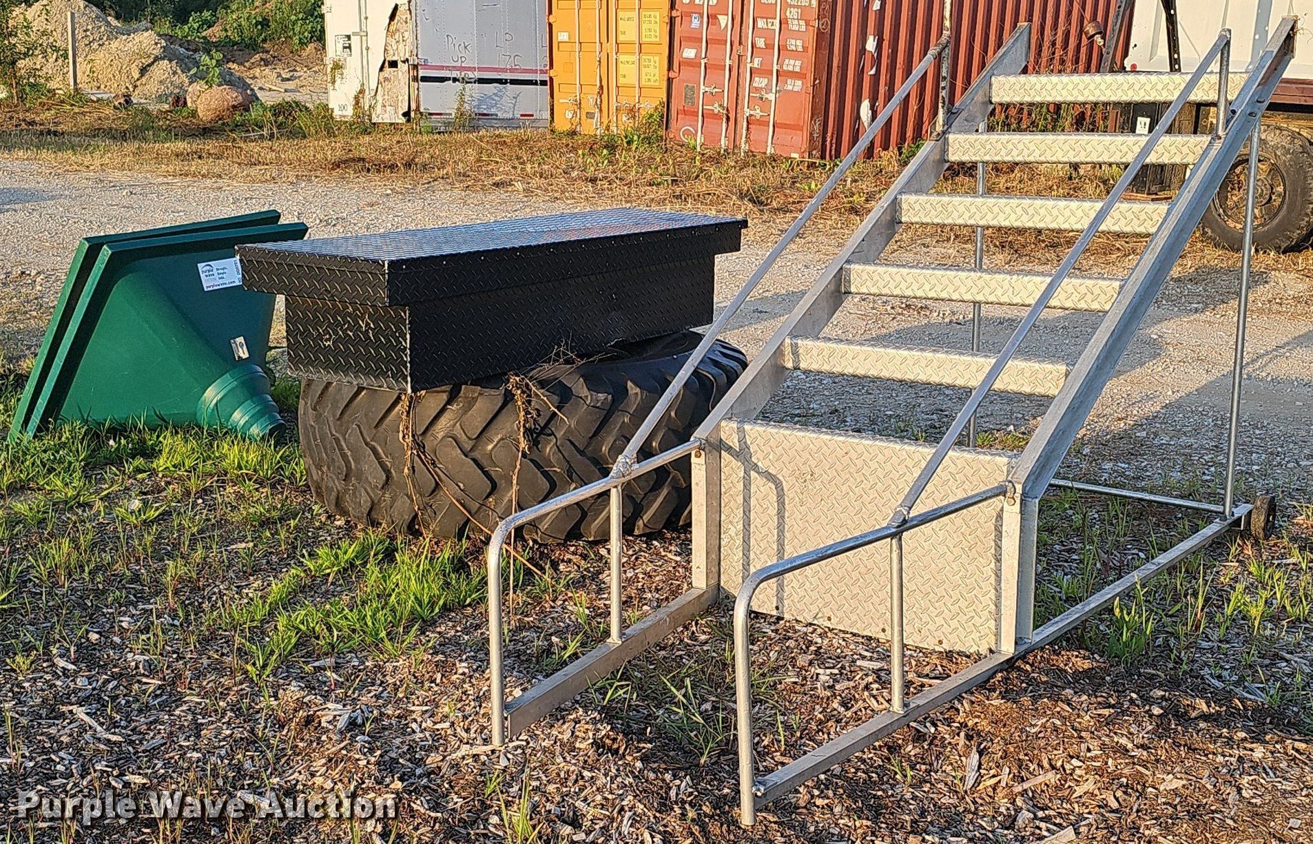 Purple Wave is selling a used Tools in Nebraska. This item is a Tools with the following: Aluminum warehouse ladder, 36" W x 62" D x 10' H, 70 1/2" W toolbox, Bridgestone 20.5R25 tire, (2) poly funnels, Approximately 22 rolls of chain link fencing, Height: 6', (32) posts, (20) 18' L top rails