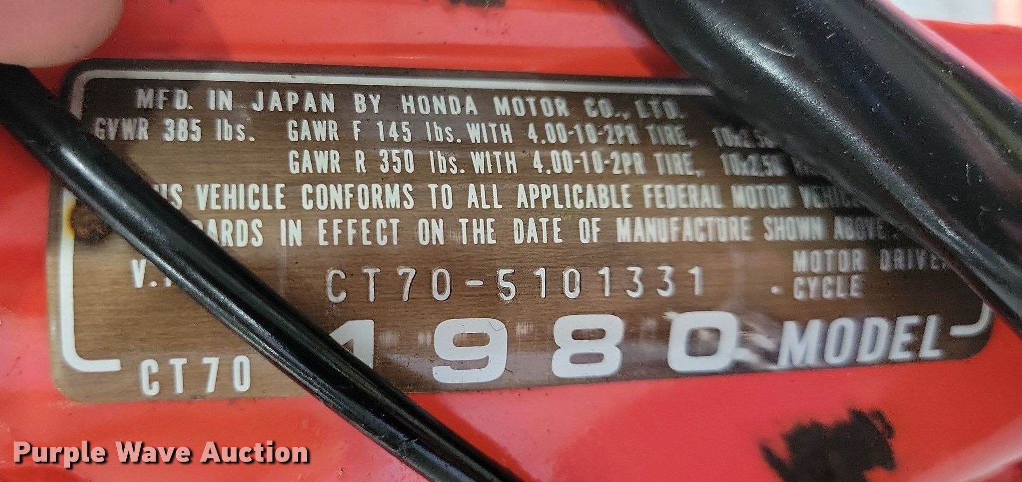 1980 Honda Mini Trail 70 mini bike. Miles: 1,626 on odometer, VIN: CT705101331. Engine Cylinders: 1, Fuel type: Gas. Transmission Manual. Tires Size: 4-10. Notes Non-operational unit. Transfer of ownership documentation will be a bill of sale which will be assigned and distributed by the seller. Midwest Auto Sales. 6229 US Highway 63. Ottumwa, IA 52501