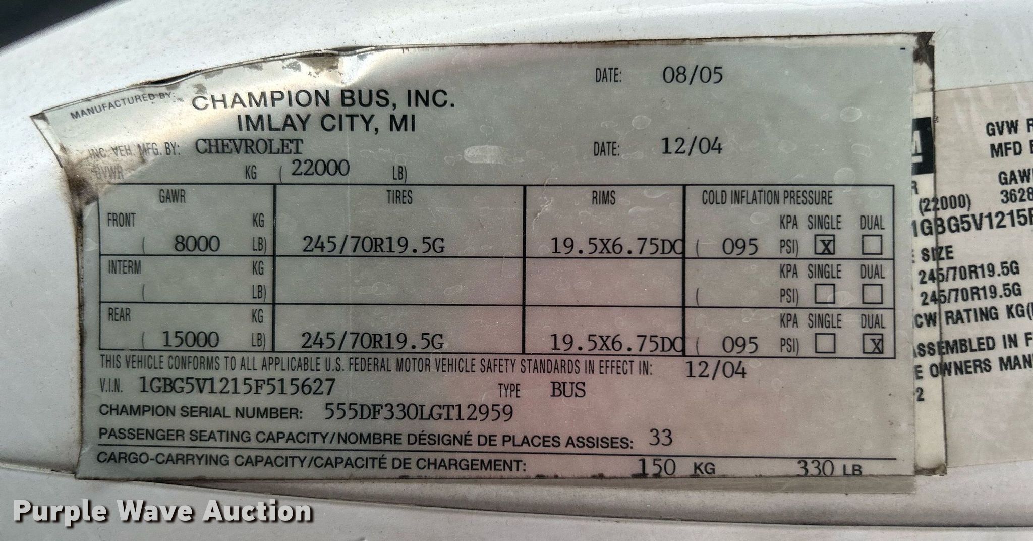 Purple Wave is selling a used Bus in Oklahoma. This item is a 2005 Chevrolet C5500 shuttle bus with the following: Miles: 66,336 on odometer, VIN: 1GBG5V1215F515627