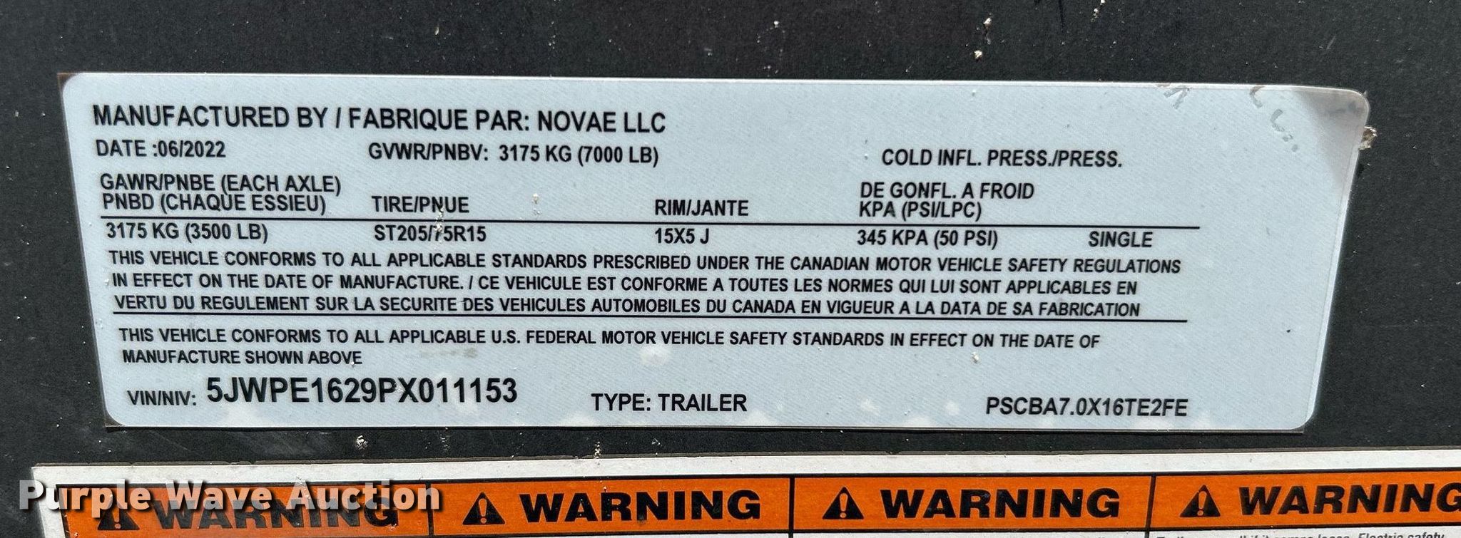 2023 Pace enclosed cargo trailer. VIN: 5JWPE1629PX011153. Dimensions Overall: 20' L x 90" W, Body: 18' L x 74" W. Features Deck type: Wood, E-track rail system. Chassis Ball hitch: 2 5/16", Landing gear: Single, Suspension: Spring, Brakes: Air, Axles: Tandem, GVWR: 7,000 lbs, GAWR: 3,500 lbs. Tires Steel wheels, Size: 205/75R15. Notes Side door damaged. Oklahoma title. Title distribution may be delayed up to 14 days from verification of funds. 15107 North 137th East Avenue. Collinsville, OK 74021