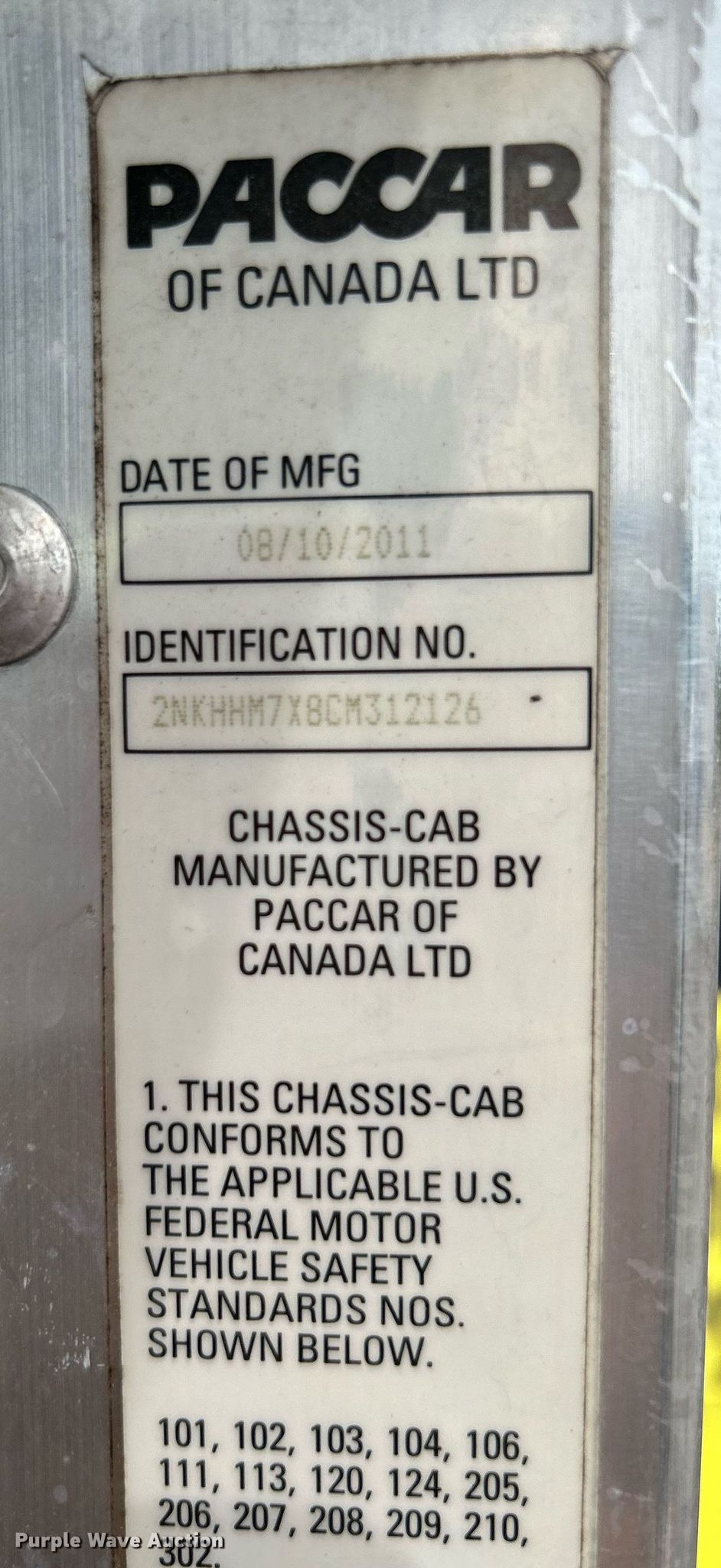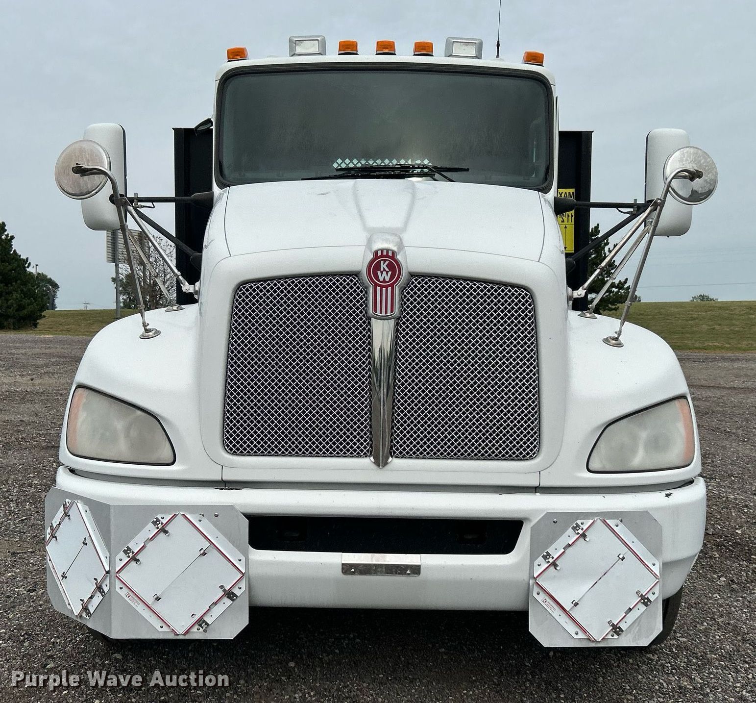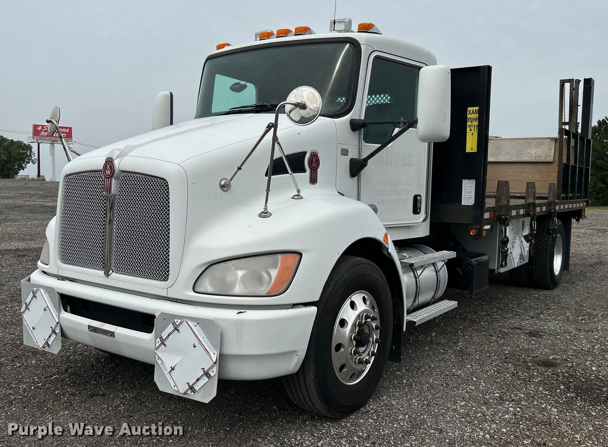 2012 Kenworth T370 flatbed truck. Miles: 166,829 on odometer, Hours: 10,009 on meter, VIN: 2NKHHM7X8CM312126. Engine Paccar PX-6, Displacement: 6.7L, Cylinders: 6, Fuel type: Diesel, HP: 325. Transmission Automatic. Chassis Axles: Single, Suspension: Air, Brakes: Air, GVWR: 33,000 lbs. Interior AC, Heat, Cruise control. Features Flatbed 18' L x 101" W, End gate lift Maxon, Capacity: 3,500 lbs. Tires Size: 295/75R22.5. Notes Dash warning indicator: Check engine, Lift gate issues, will not extend. 15107 North 137th East Avenue. Collinsville, OK 74021