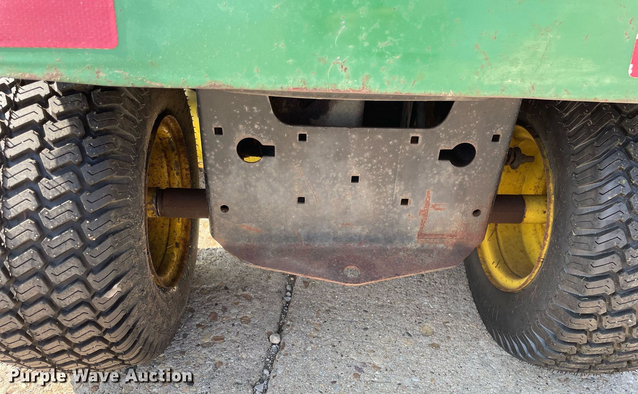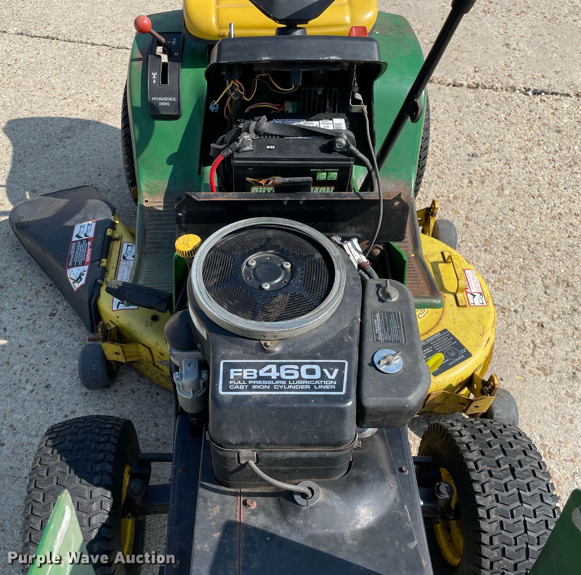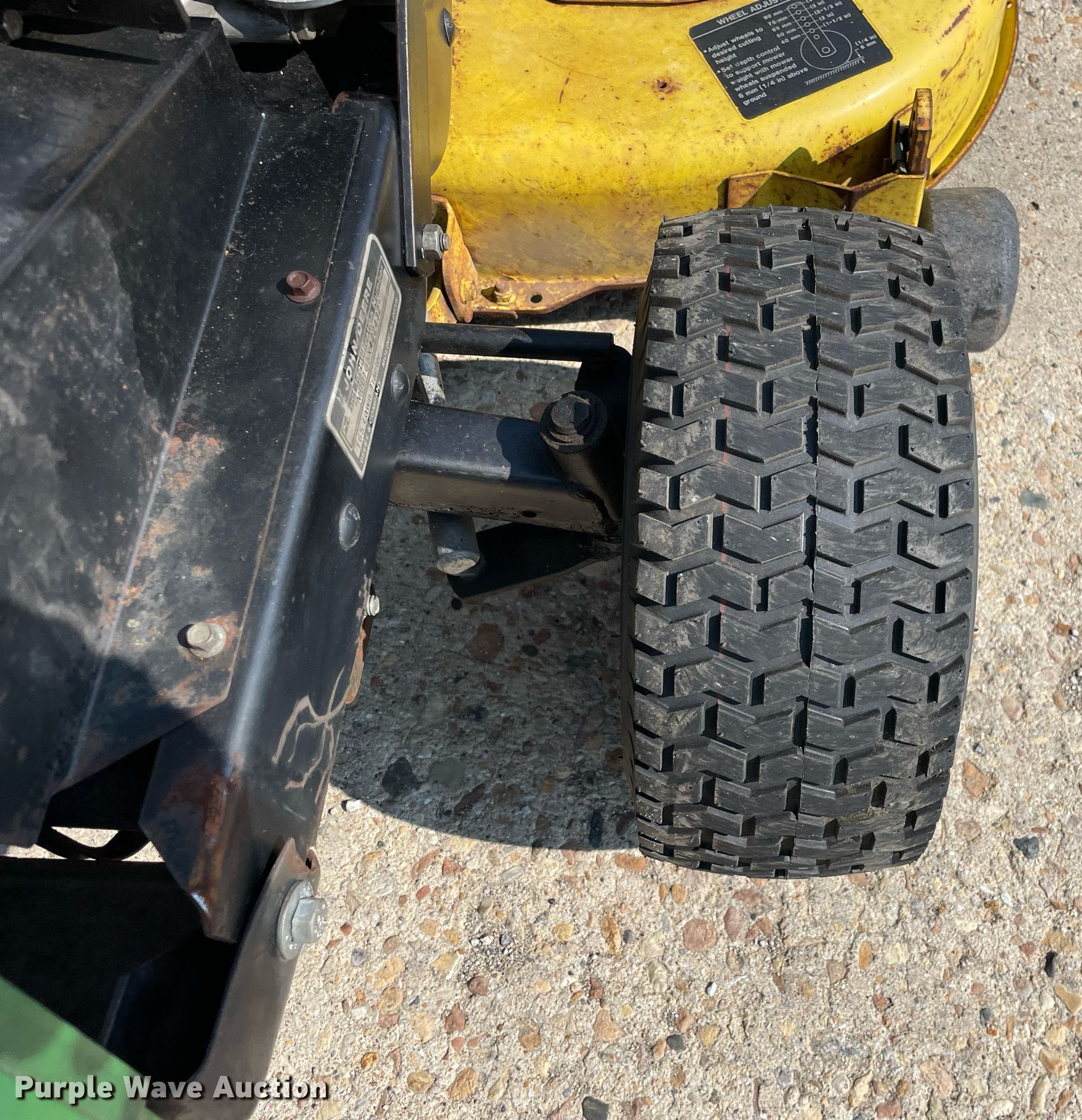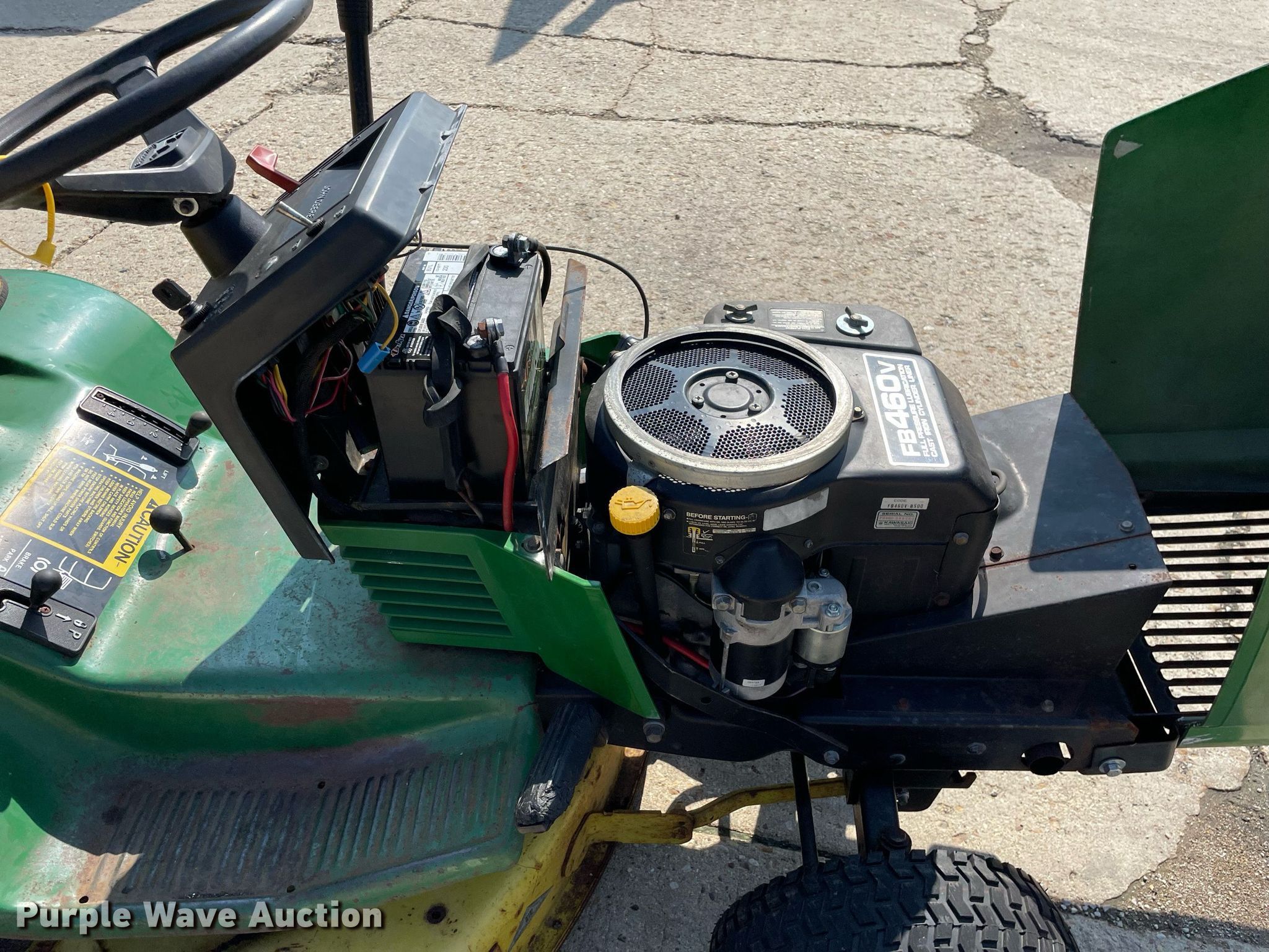 John Deere 165 lawn mower. Cutting width: 38", Serial: M00165X422432. Engine Kawasaki FB460V, Fuel type: Gas. Transmission Hydrostatic. Tires Front: 15x6.00-6, Rear: 18x8.50-8. 1001 North Randall Road. Elgin, IL 60123