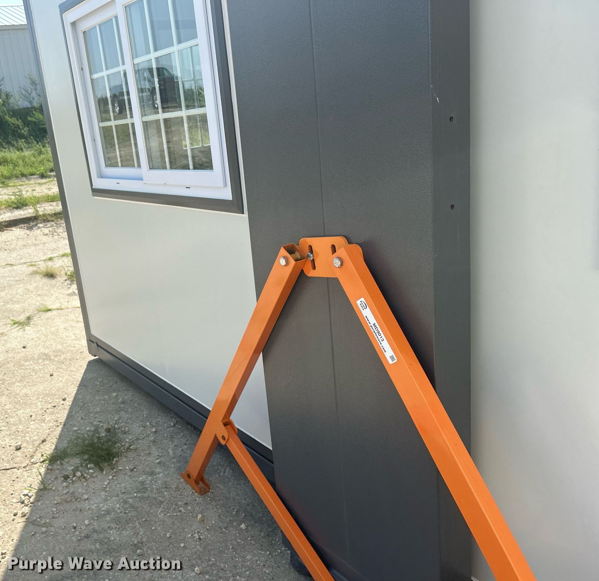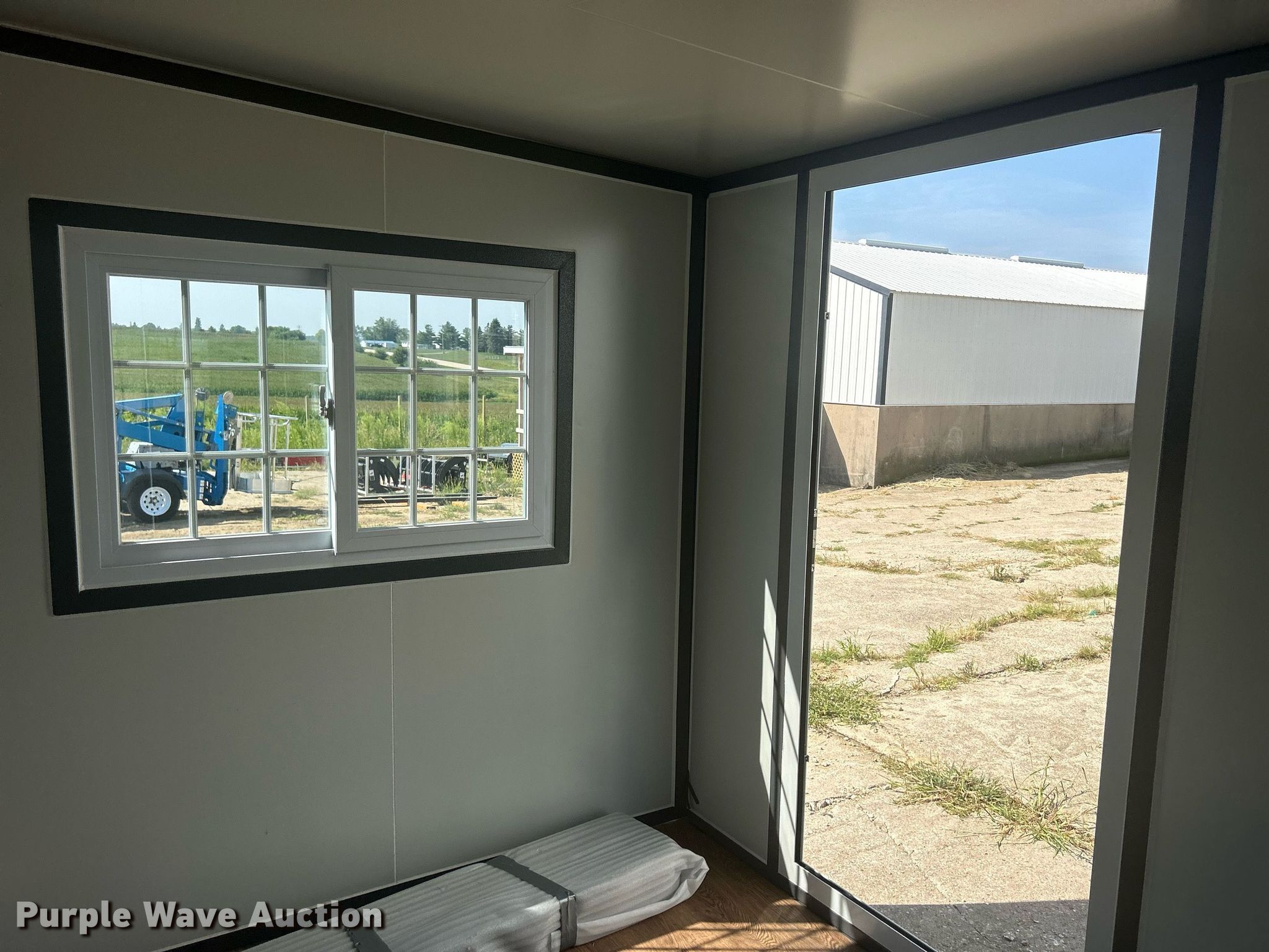 Purple Wave is selling a used Building Materials in Iowa. This item is a Bastone foldable office building with the following: 20' x 15', 82"H ceiling, 73" x 35" door, (7) 44" x 28" windows, 28" x 17" window, (8) leveling feet, Metal roof, Trailer not included, Unused