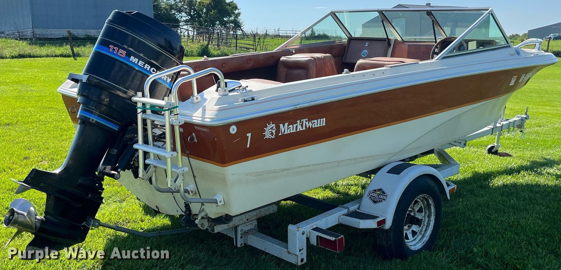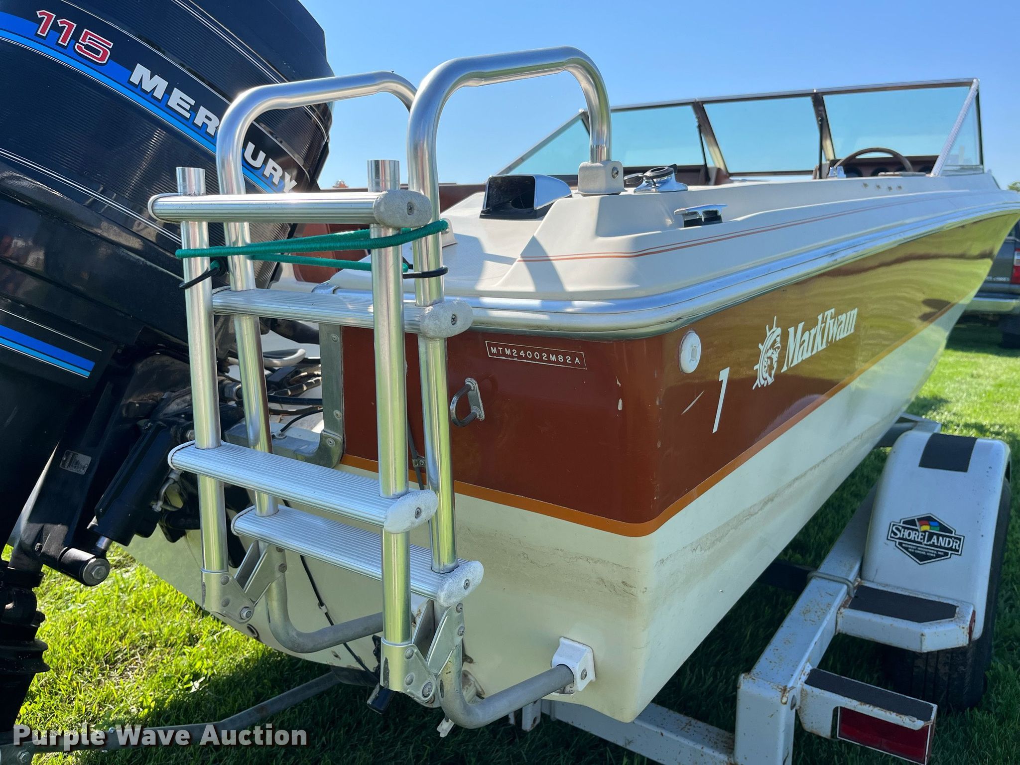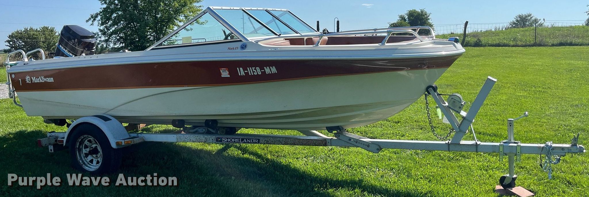 1982 MarkTwain Mark 175 boat. Length: 17' 3", Hull ID: MTM24002M82A. Engine Engine type: Outboard, Mercury, Cylinders: 6, Fuel type: Gas, HP: 115, Outdrive Propeller: Stainless steel. Operators station Capacity Person: 6, 900 lbs. Trailer ShoreLandr , VIN: 1MDBCDS14HM297827, Overall length: 19.5', Overall width: 96", Ball hitch size: 2", Axles: Single, Tire size: 205/75R14. Boat: Iowa title. Title distribution may be delayed up to 14 days from verification of funds. Trailer: Transfer of ownership documentation will be a bill of sale. 1202 North Hayes Street. Mount Ayr, IA 50854