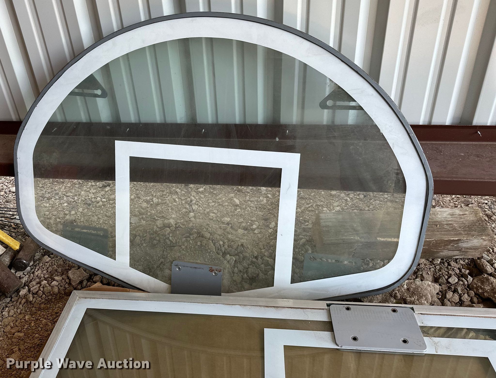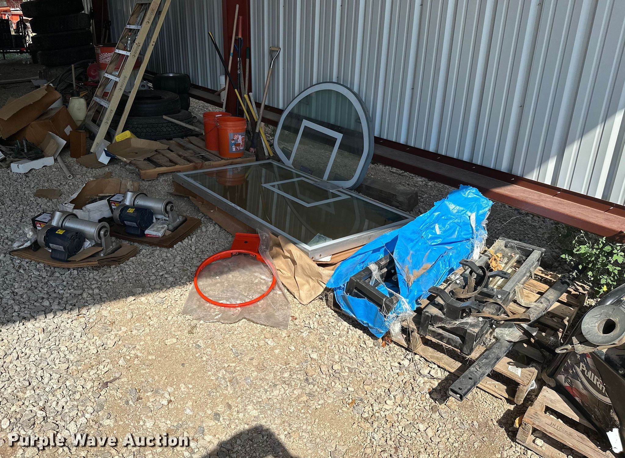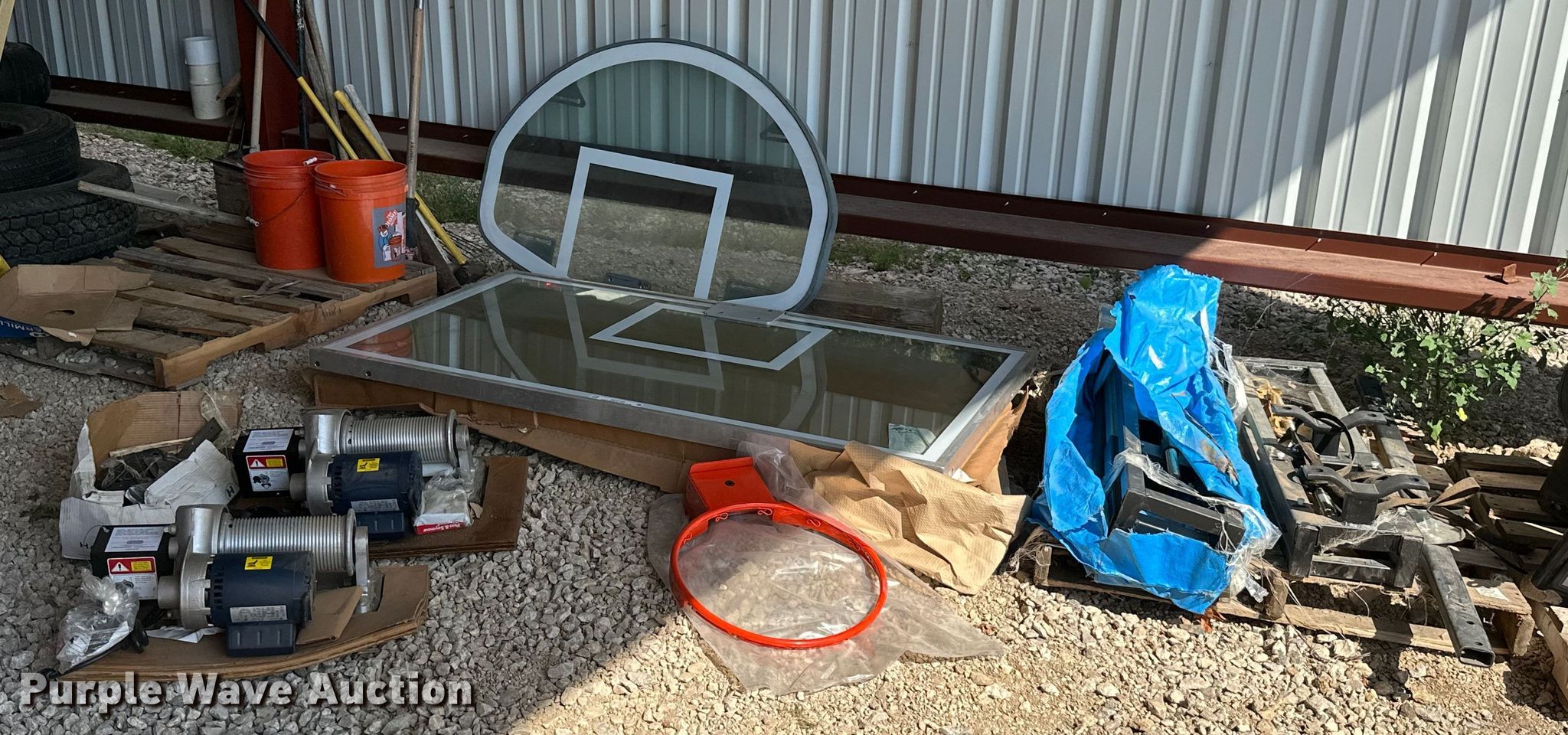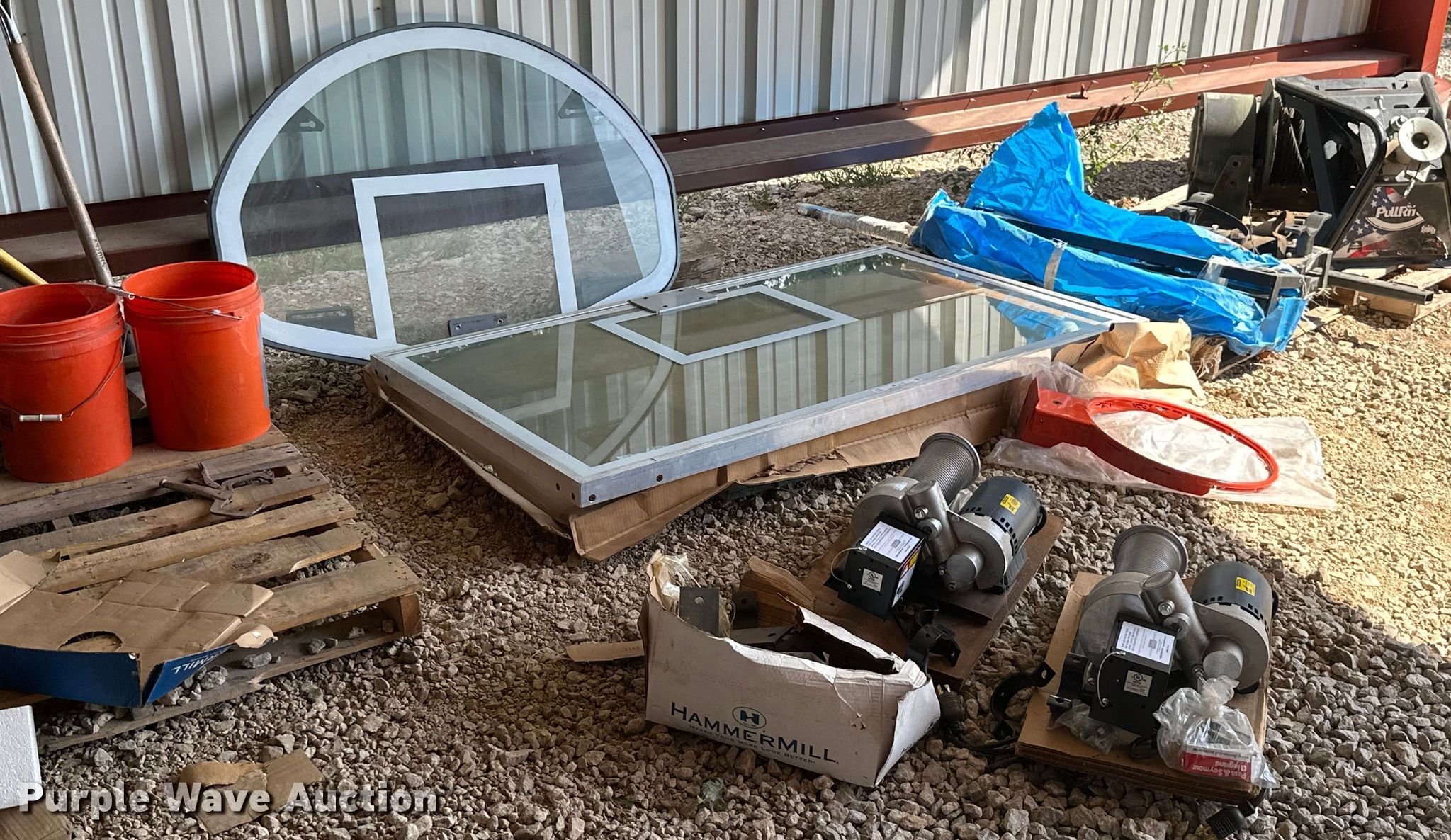 Purple Wave is selling a used Sporting Goods in Kansas. This item is a Sporting goods with the following: Basketball goal parts, Rim, (2) backboards, (2) mounting brackets, Hardware, (2) LynRus winches, Maximum capacity: 1,000 lbs, Unused