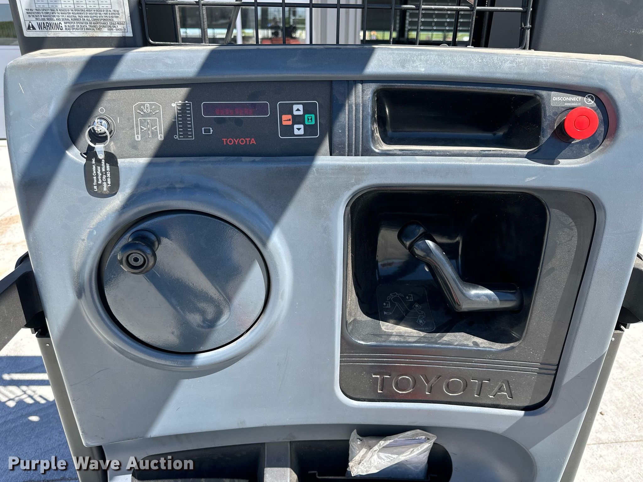 Purple Wave is selling a used Warehouse Forklift in Kansas. This item is a 2015 Toyota 6BPU15 order picker with the following: Key hours: 1,047 on meter, Deadman pedal hours: 455 on meter, Drive motor hours: 320 on meter, Lift hours: 42 on meter, Serial: 72978