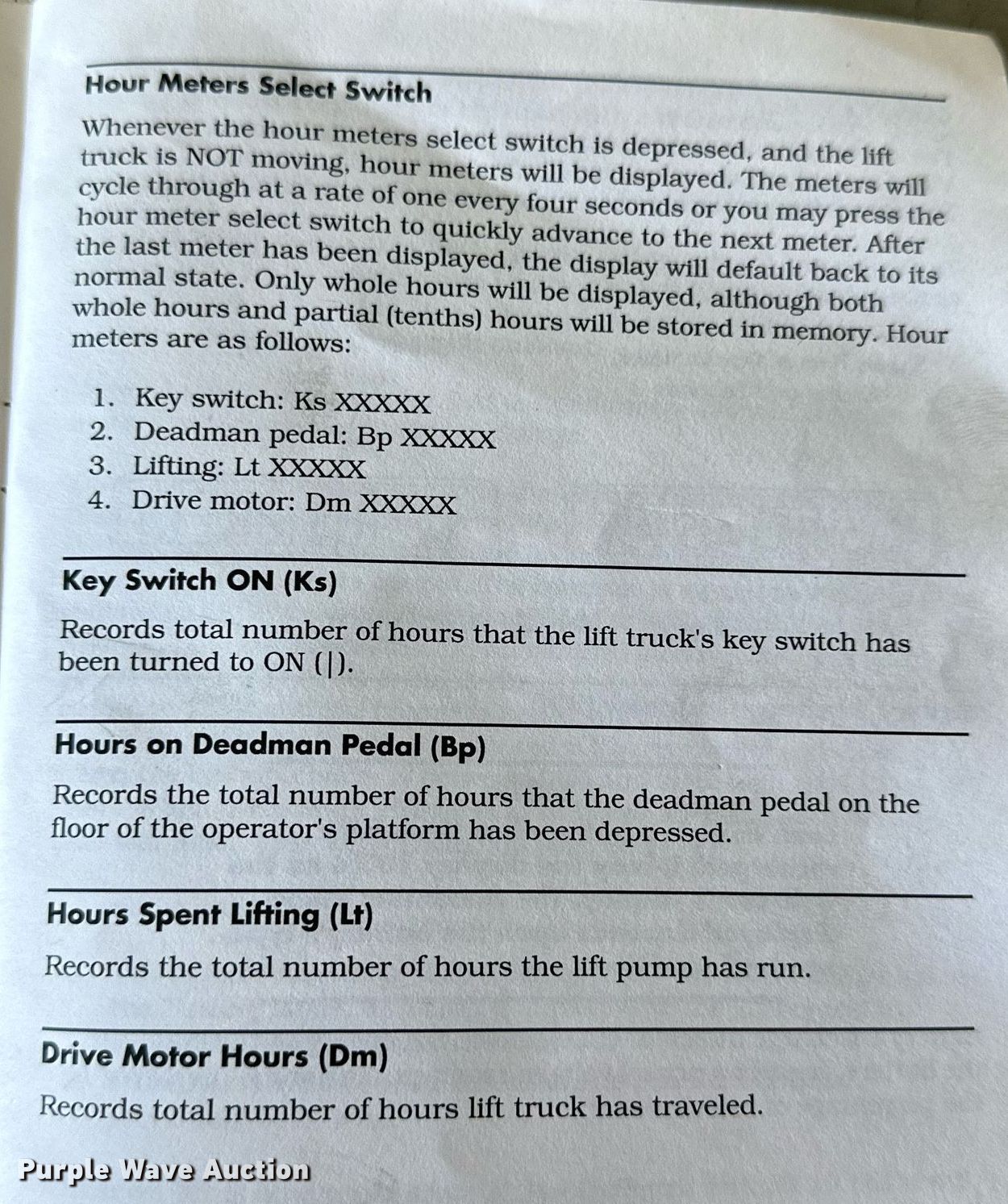 2015 Toyota 6BPU15 order picker. Key hours: 1,047 on meter, Deadman pedal hours: 455 on meter, Drive motor hours: 320 on meter, Lift hours: 42 on meter, Serial: 72978. Electric Motor Volts: 24, Charger. Transmission Hydrostatic. Operators station Canopy. Features Maximum lift capacity: 3,000 lbs, Maximum lift height: 204", Mast stages: 3. Mitten's. 1001 US-40. Oakley, KS 67748