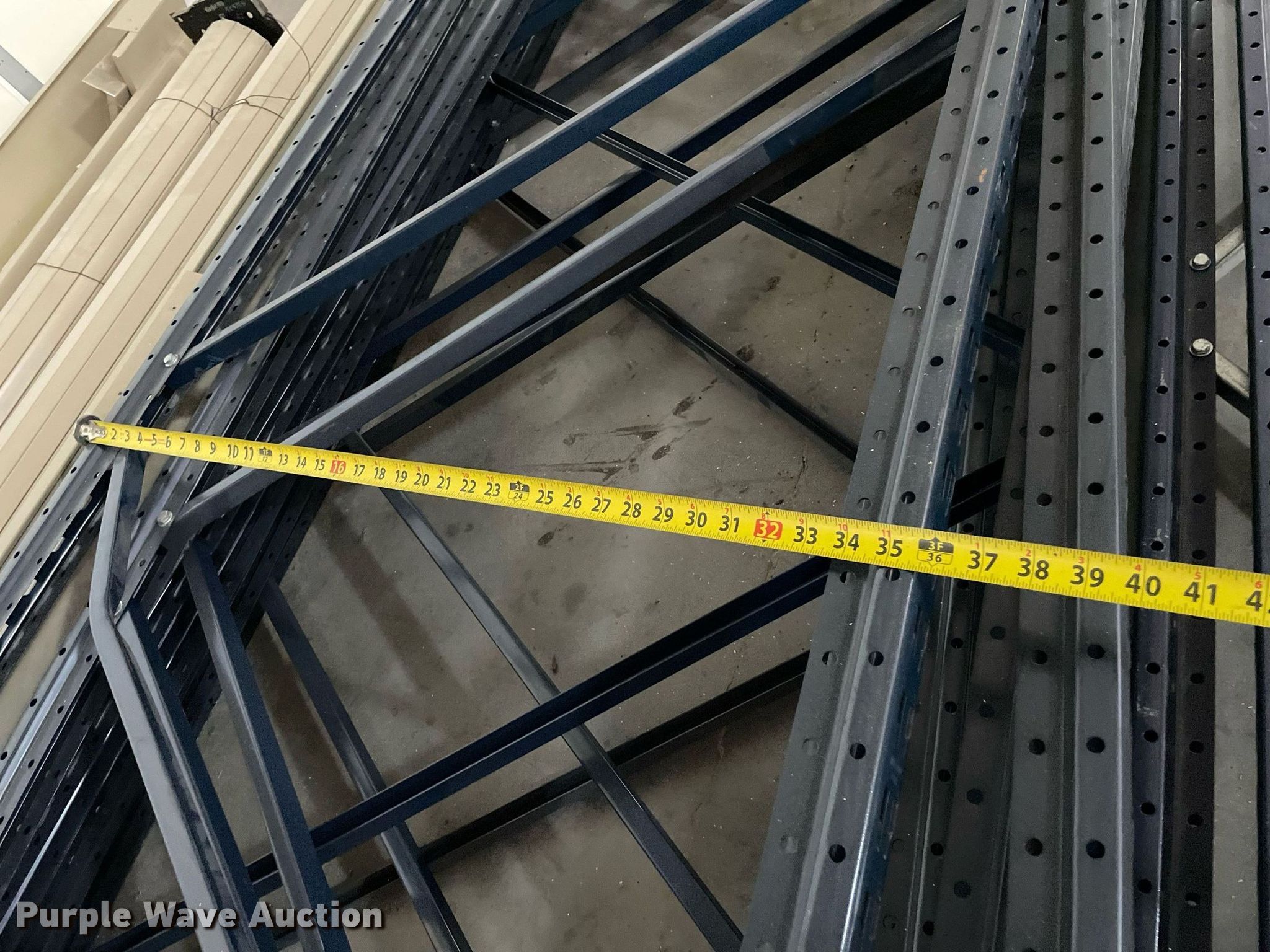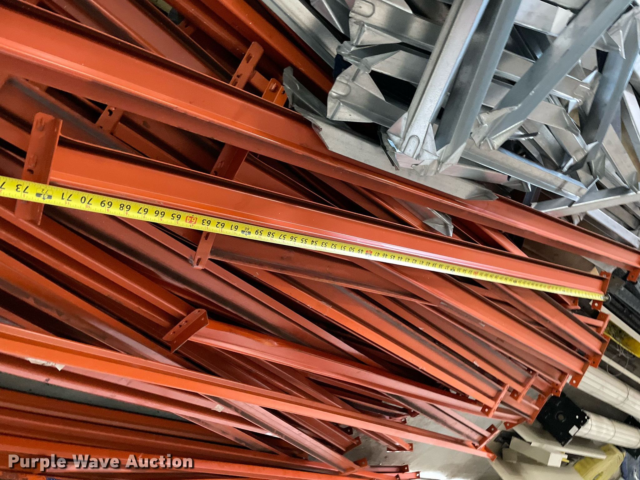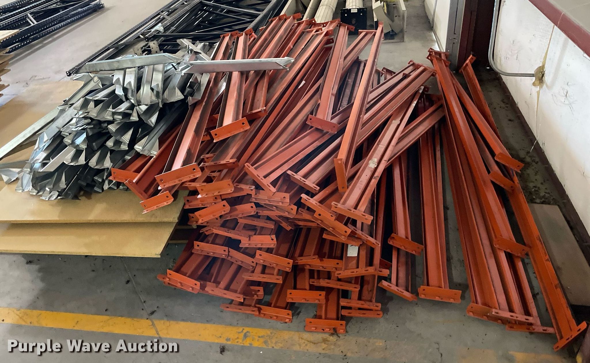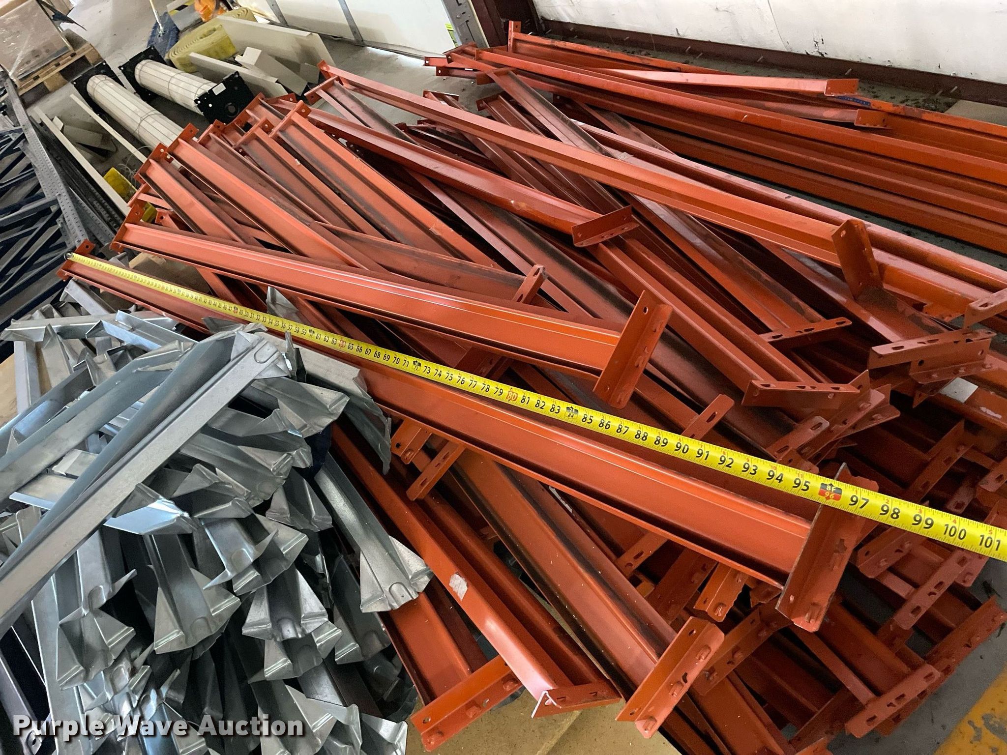 Purple Wave is selling a used Pallet Racking in Kansas. This item is a Pallet racking with the following: Uprights, (4) 8' x 24", (6) 12' x 24", (6) 12' x 36", Approx. 75 cross-members, 6' to 8' L, Approx. 50 shelves, Supports, Approx. 35 T-posts, 66" L