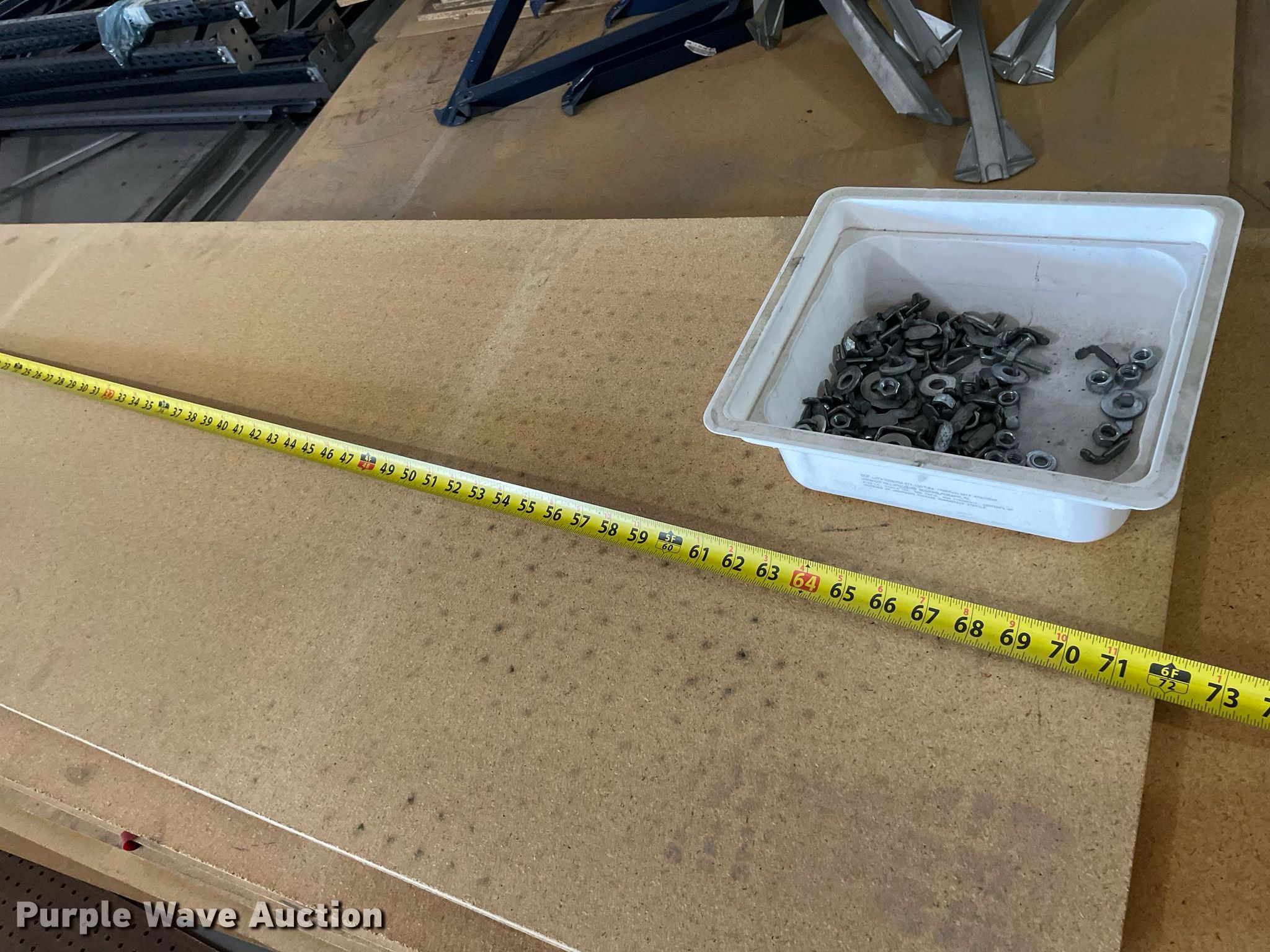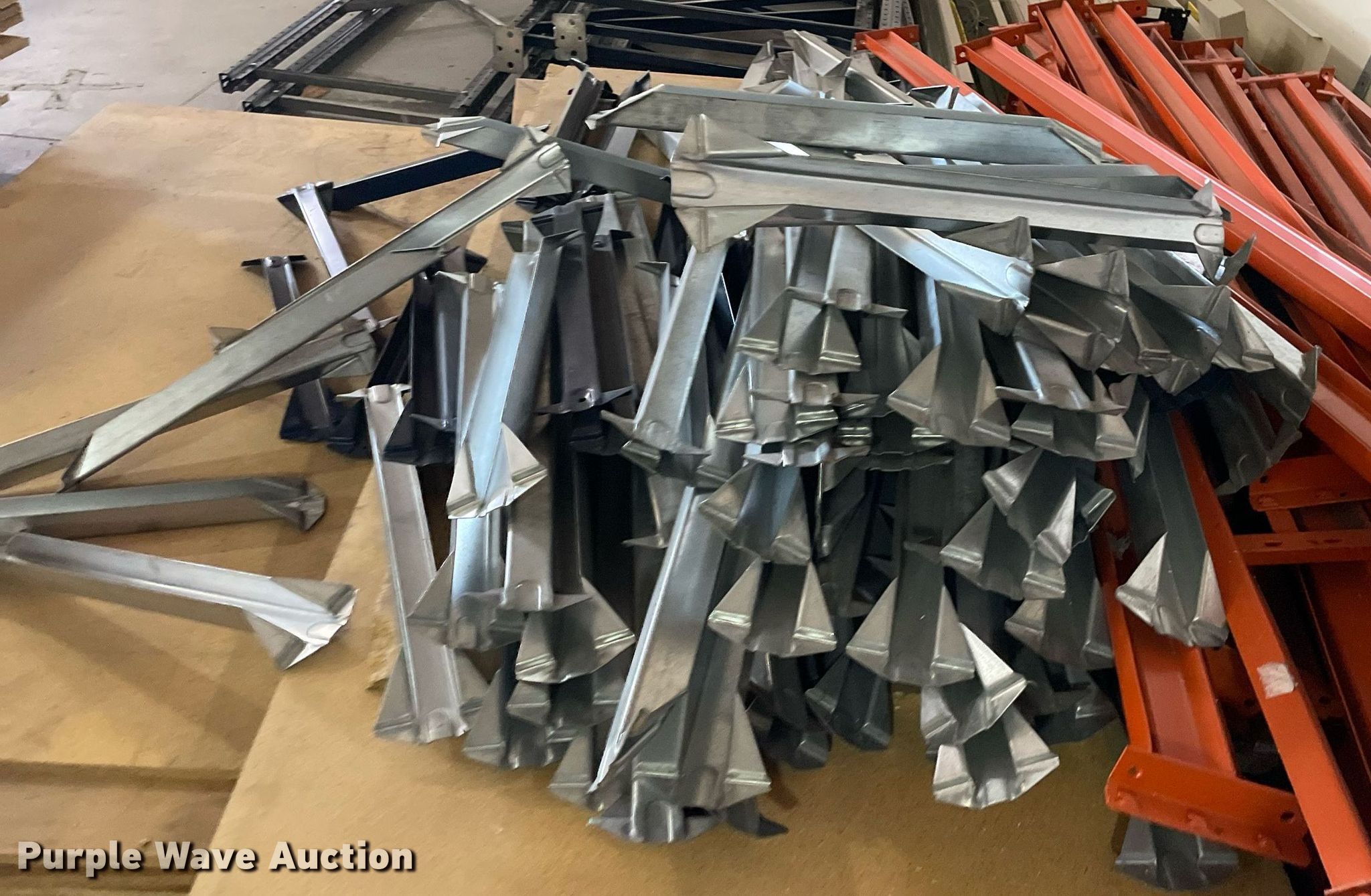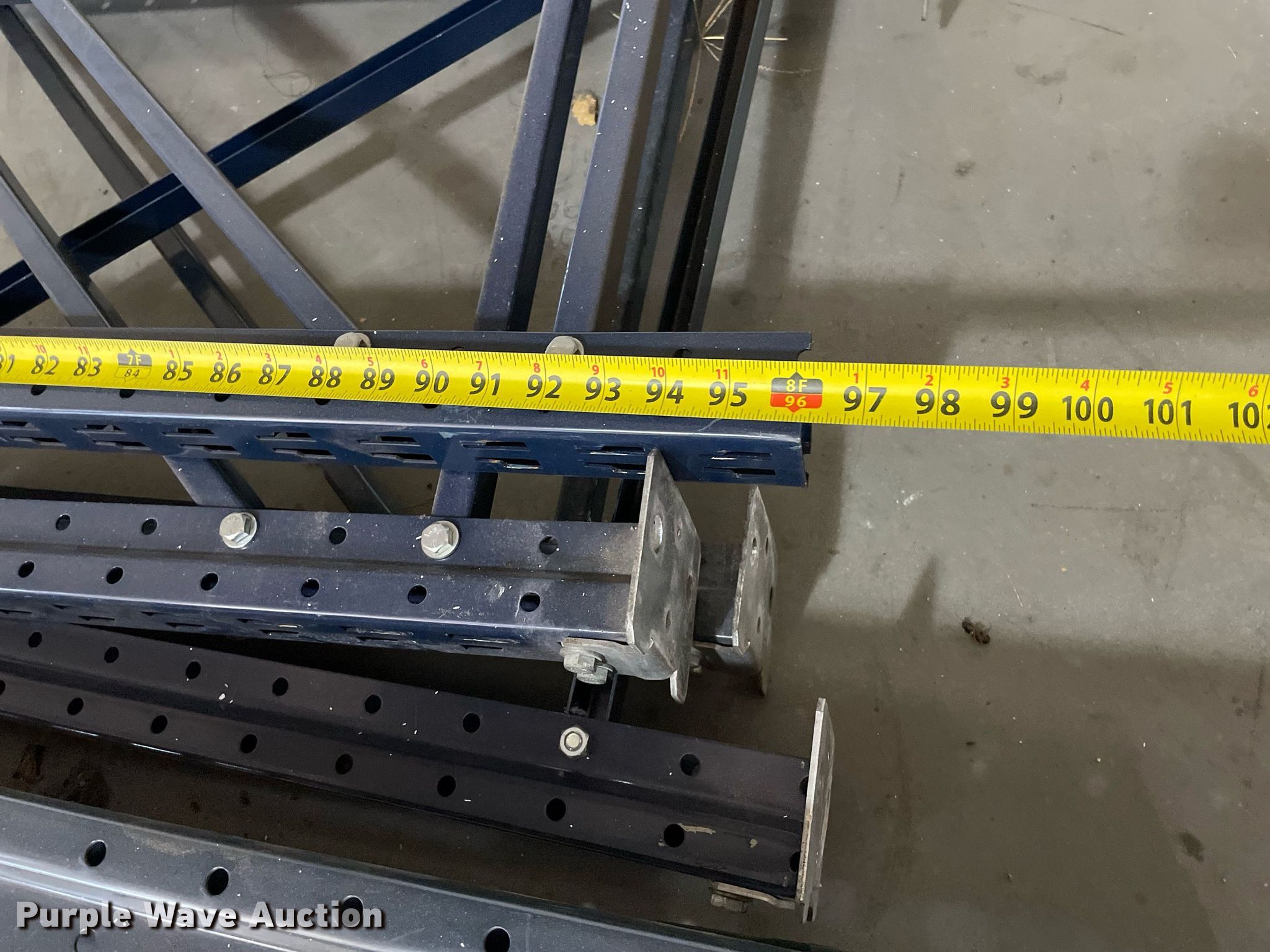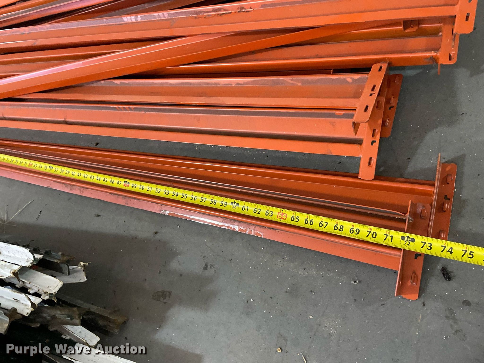 Purple Wave is selling a used Pallet Racking in Kansas. This item is a Pallet racking with the following: Uprights, (4) 8' x 24", (6) 12' x 24", (6) 12' x 36", Approx. 75 cross-members, 6' to 8' L, Approx. 50 shelves, Supports, Approx. 35 T-posts, 66" L