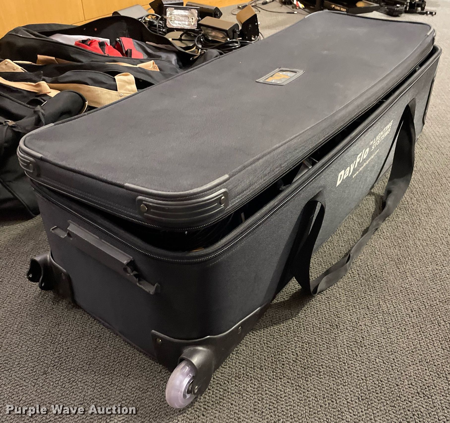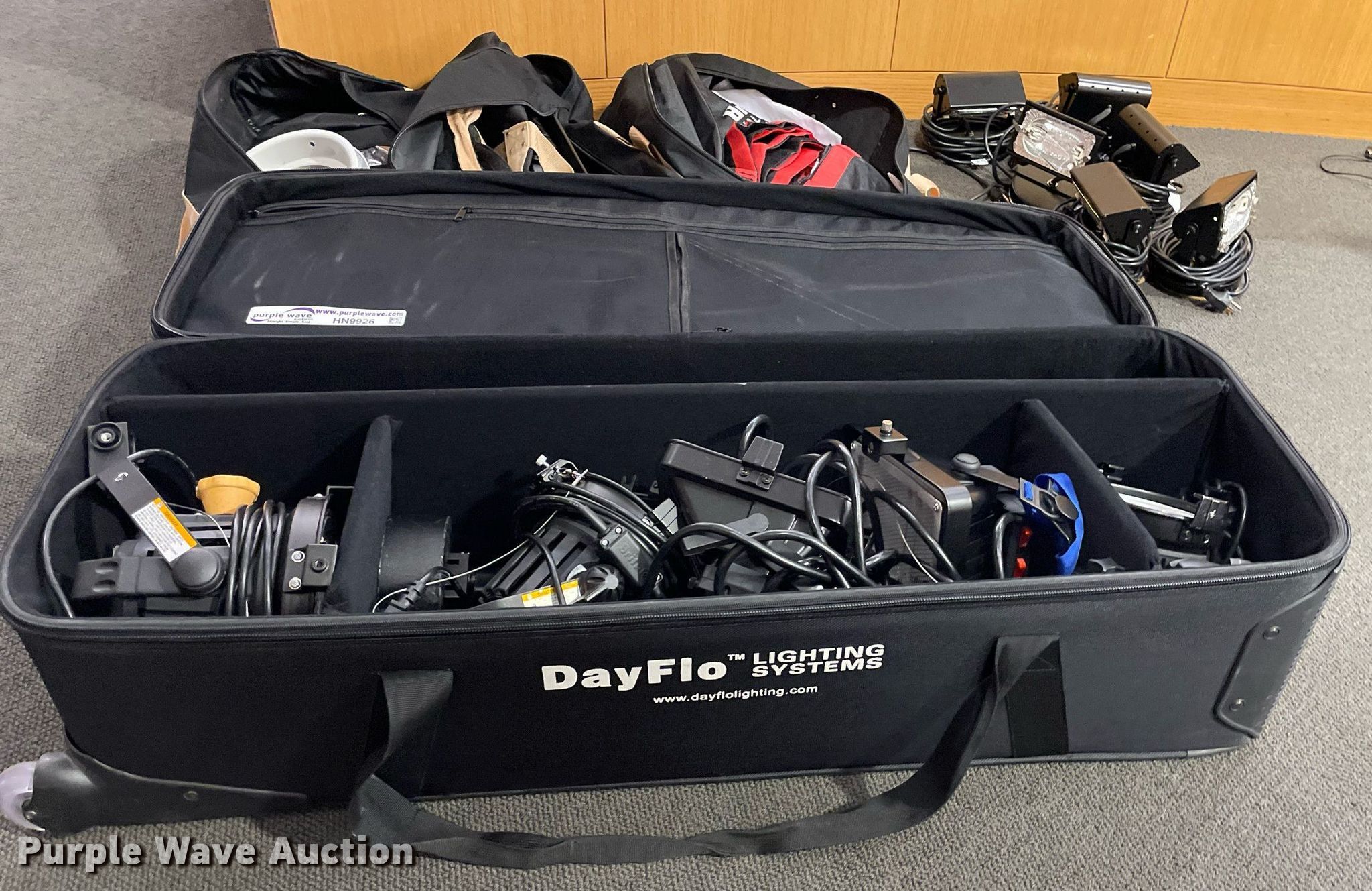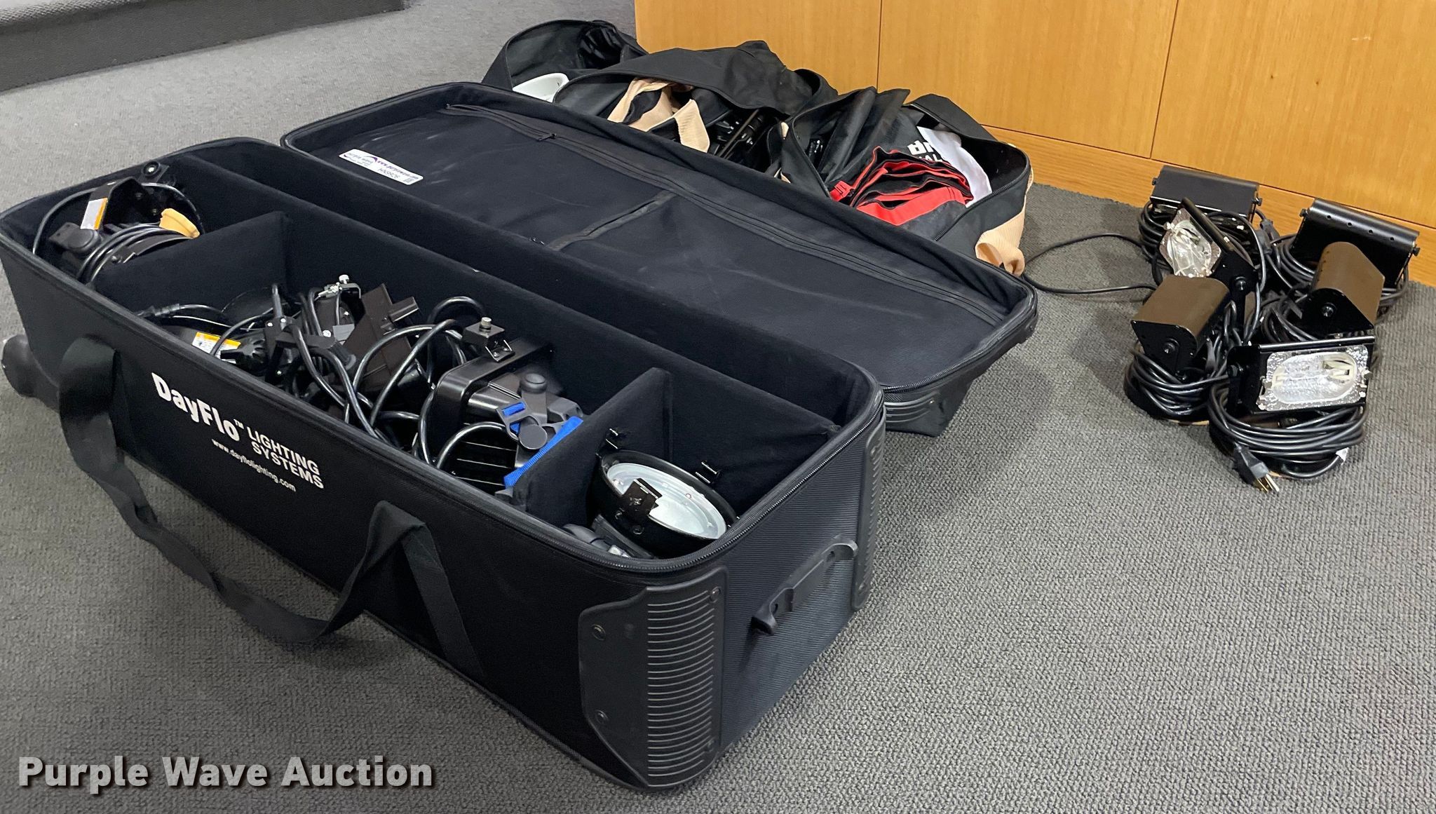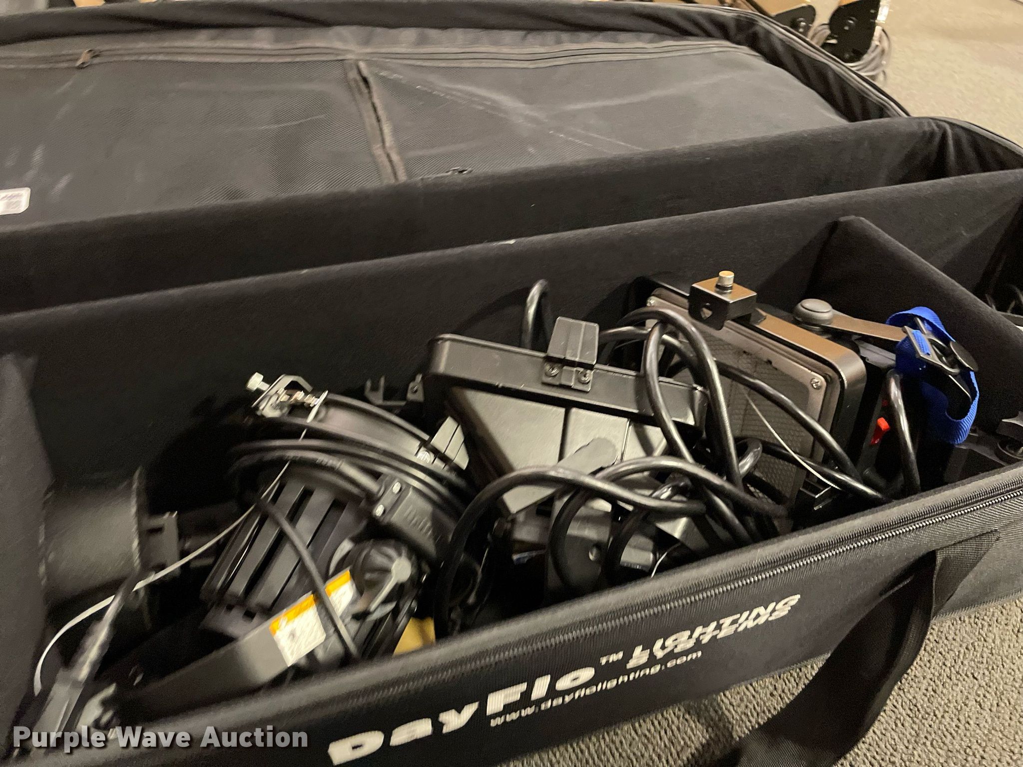 Purple Wave is selling a used Electronics in Kansas. This item is a Lighting with the following: Production lighting, (4) stage floor lights, Kino Flo image light, Light stand, (6) lights, Bags