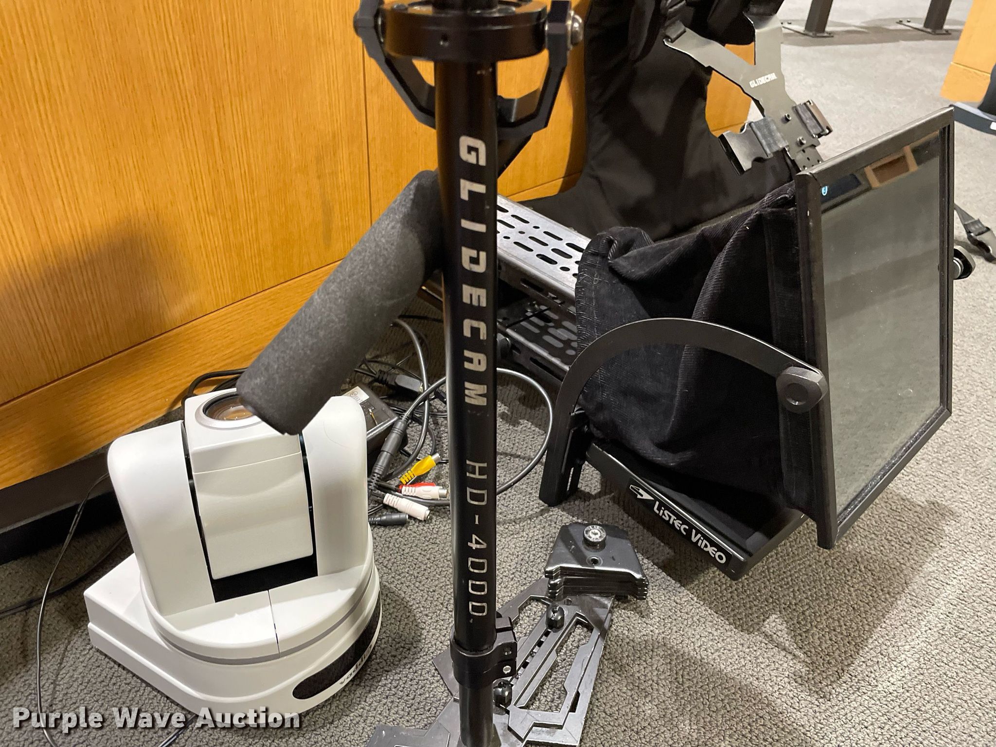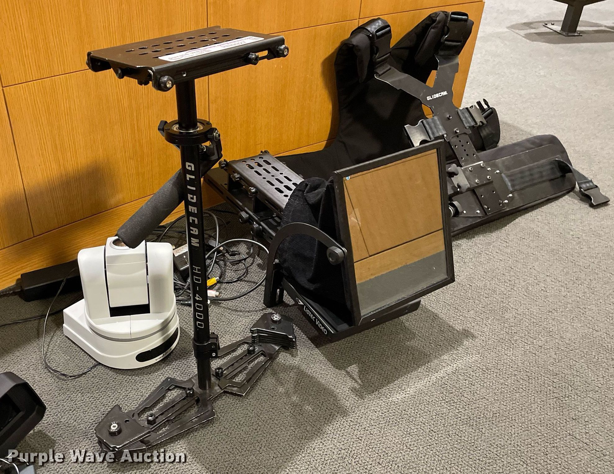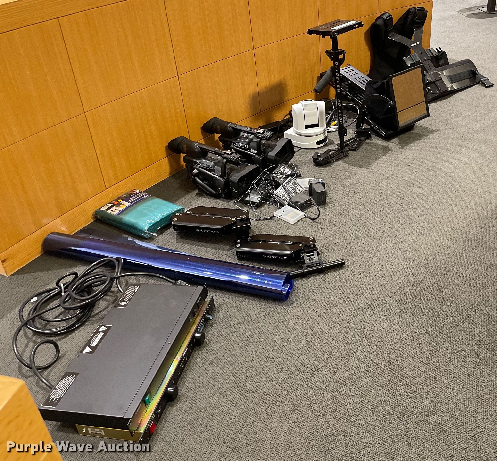Purple Wave is selling a used Electronics in Kansas. This item is a Electronics with the following: Production equipment, Teleprompter, Camera stabilizer with vest, (2) power distributors, Light gels, Green screen, (2) Panasonic DVC Pro cameras, Video remote cameras, Desk top speakers