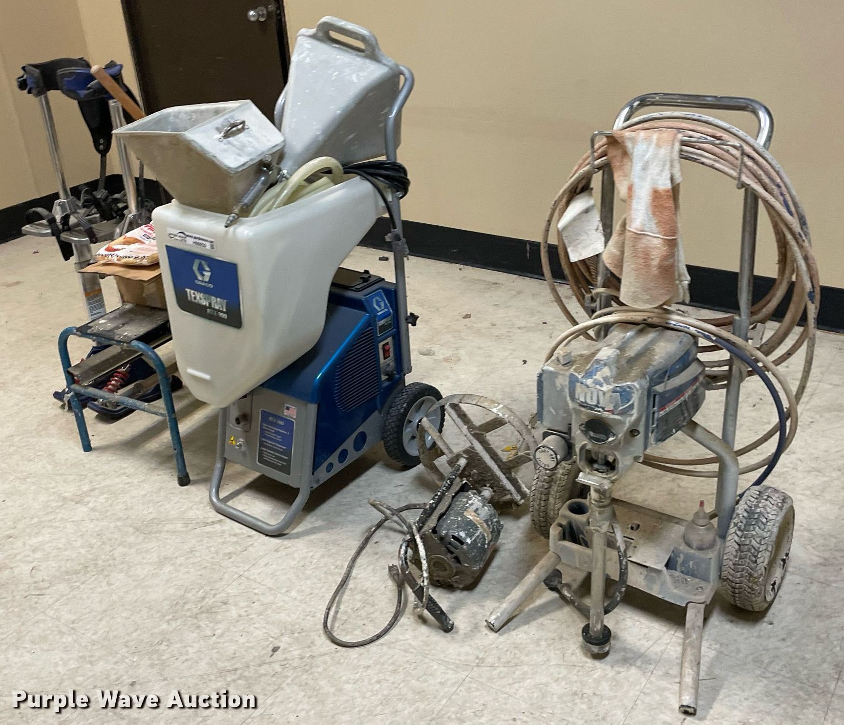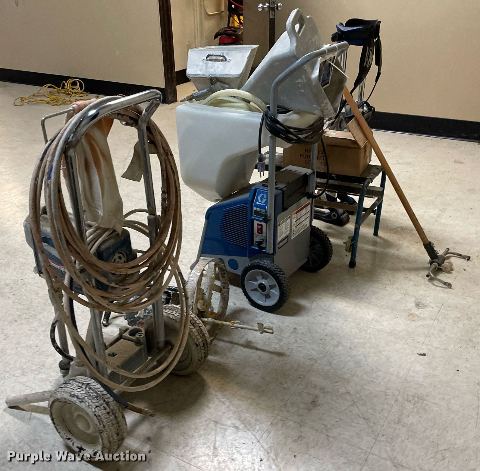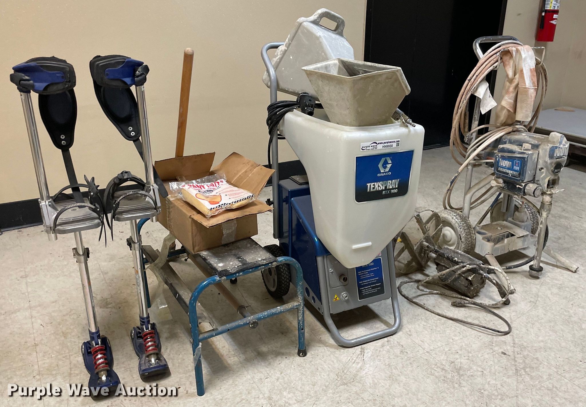 Purple Wave is selling a used Tools in Kansas. This item is a Painting equipment with the following: Graco Texspray RTX900 paint sprayer, Graco Nova smart control paint sprayer, Jetco paint mixer, Paint mitts, Step stool, Marshalltown Skywalker stilts