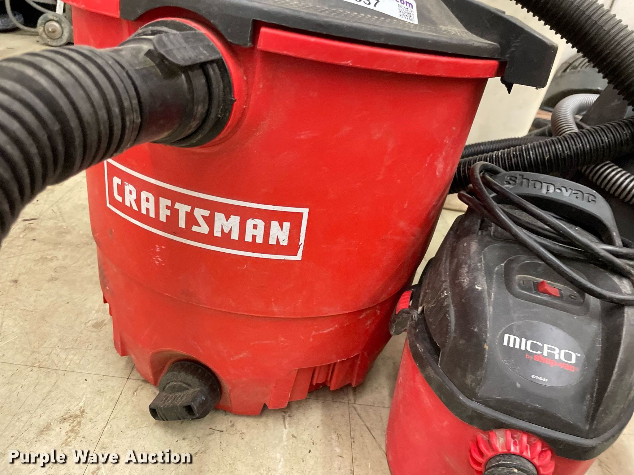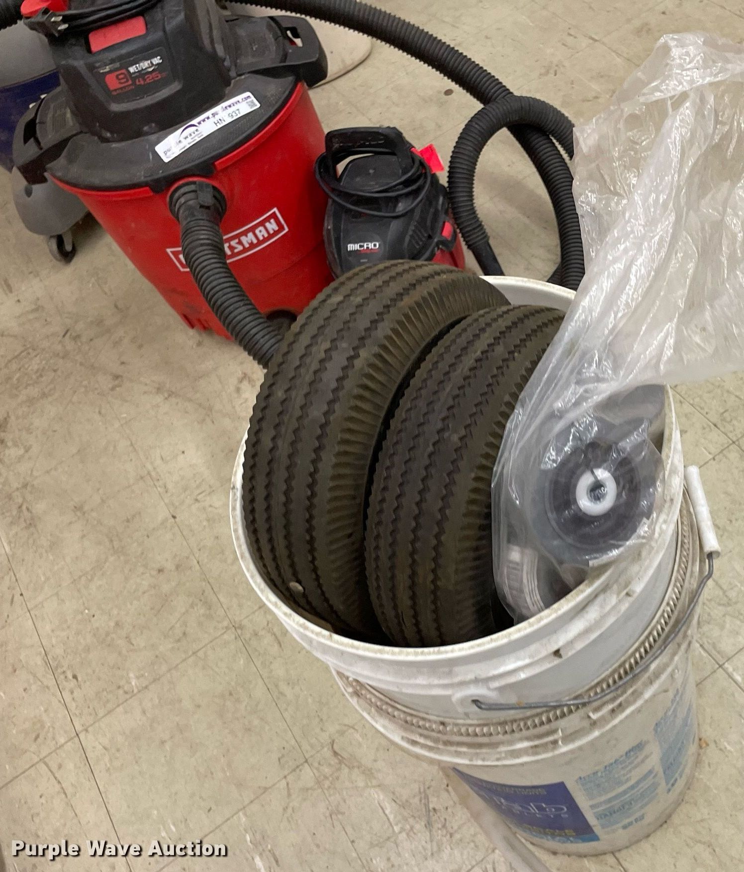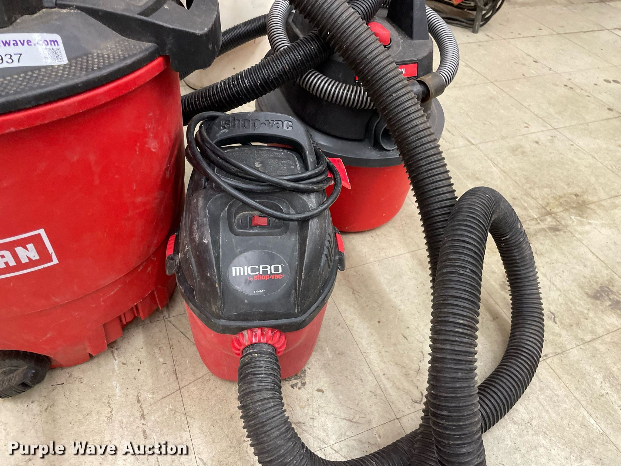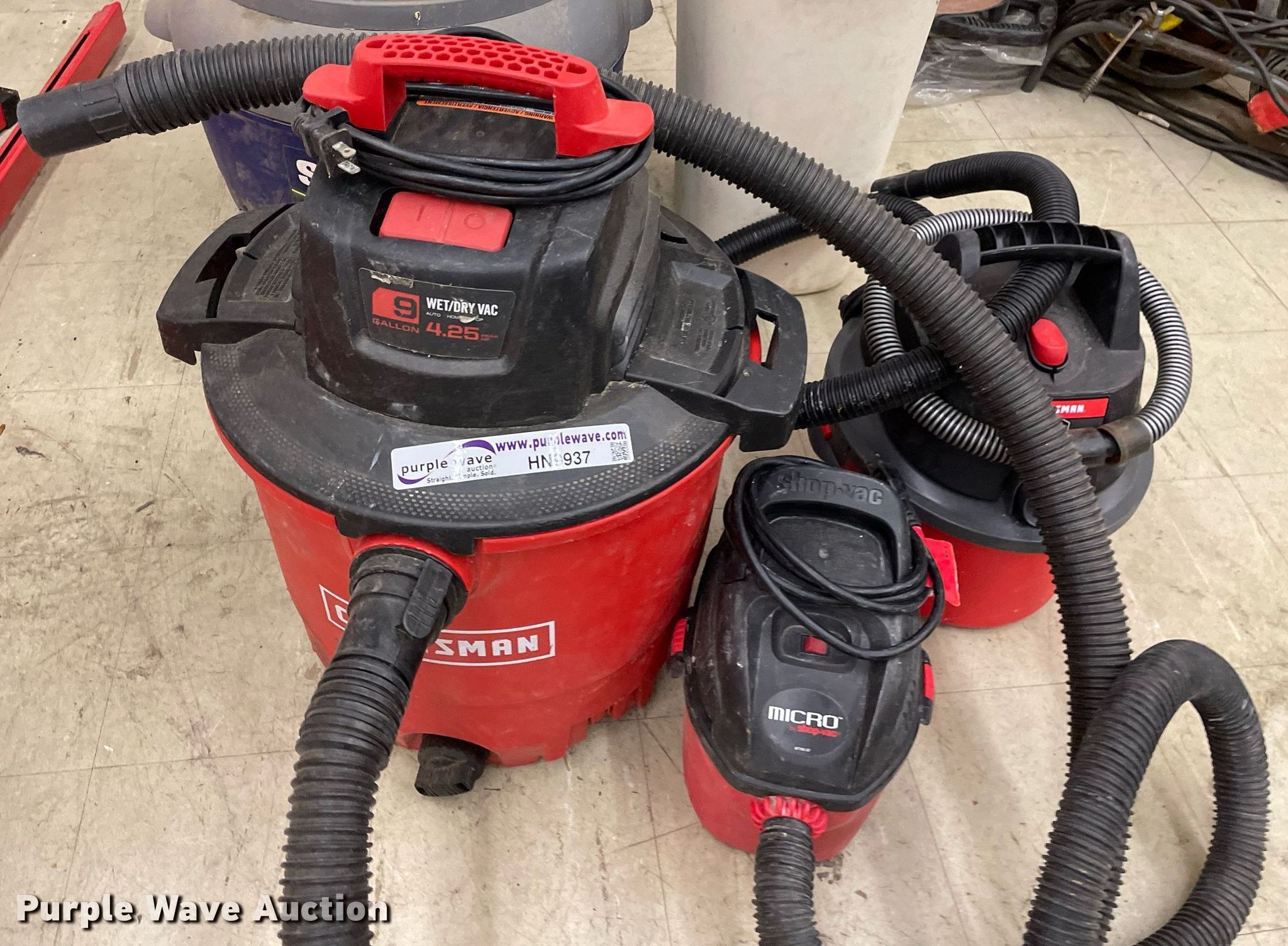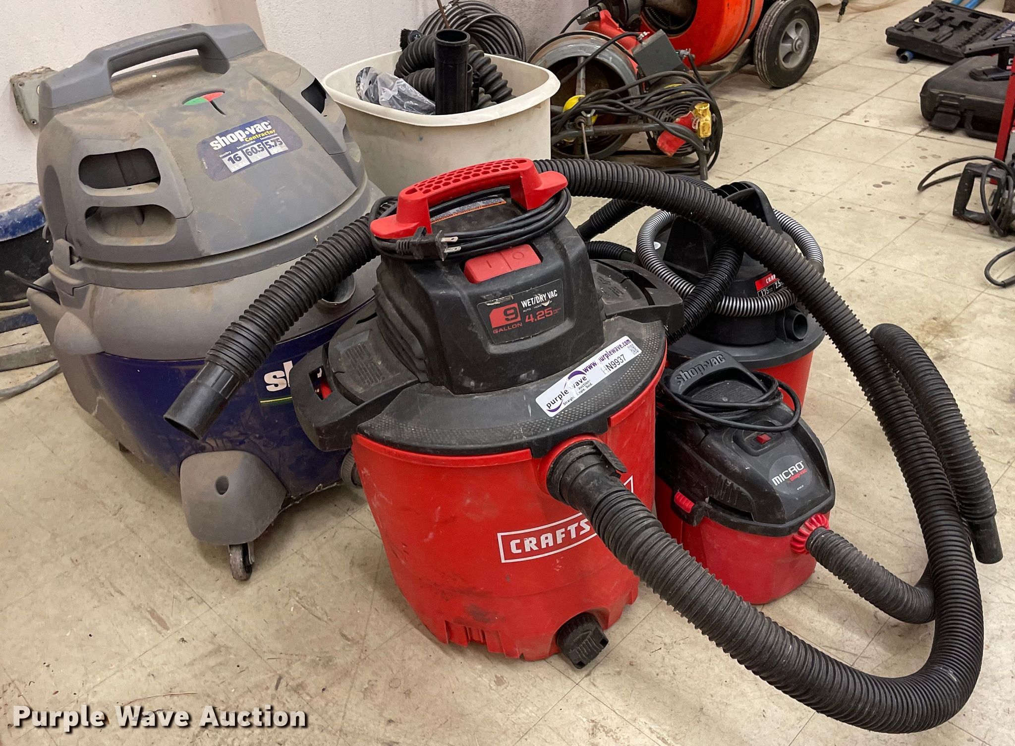 Purple Wave is selling a used Tools in Kansas. This item is a Tools with the following: (4) shop vacuums, Shop-vac, Capacity: 16 gallons, Craftsman, Capacity: 9 gallons, Craftsman, Capacity: 2.5 gallons, Shop-vac micro, Hoses, Parts missing