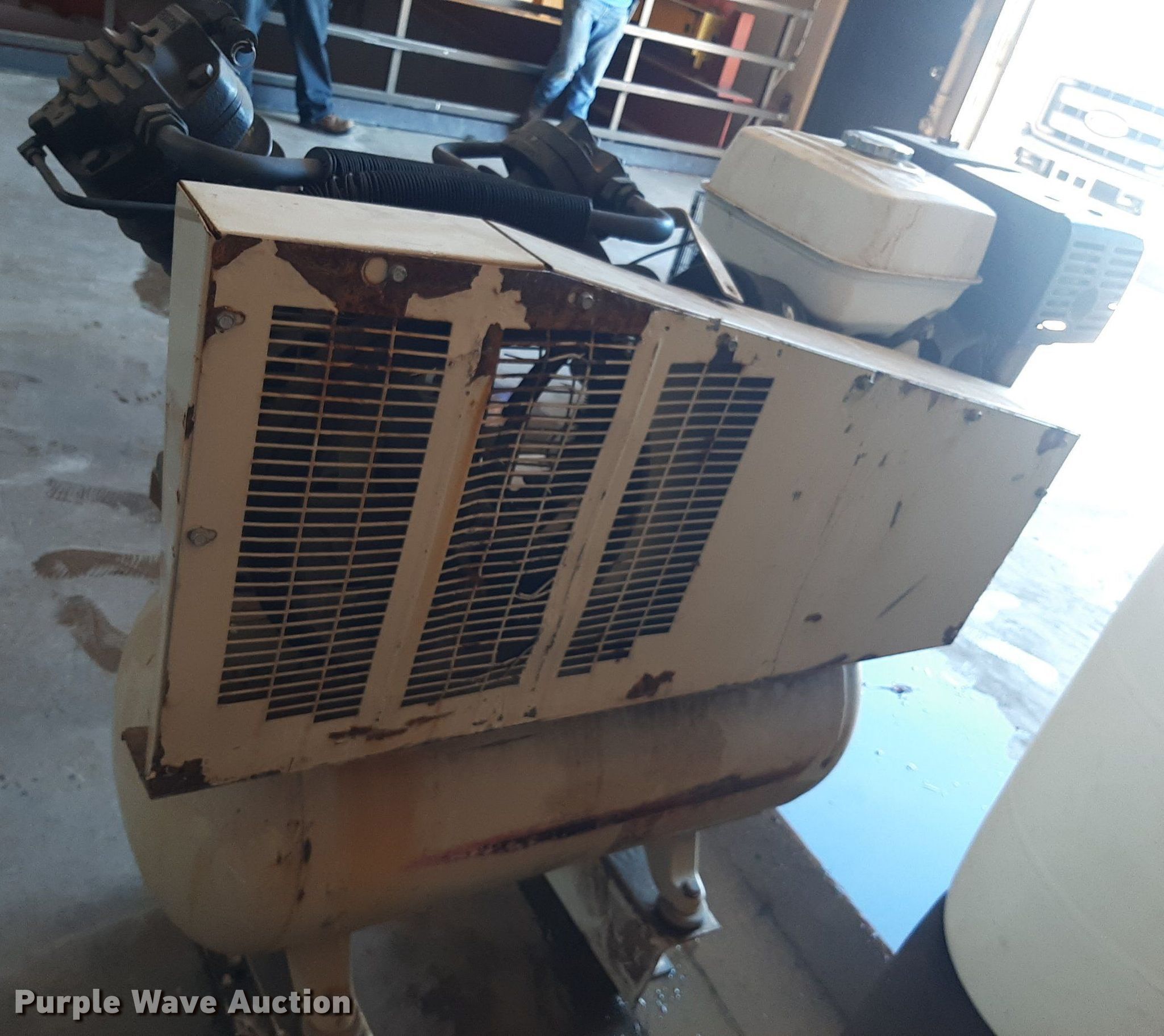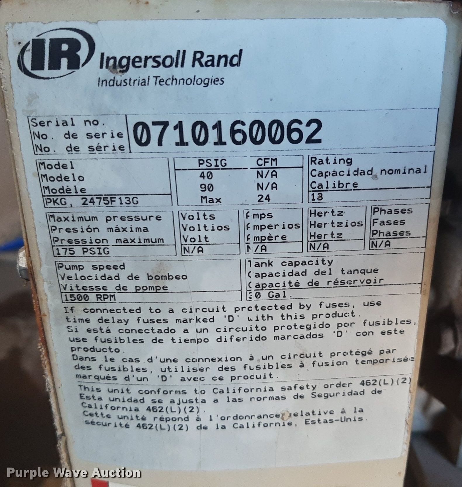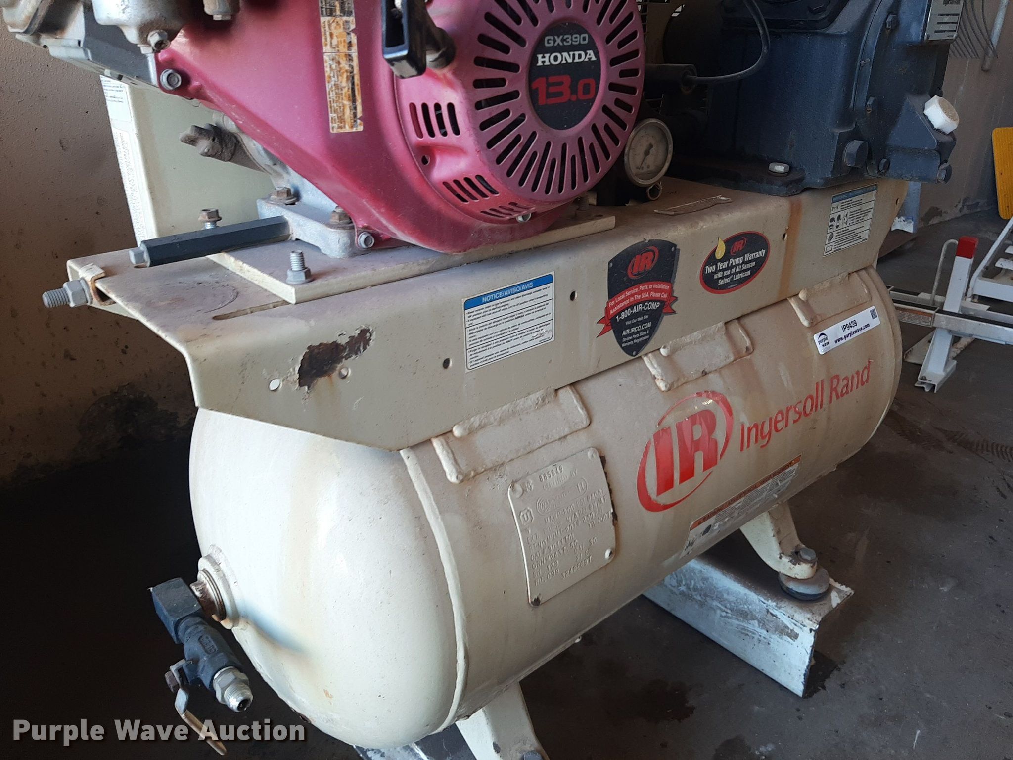 Ingersoll Rand 2475 air compressor. Serial: 7034510. Engine Honda GX390, Cylinders: 1, Fuel type: Gas. Features Air compressor CFM: 24, PSI: 175, Tank capacity: 30 gallons. Notes Non-operational engine, engine seized. City of Wichita Sewage Treatment. 2305 E 57th St S. Wichita, KS 67216