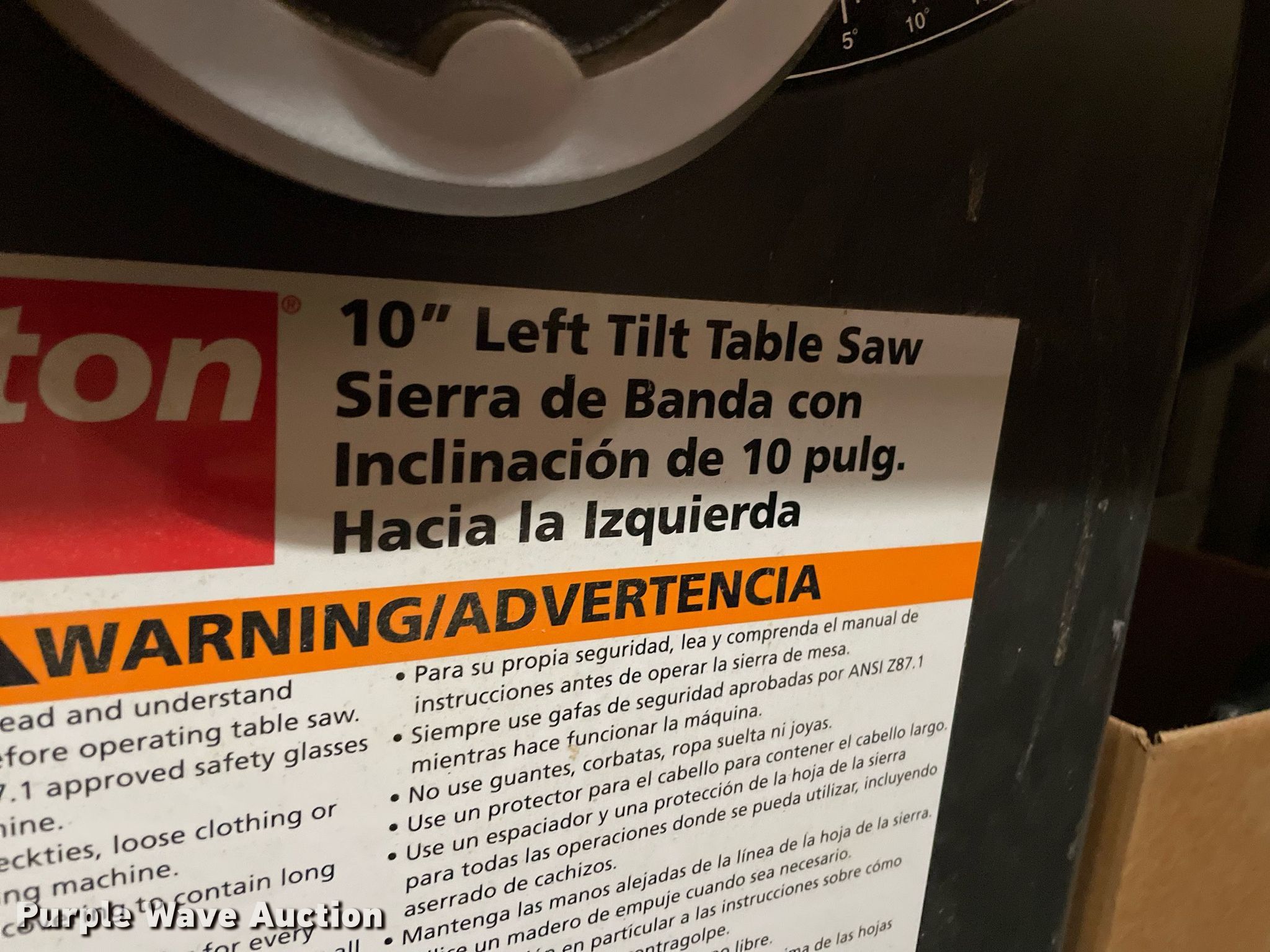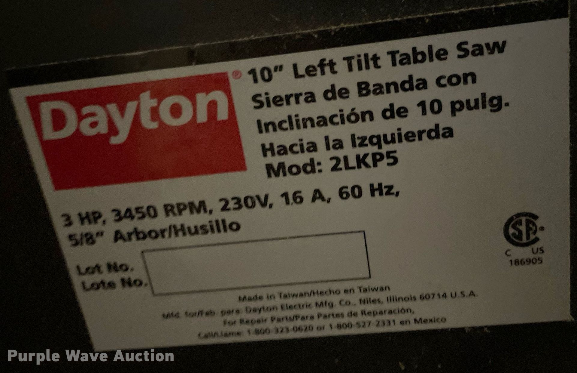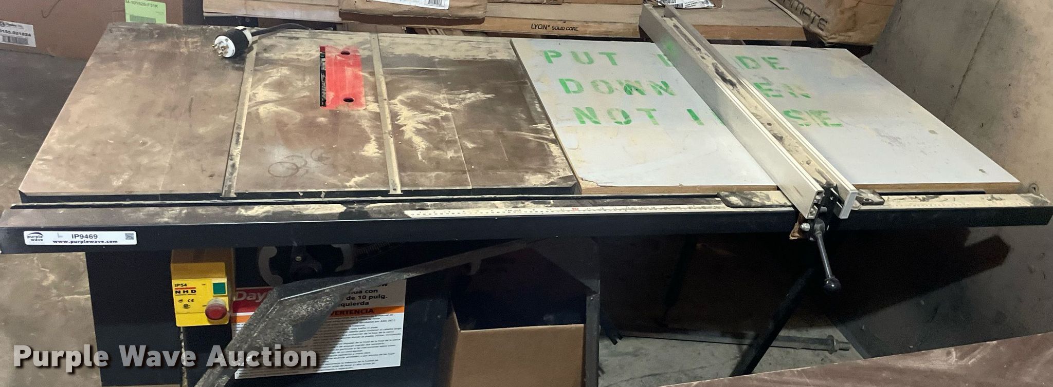 Purple Wave is selling a used Tools in Kansas. This item is a Dayton table saw with the following: Blade diameter: 10", Volts: 250, Table: 27" x 36", Extension: 27" x 40"