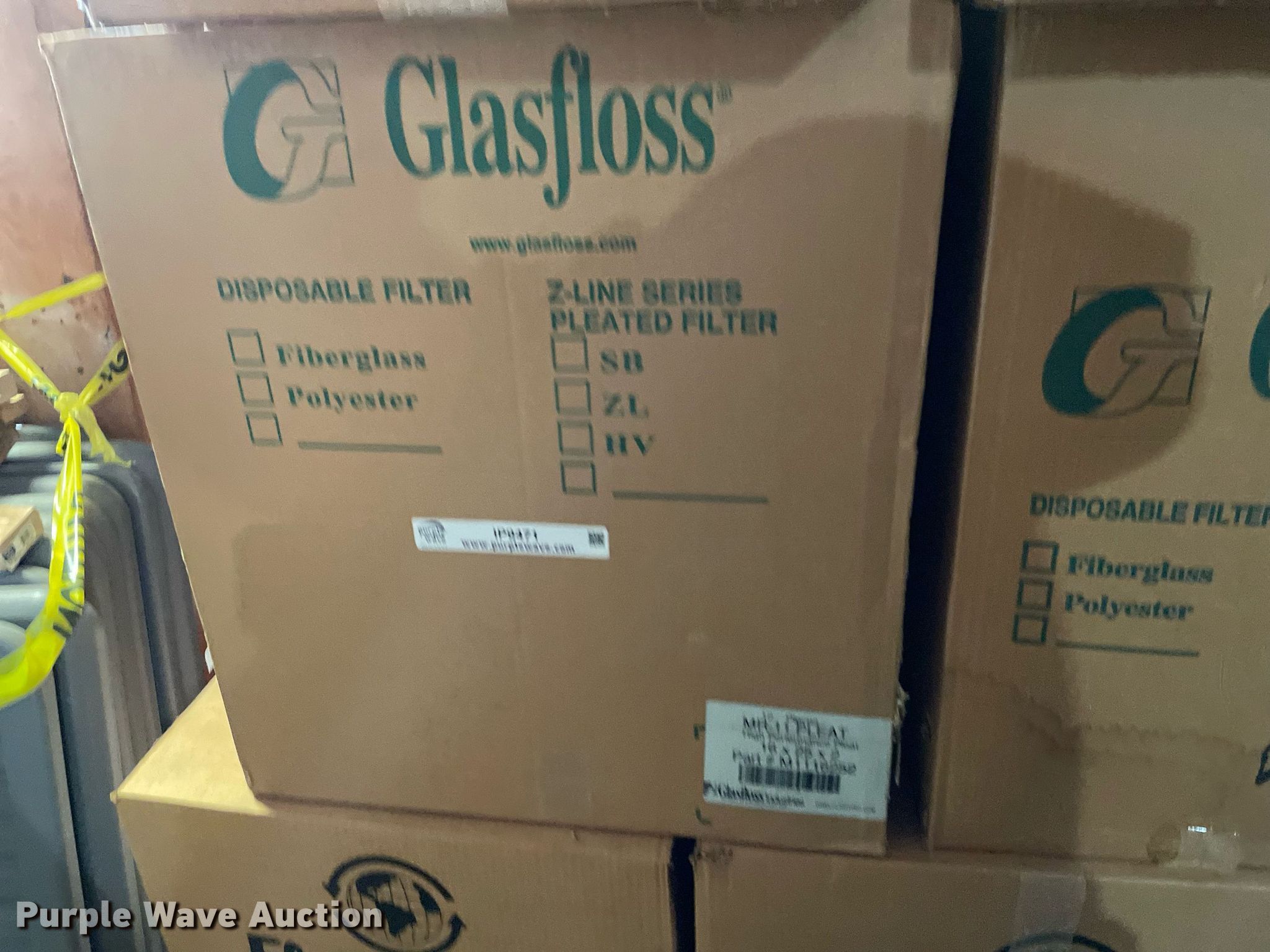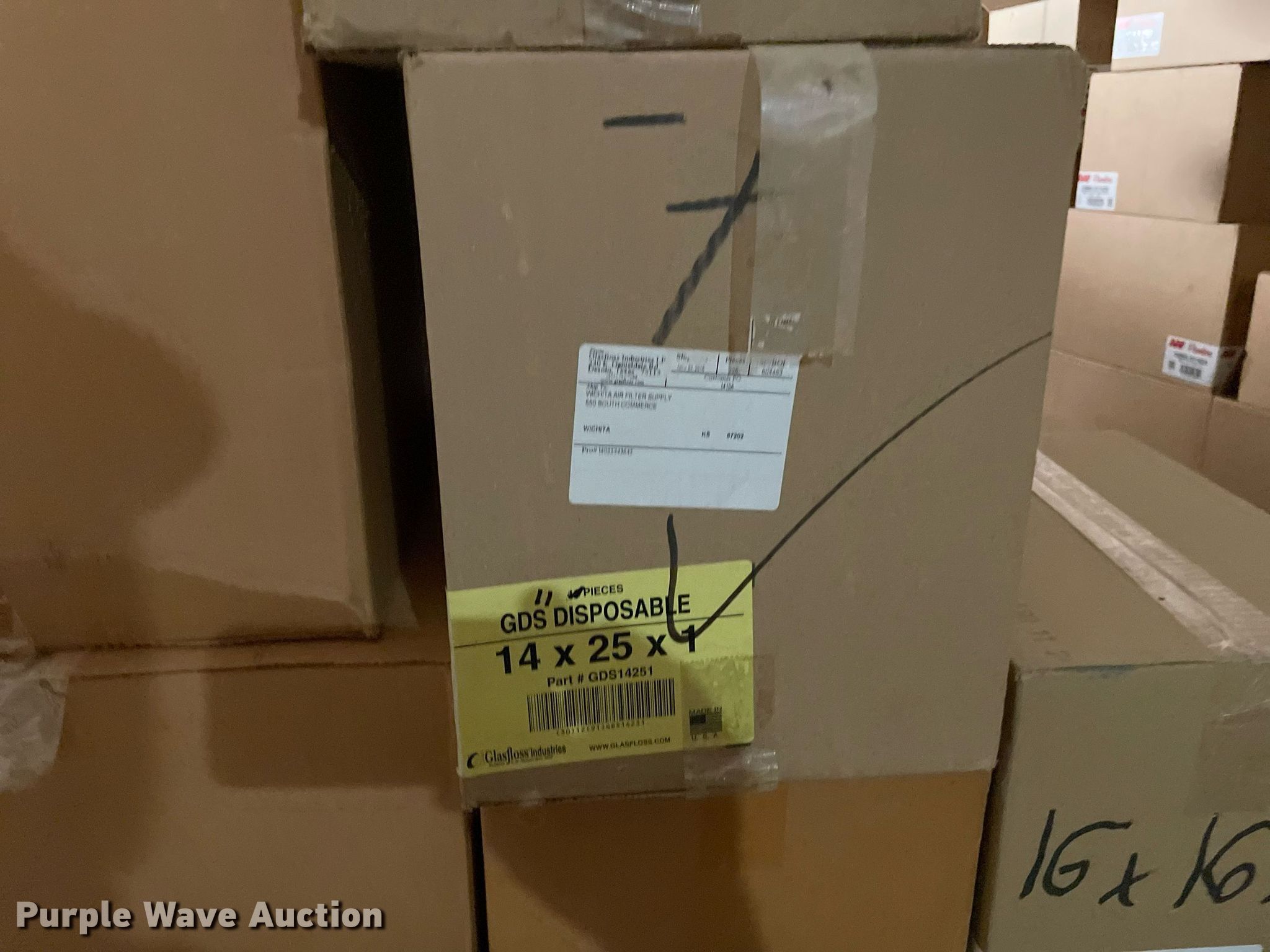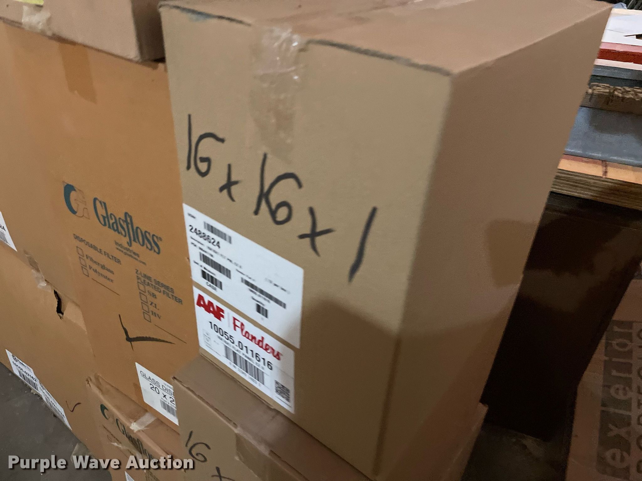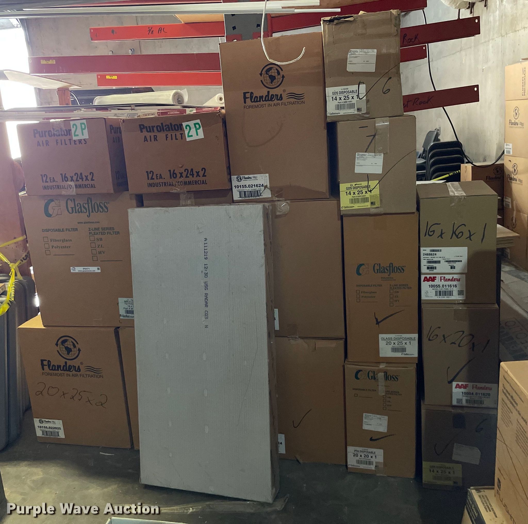 Purple Wave is selling a used Building Materials in Kansas. This item is a Building materials with the following: (16) boxes of air filters, Box of ceiling tile