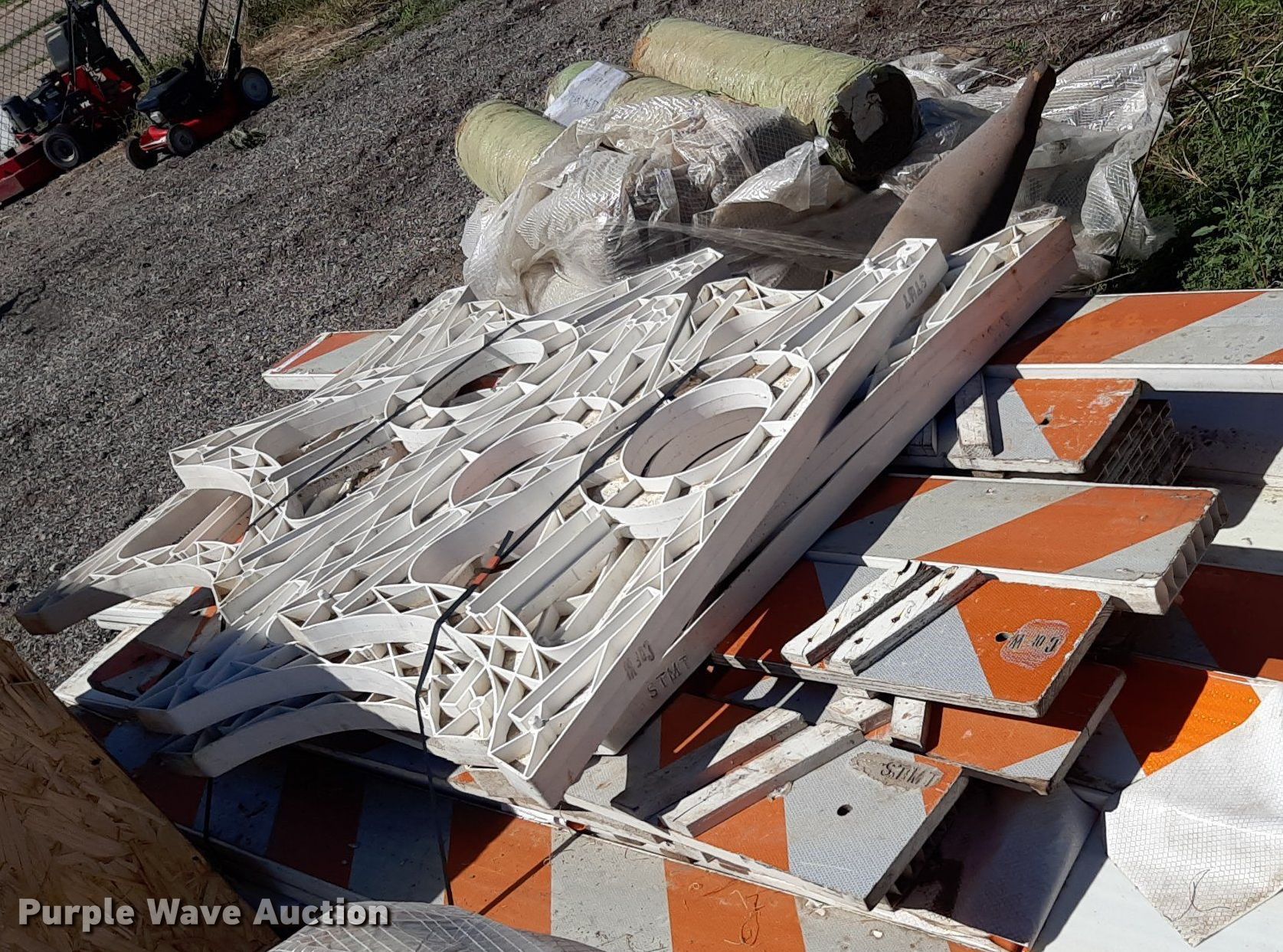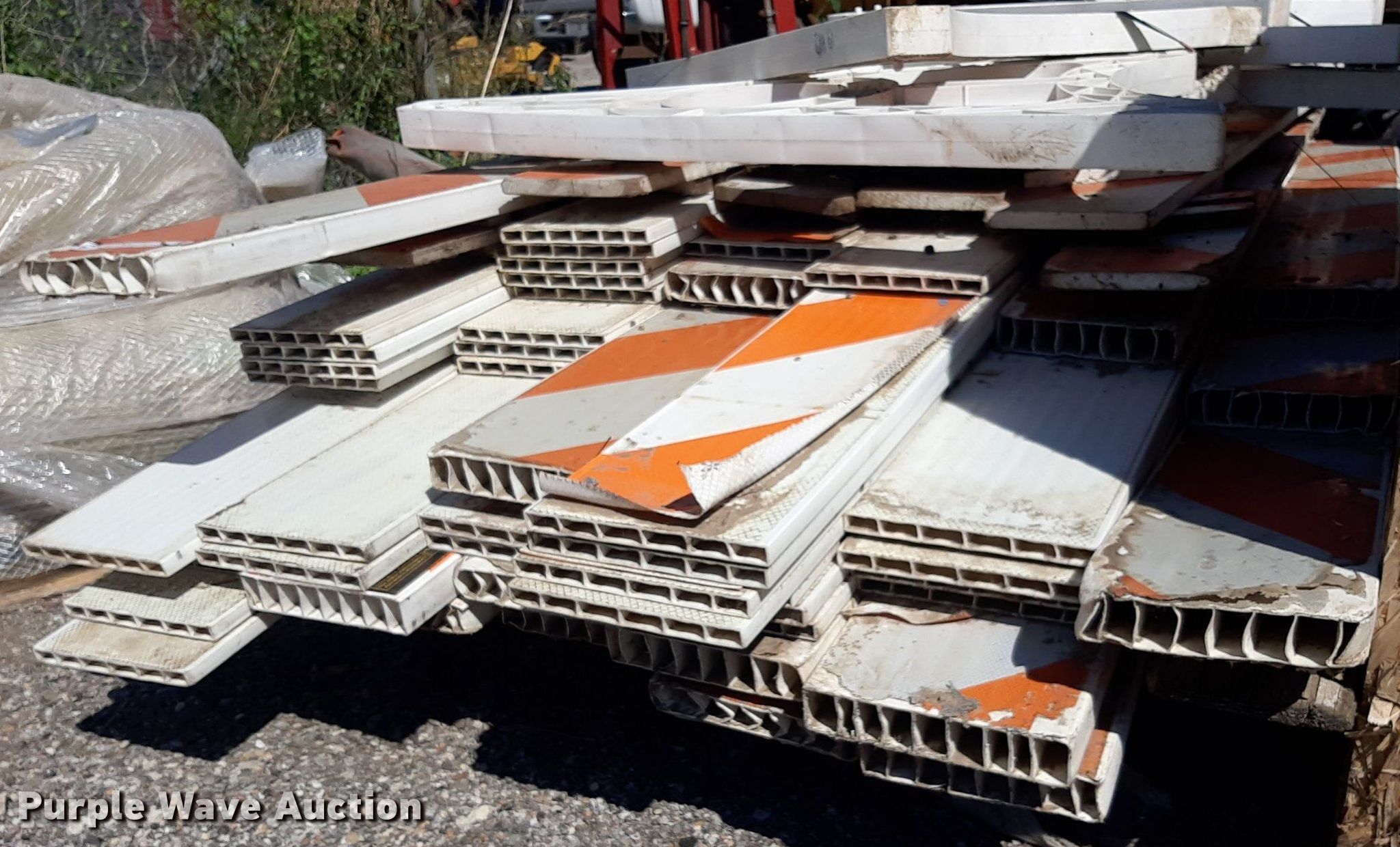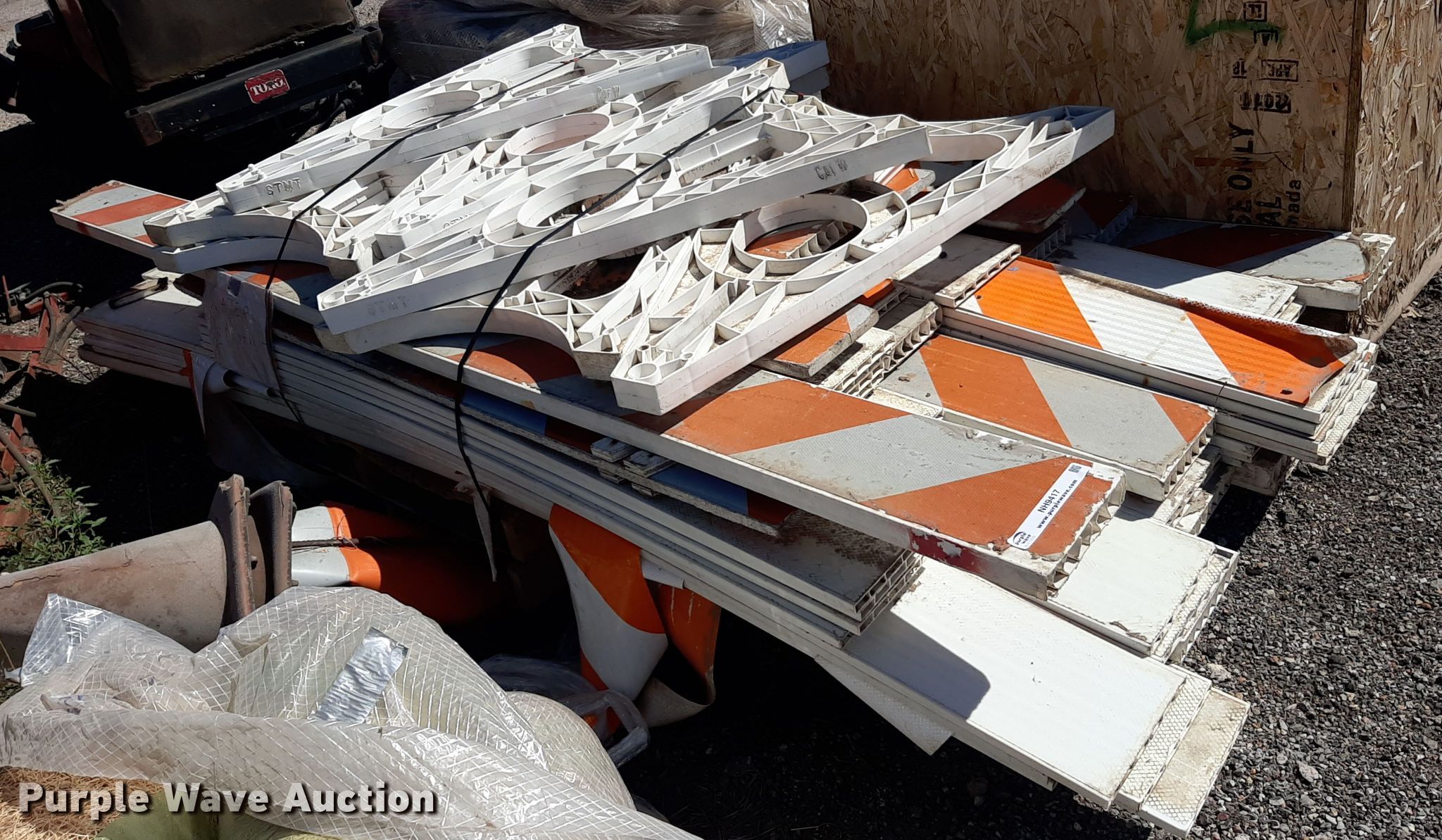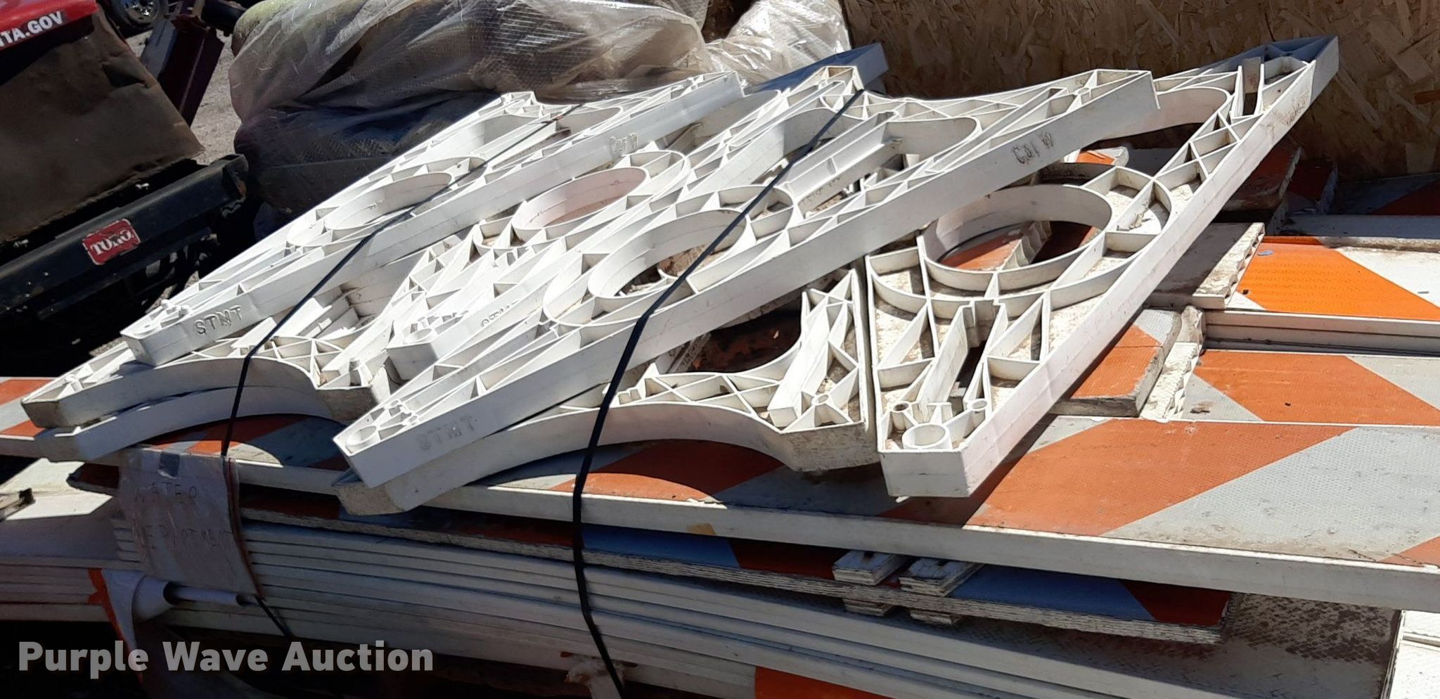 Purple Wave is selling a used Road Safety Equip. in Kansas. This item is a Road barricades with the following: Approx. 64 barricade cross beams, Length: 4' to 10', (3) pairs of barricade legs