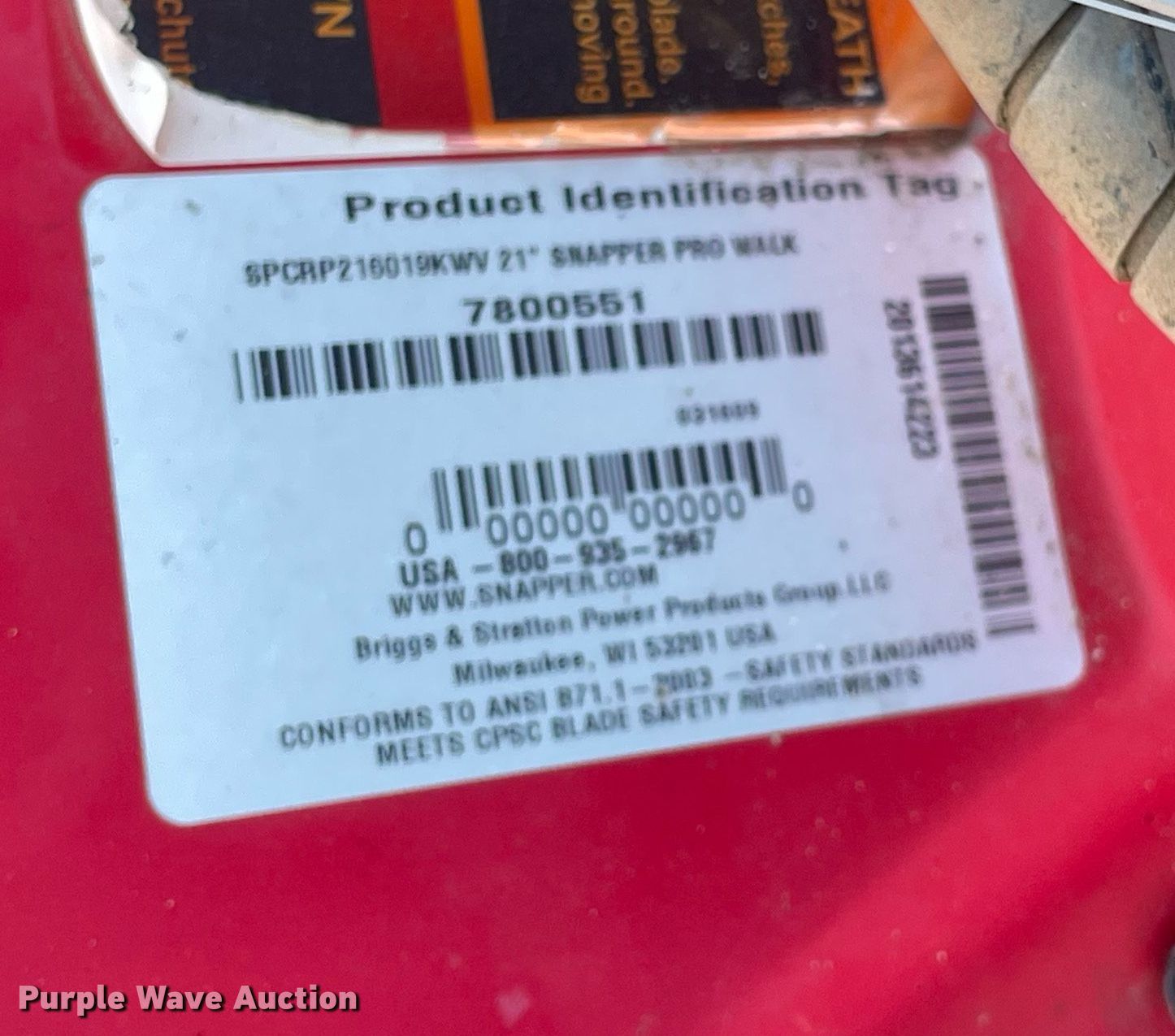 Purple Wave is selling a used Lawn Mower in Kansas. This item is a Snapper Pro Walk lawn mower with the following: Cutting width: 21", Serial: 7800551