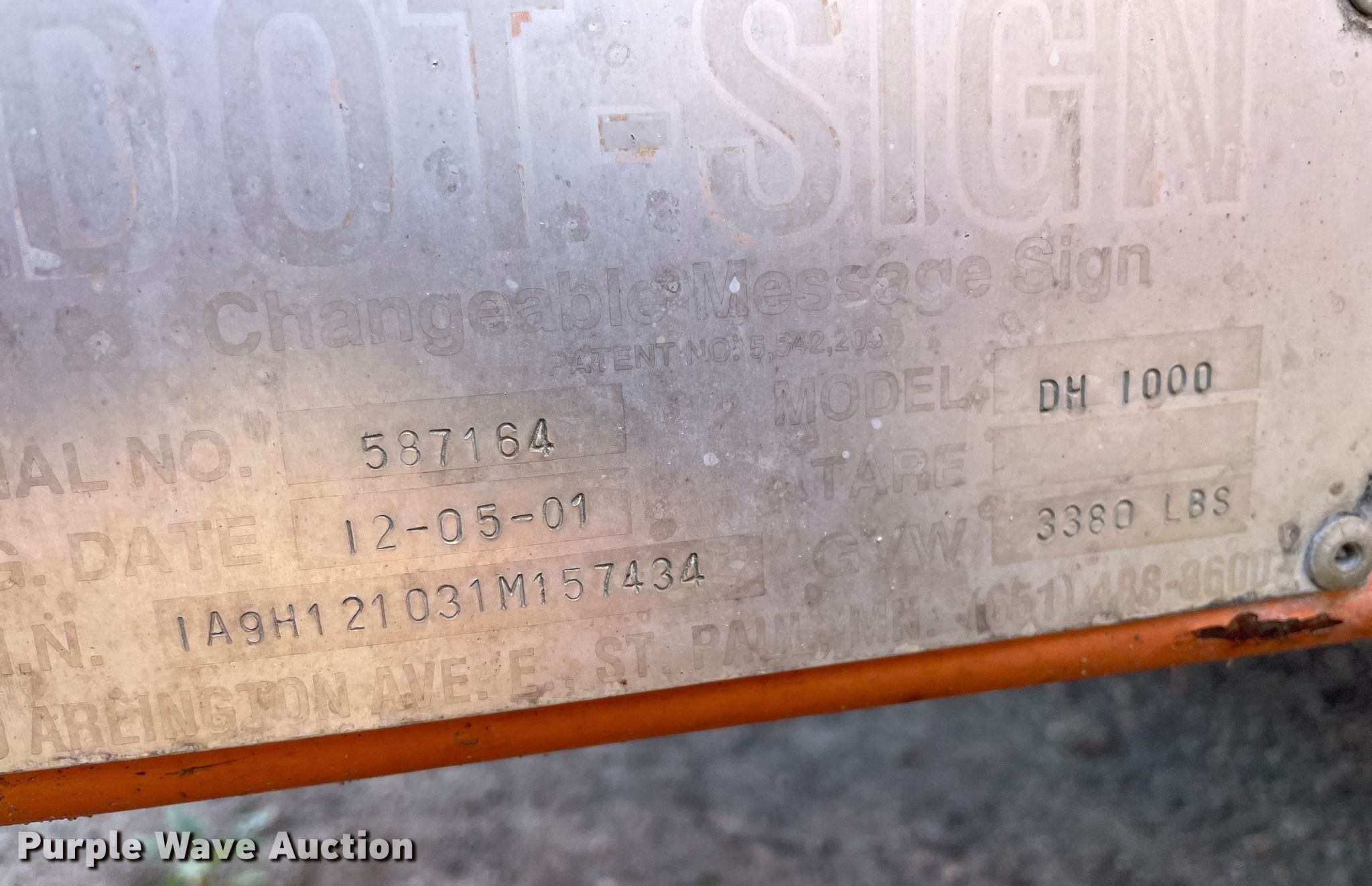 2001 Dot-Sign DH1000 Arrow board trailer. VIN: IA9H121031M157434, Serial: 587164. Dimensions Overall: 15' 6" L x 82" W. Features Deck type: Steel, Display 9'5"L x 6'4"H. Chassis Hitch: Pintle, Landing gear: Single, Brakes: Electric, GVWR: 3,380 lbs. Tires Steel wheels, Size: 225/75R15. Notes Electrical issues, Non-operational unit. Transfer of ownership documentation will be a bill of sale. City of Wichita Central Maintenance Facility - Open inspection Sept. 13, 16. 1801 S. McLean. Wichita, KS 67213
