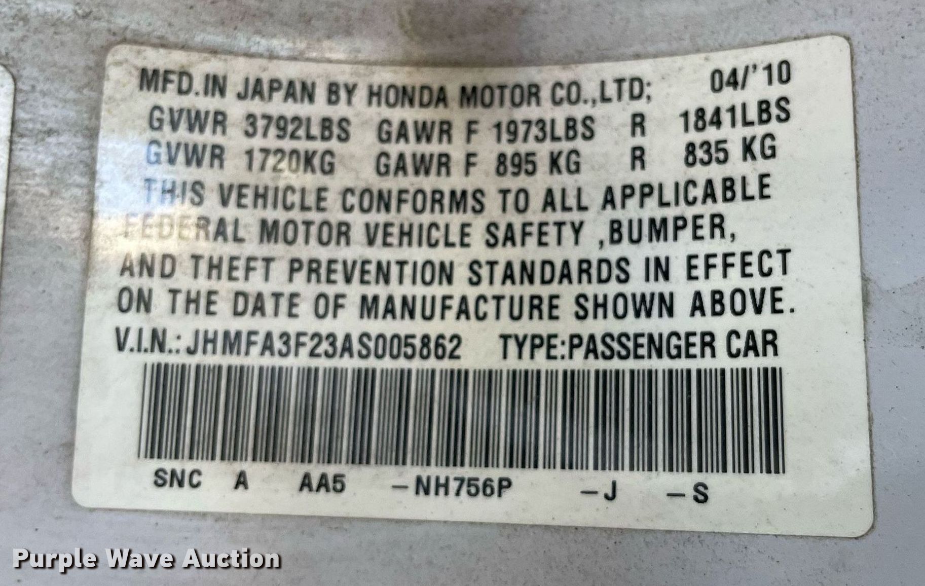 - VIN: JHMFA3F23AS005862