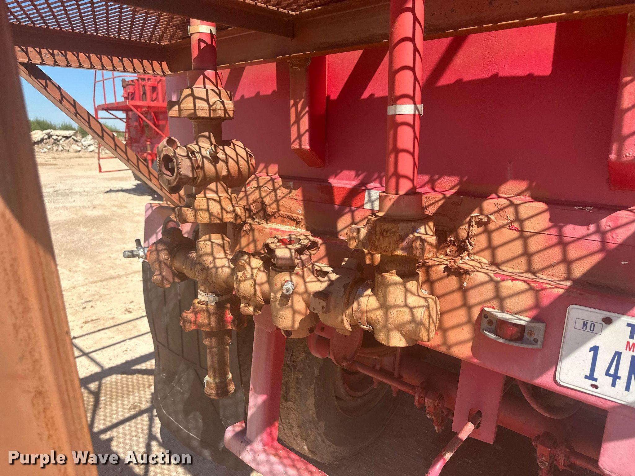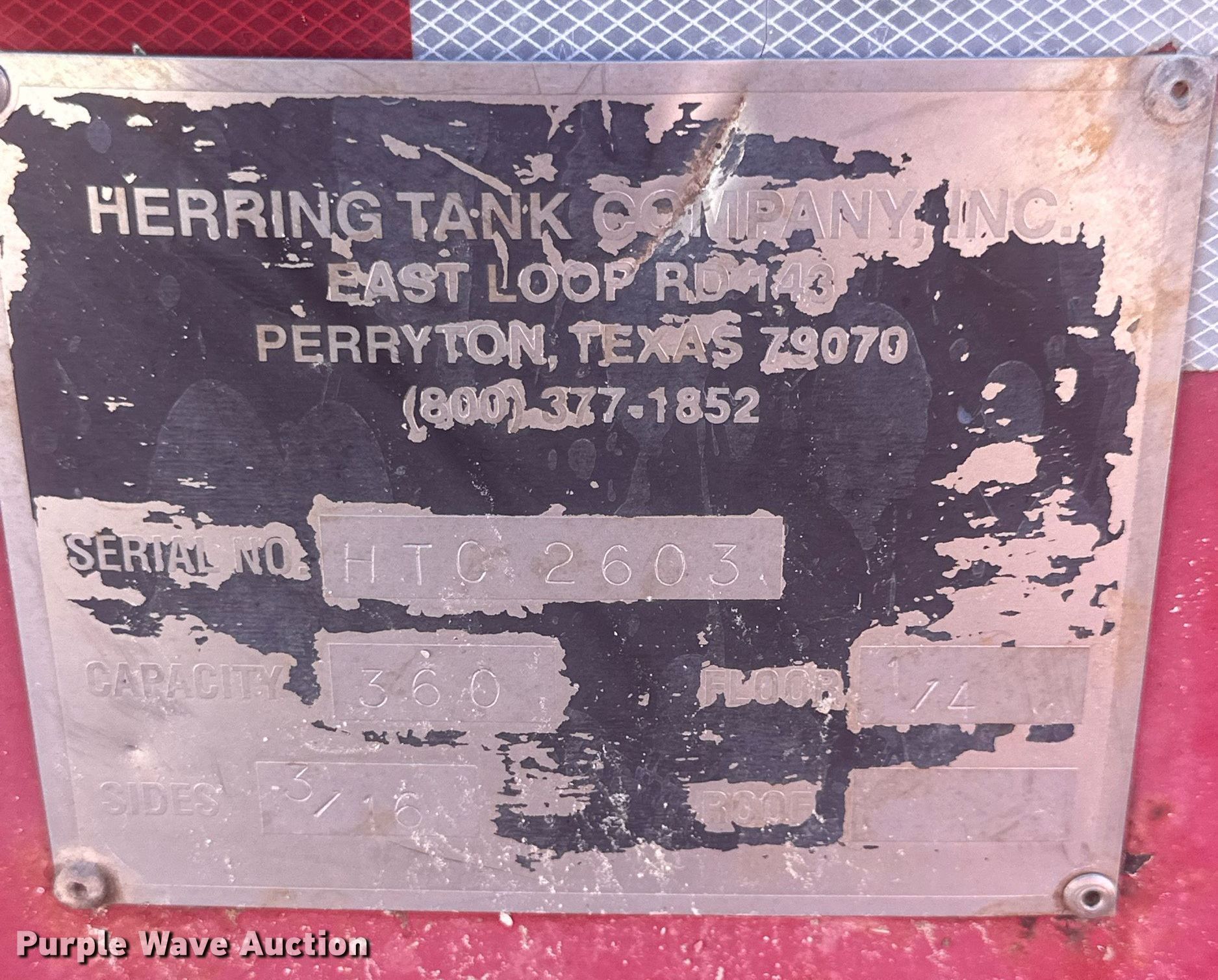 2005 Herring frac tank trailer. VIN: HTC2603. Dimensions Overall: 48' L x 101" W. Features Tank type: Steel Capacity: 360 BBL, Outlet valves: 3 Size: 4", No. of manways/manholes: 3 Width: 20". Chassis Suspension: Spring, Brakes: Air. Tires Steel wheels, Size: 11R22.5. Oklahoma title. Title distribution may be delayed up to 30 days from verification of funds. Evergreen Land and Cattle LLC. Shattuck, OK 73858