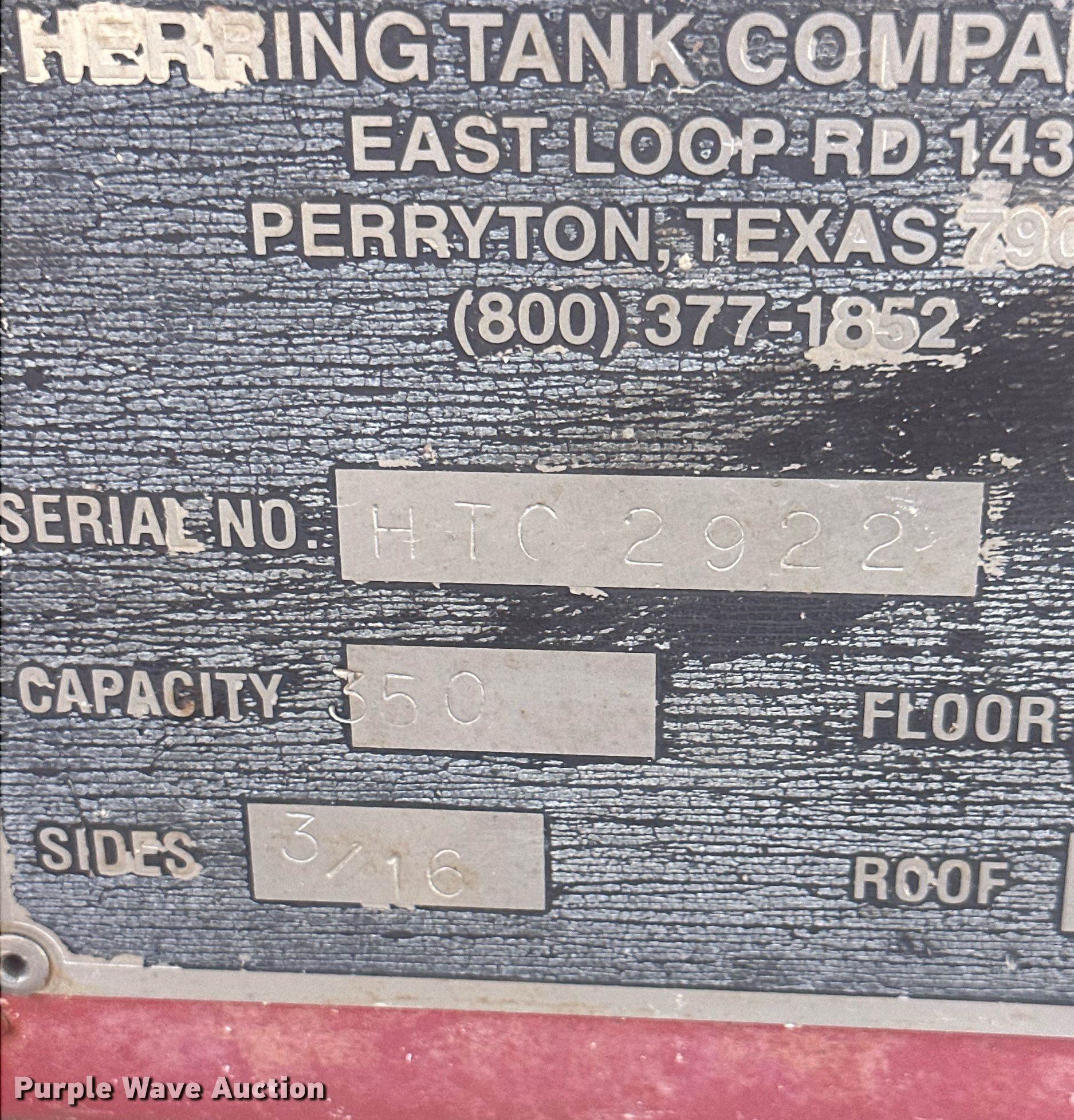 2006 Herring frac tank trailer. VIN: HTC2922. Dimensions Overall: 48' L x 102" W. Features Tank type: Steel Capacity: 350 BBL, Thickness: 3.16". Chassis Suspension: Spring, Brakes: Air. Tires Steel wheels, Size: 11R22.5. Oklahoma title. Title distribution may be delayed up to 30 days from verification of funds. Evergreen Land and Cattle LLC. Shattuck, OK 73858