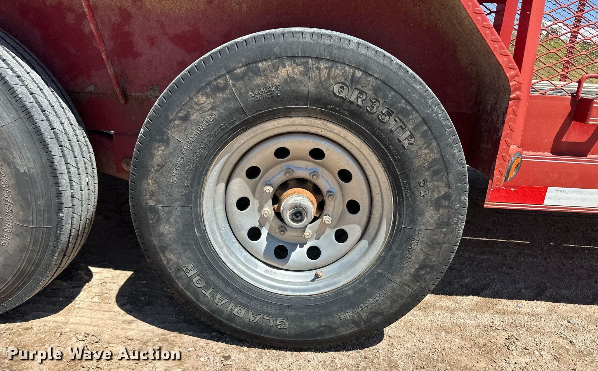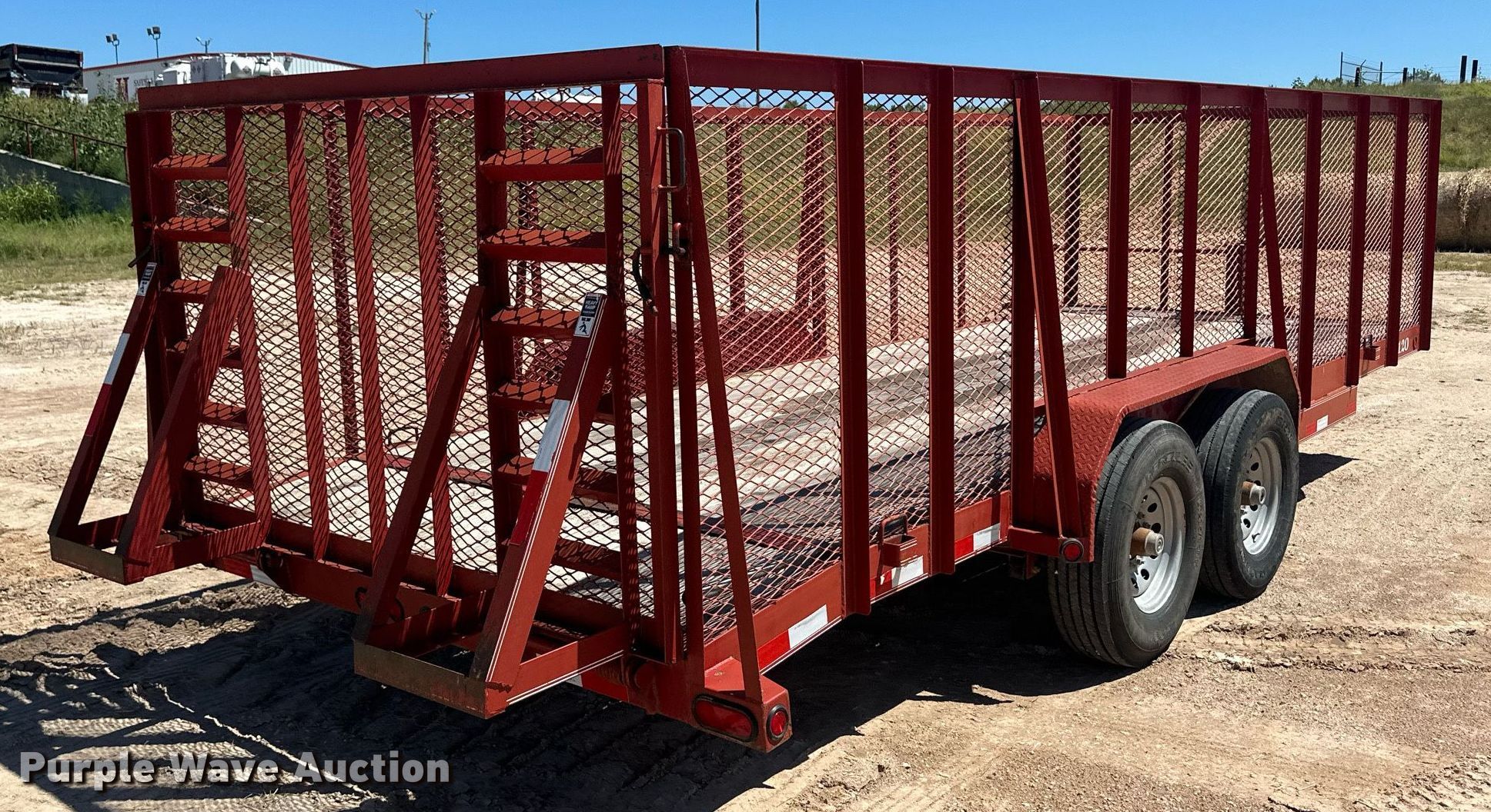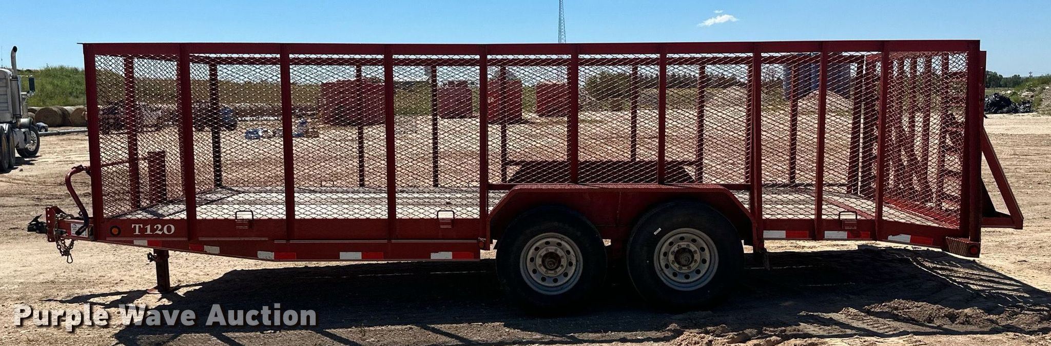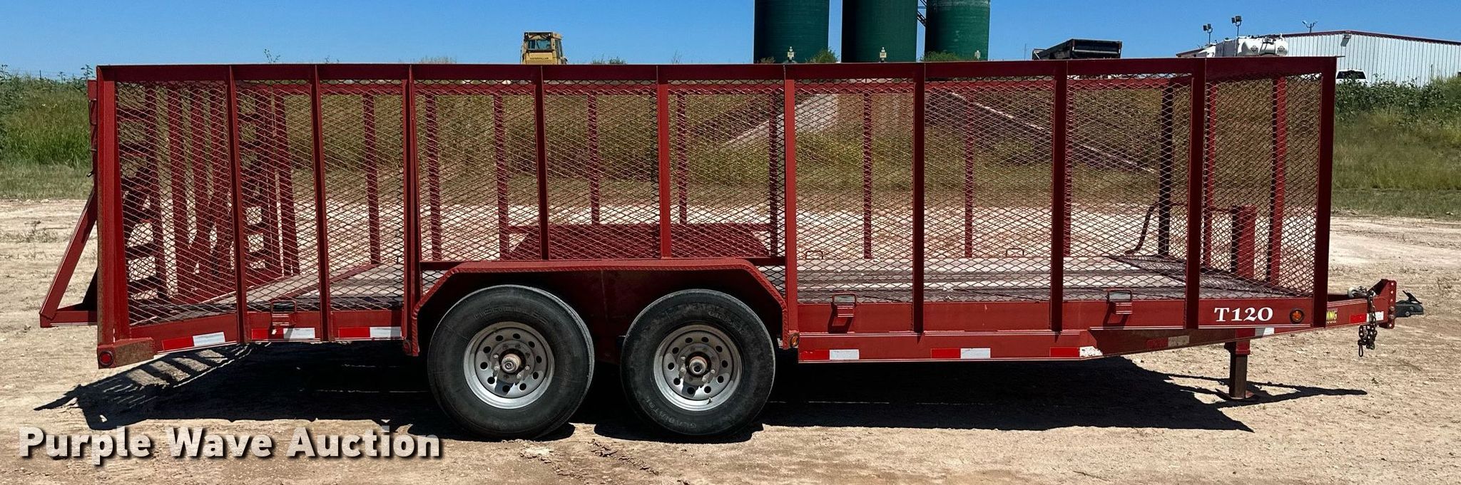 2014 Maxey utility trailer. VIN: 55DUT202XEM002729, Unit #: T120. Dimensions Overall: 24' L x 101" W, Deck: 20' L x 84" W, Side height: 48", Deck height: 28", Tail length: 24", Ramps: Manual Length: 51". Features Deck type: Wood. Chassis Ball hitch: 2 5/16", Landing gear: Single, Suspension: Spring, Brakes: Electric, Axles: Tandem, GVWR: 14,000 lbs, GAWR: 7,000 lbs. Tires Steel wheels, Size: LT235/85R16. Oklahoma title. Title distribution may be delayed up to 30 days from verification of funds. Evergreen Land and Cattle LLC. Shattuck, OK 73858