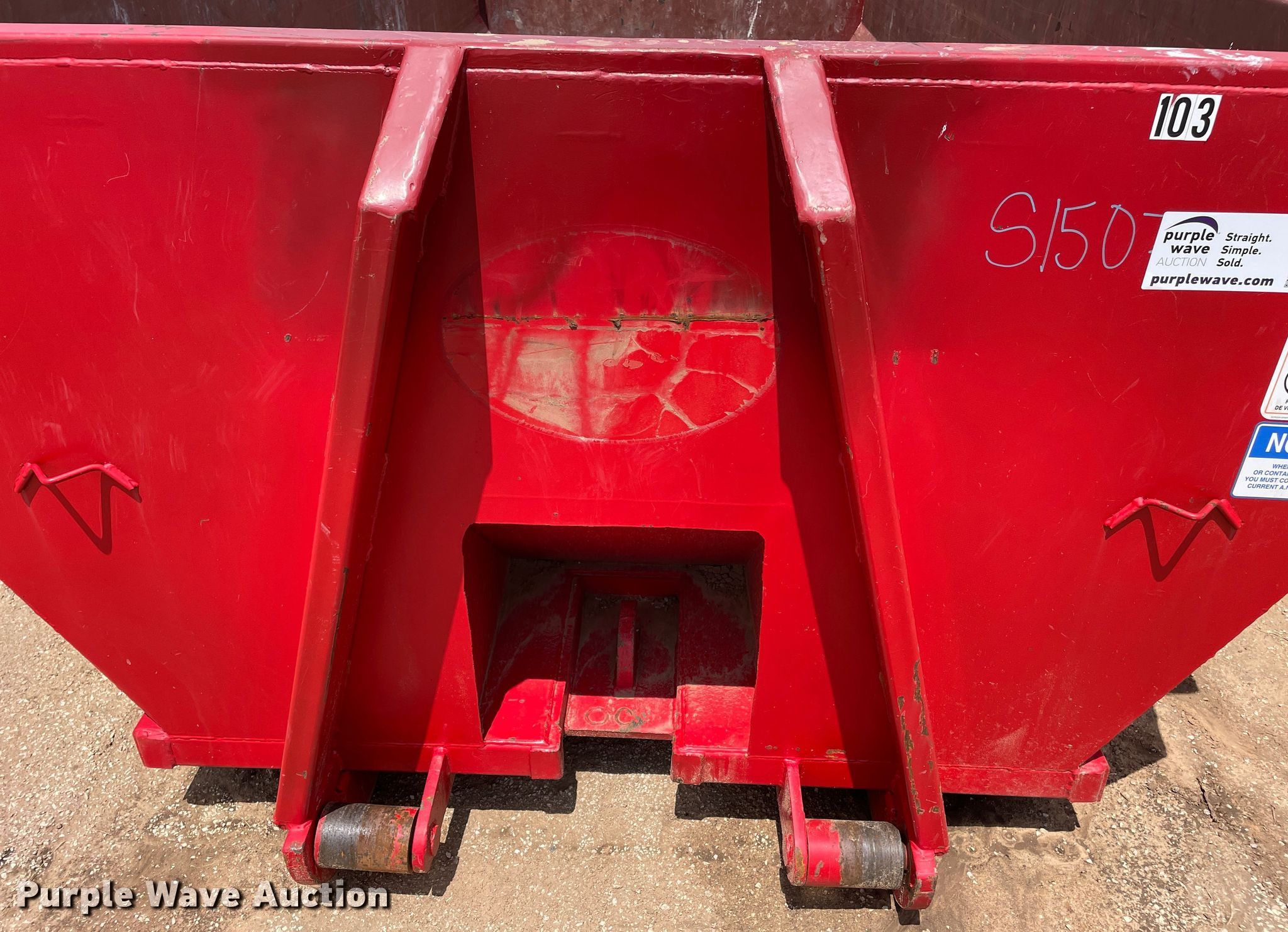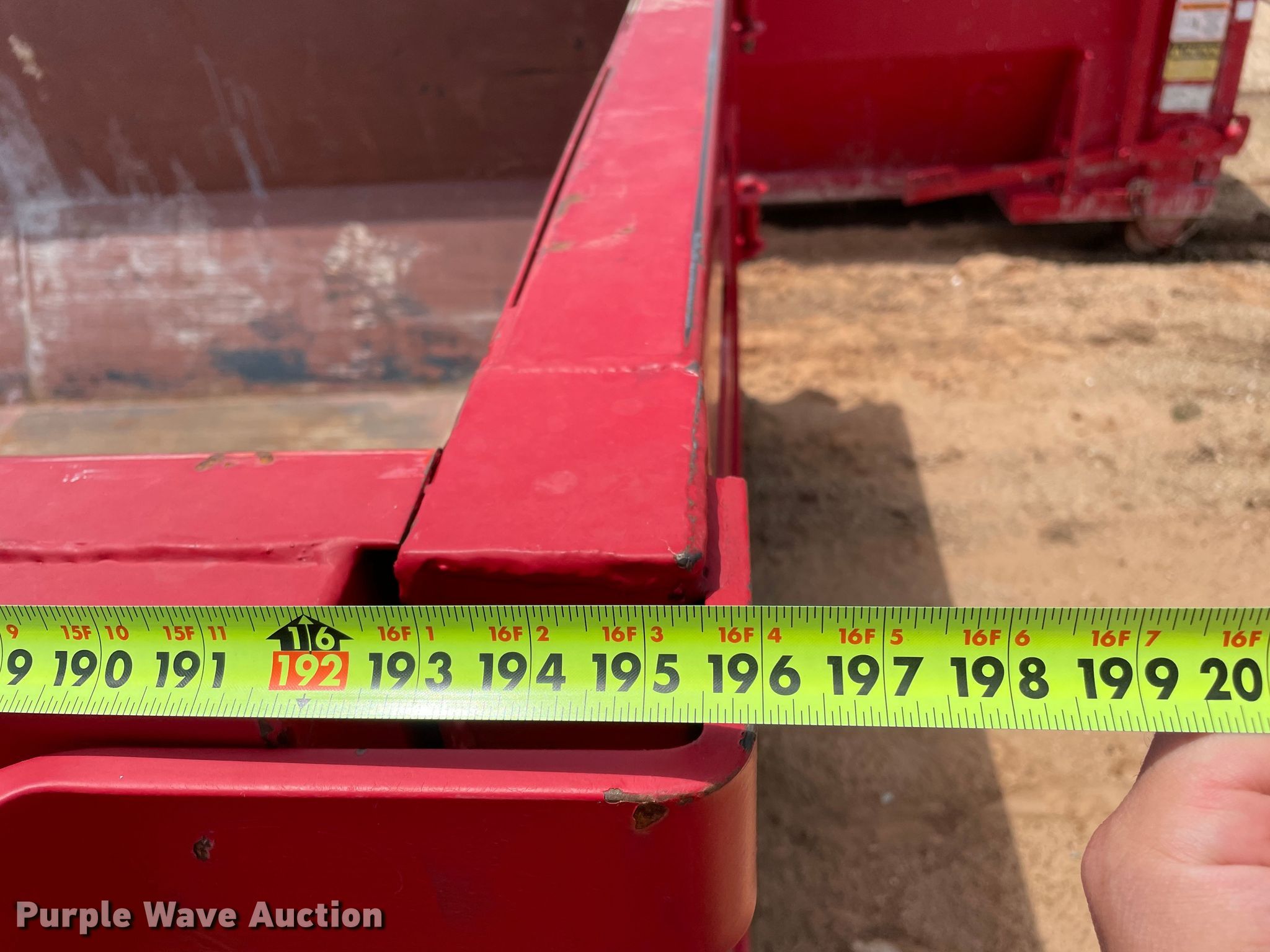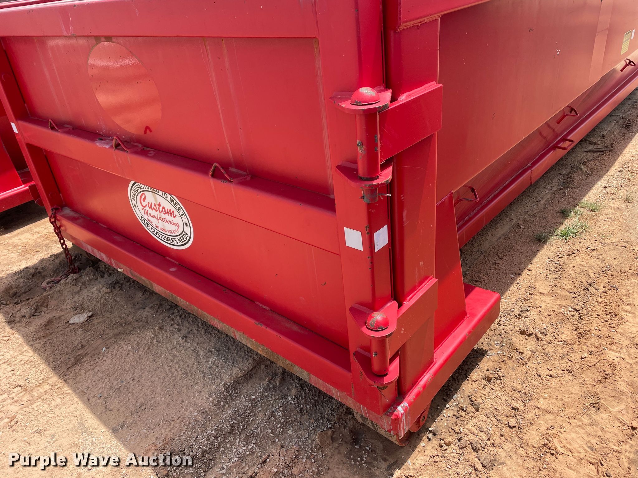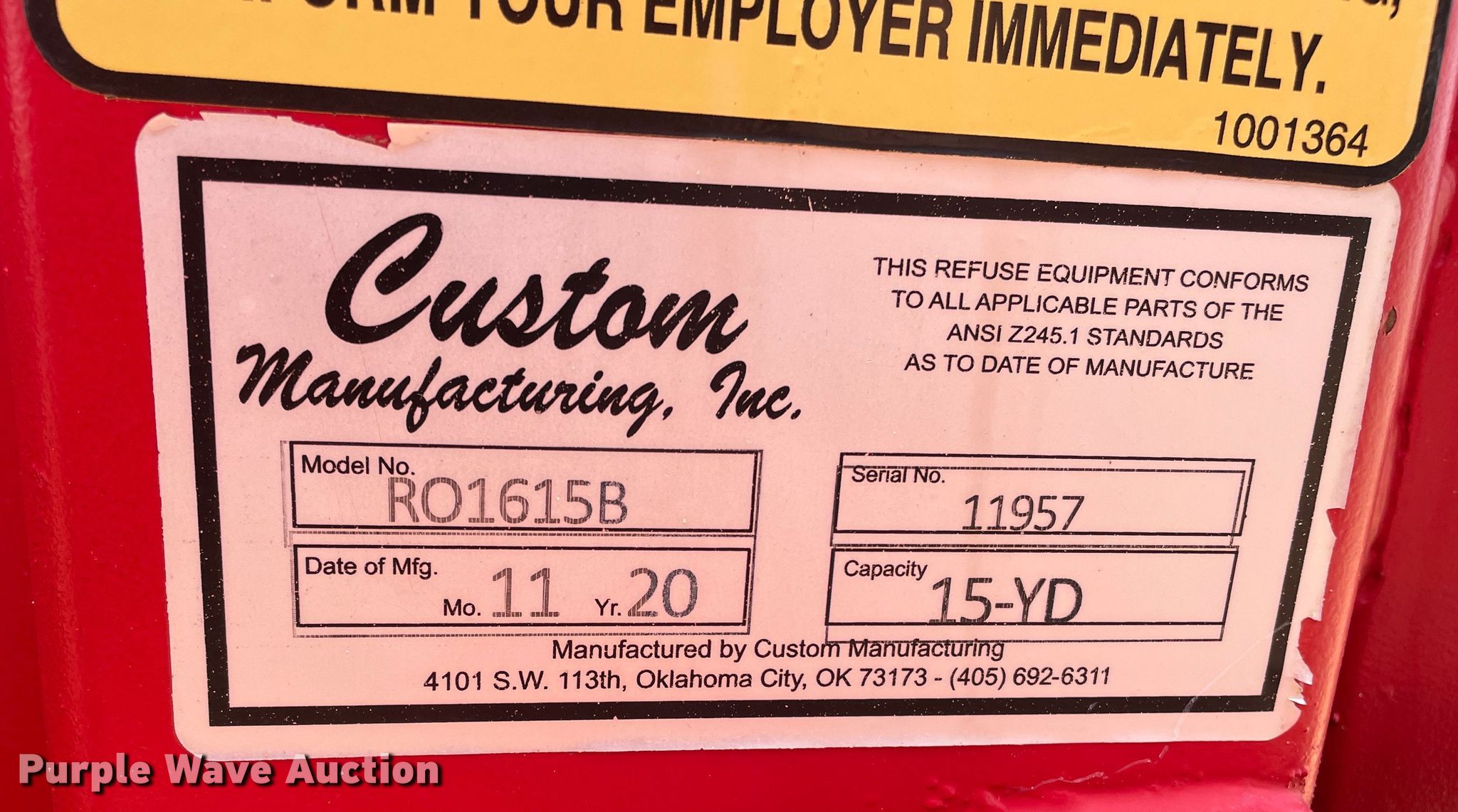 Purple Wave is selling a used Truck Part and Attach. in Texas. This item is a 2020 Custom Manufacturing, Inc. RO1615B roll-off container with the following: Dimensions: 16' L x 93" W x 44" H, Capacity: 15 cu. yd., Serial: 11957