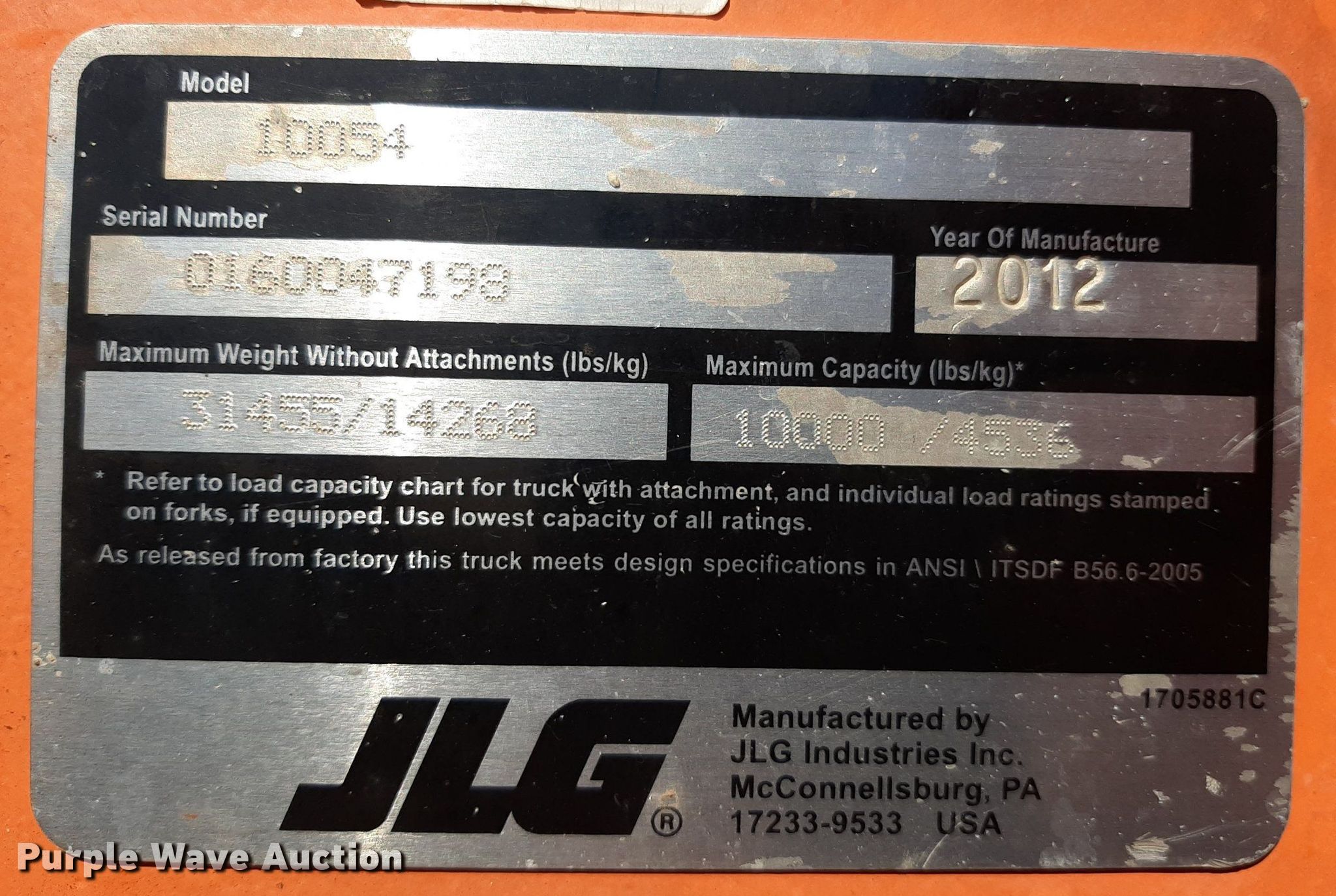Purple Wave is selling a used Telehandler in Kansas. This item is a 2012 JLG Skytrak 10054 telehandler with the following: Hours: 4,347 on meter, Serial: 0160047198