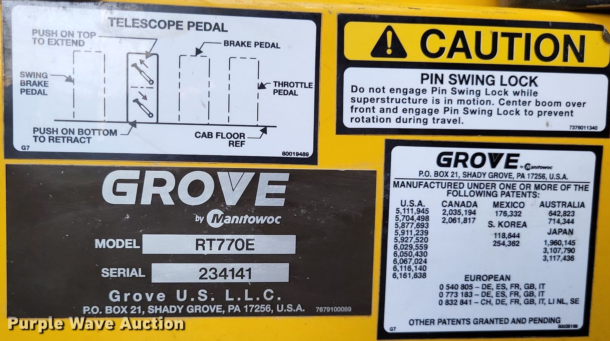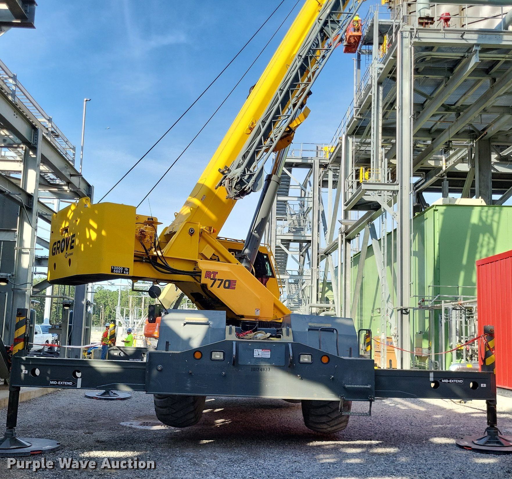 Purple Wave is selling a used Rough or All Terrain Crane in Alabama. This item is a 2013 Grove RT770E crane with the following: Hours: 8,995 on meter, Miles or hours may vary, unit still in use, Serial: 234141