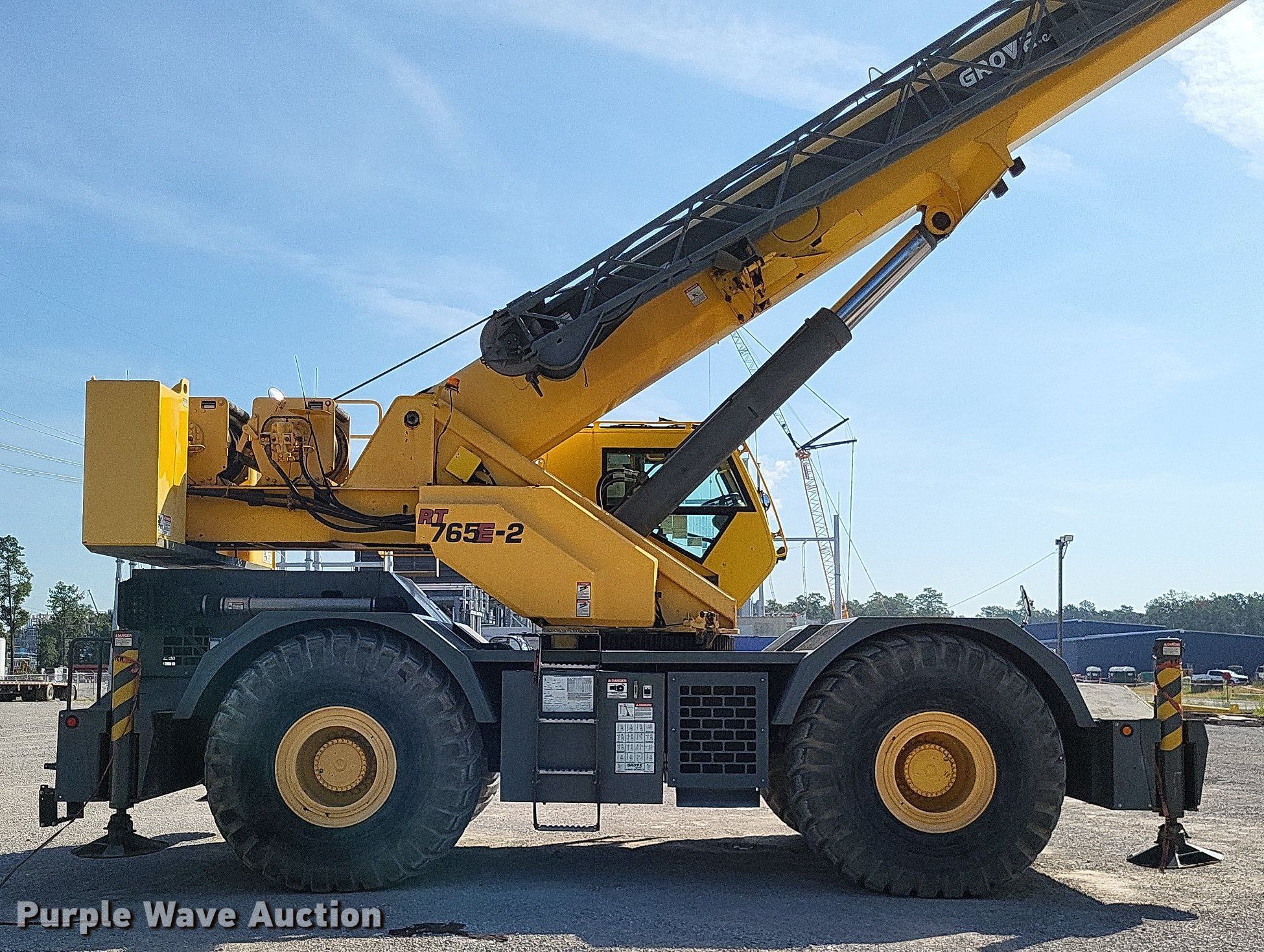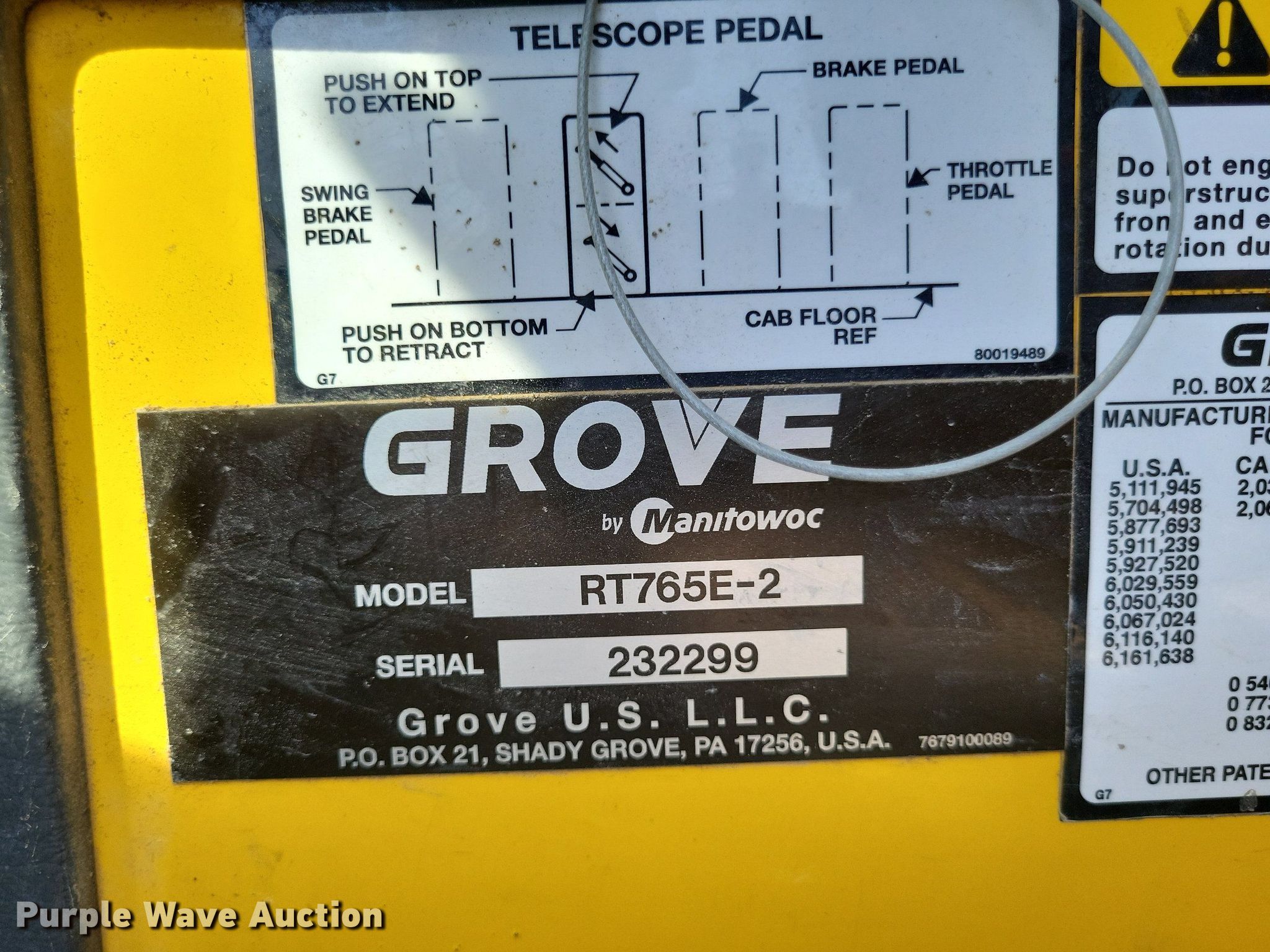 Purple Wave is selling a used Rough or All Terrain Crane in Alabama. This item is a 2012 Grove RT765E2 crane with the following: Hours: 5,641 on meter, Miles or hours may vary, unit still in use, Serial: 232299