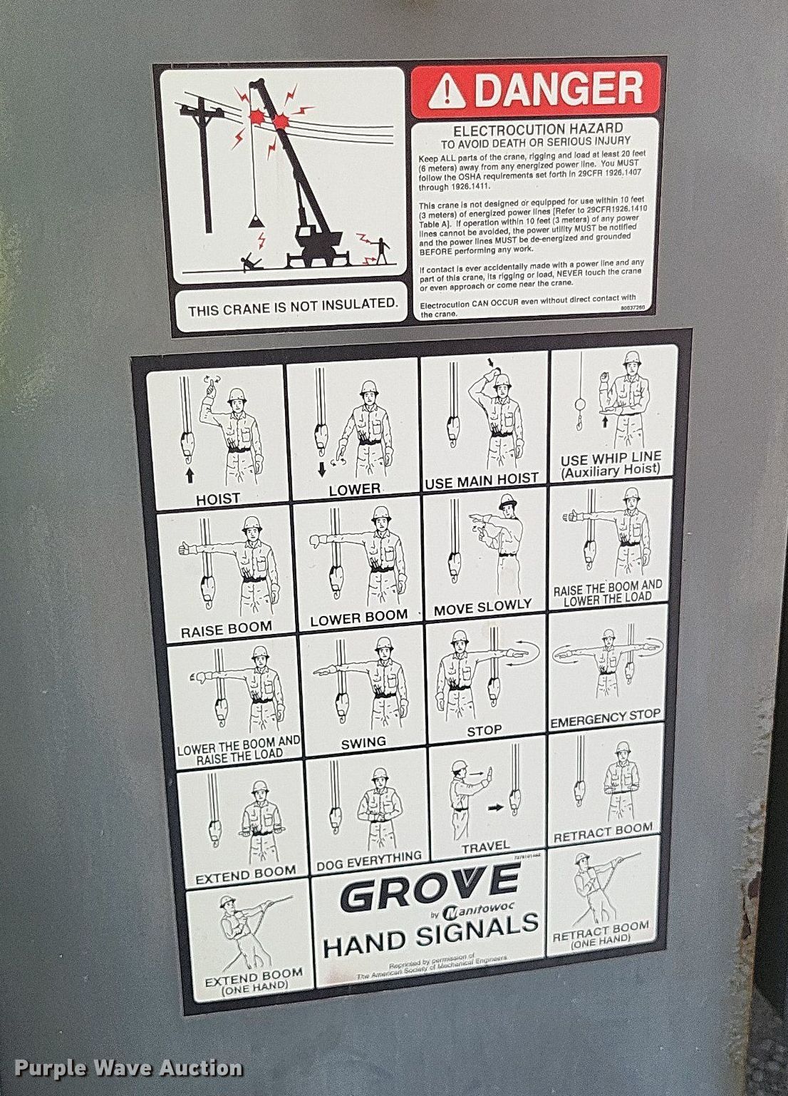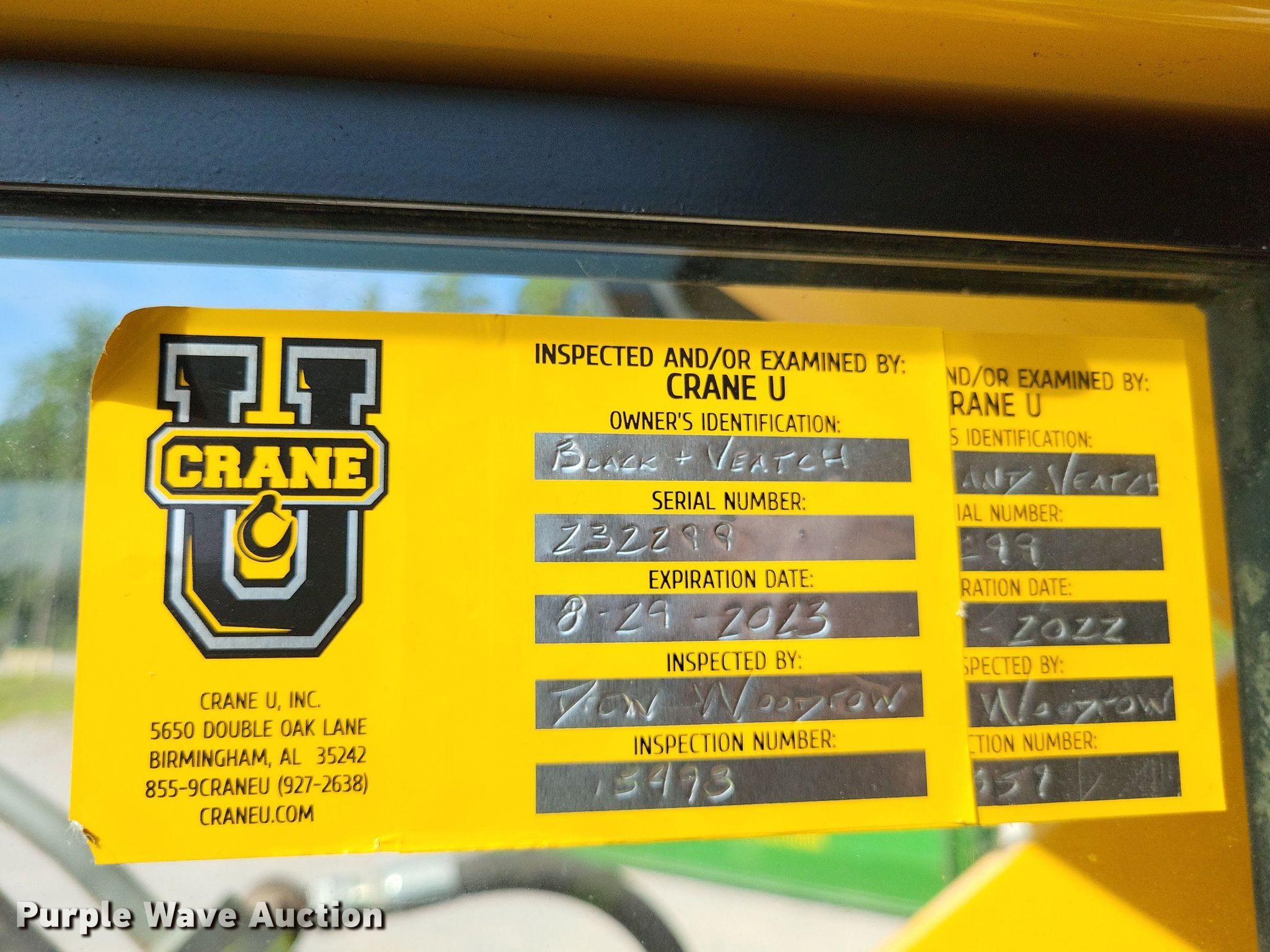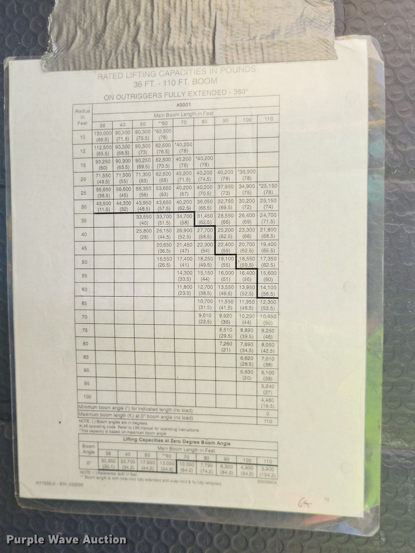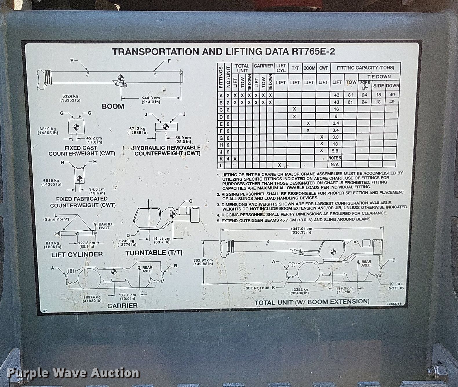 2012 Grove RT765E2 crane. Hours: 5,641 on meter, Miles or hours may vary, unit still in use, Serial: 232299. Engine Cummins QSB6.7L, Displacement: 6.7L, Cylinders: 6, Fuel type: Diesel. Transmission Automatic. Chassis Four wheel drive, Brakes: Hydraulic. Operators station Enclosed cab, AC, Heat, Crane controls: Stick, Upper interior Load monitor Hirschmann.. Features Boom Telescopic, Maximum boom length: 110' Sections: 3, Maximum lift capacity: 130,000 lbs, Maximum lift height: 166', Jib: 56', Stabilizers: 4, Boom controls In-cab, Winches: 2, Crane block Sheaves: 4, Crane ball & hook, Certification valid through: 08/2023, Manuals, Lift chart. Tires Size: 29.5-25. Notes Whip line winch hydraulic leak. Black & Veatch Corp.. 15290 U.S. 43. Bucks, AL 36512