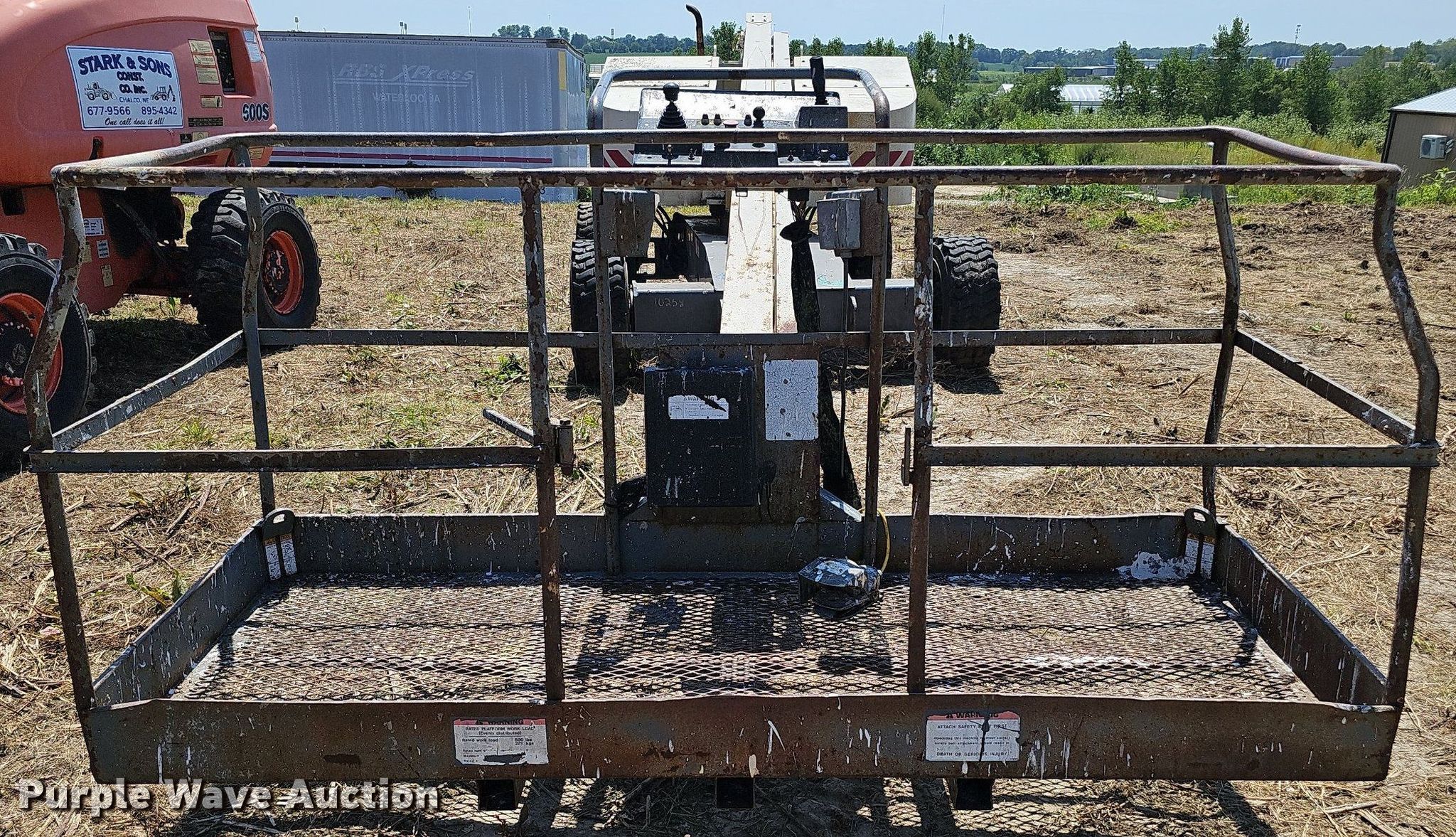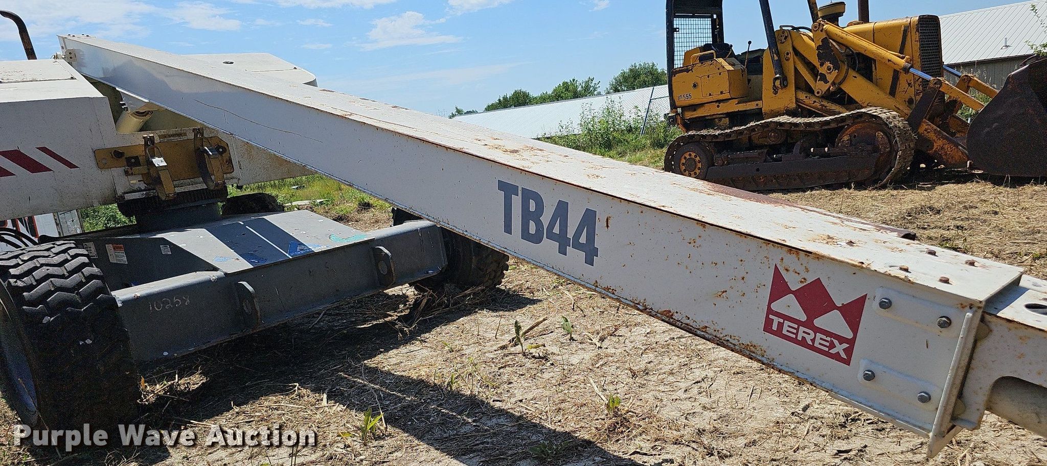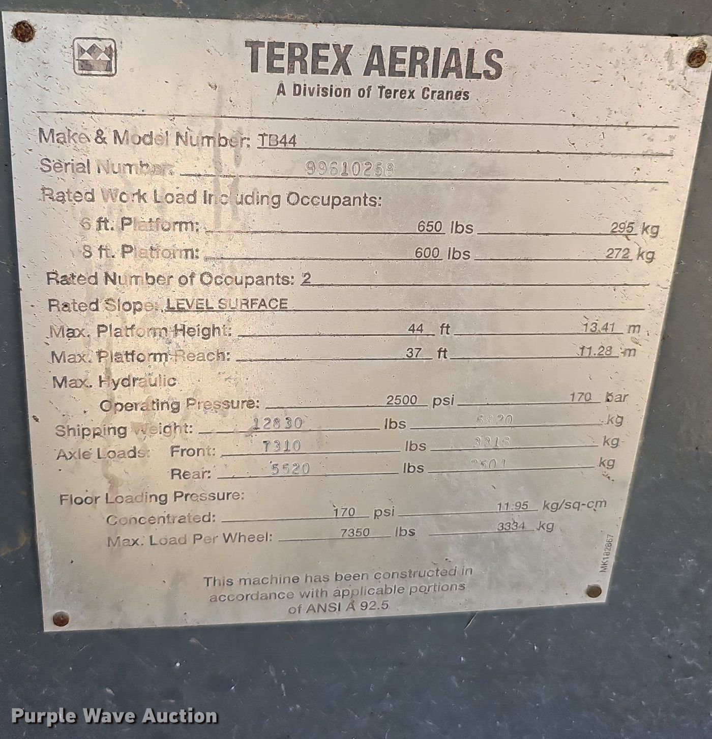 1999 Terex TB44 boom lift. Hours: 3,352 on meter, Serial: 99610258. Engine Ford LRG-425P-6006-A, Serial: 00598-1-01-99, Cylinders: 4, Fuel type: Gas. Chassis Four wheel drive. Features Rough terrain, Maximum lift capacity: 600 lbs, Maximum reach length: 37', Maximum lift height: 44', Platform: 96" L x 36" W, AC power outlet, Controls: Platform, Ground, Platform rotation: Hydraulic. Tires Tire size: 12-16.5, Foam filled. Notes Hydraulic leak, Engine plug disconnected, Unknown operating condition. Stark and Sons Construction Co. Inc.. 21803 R & R Road. Gretna, NE 68028