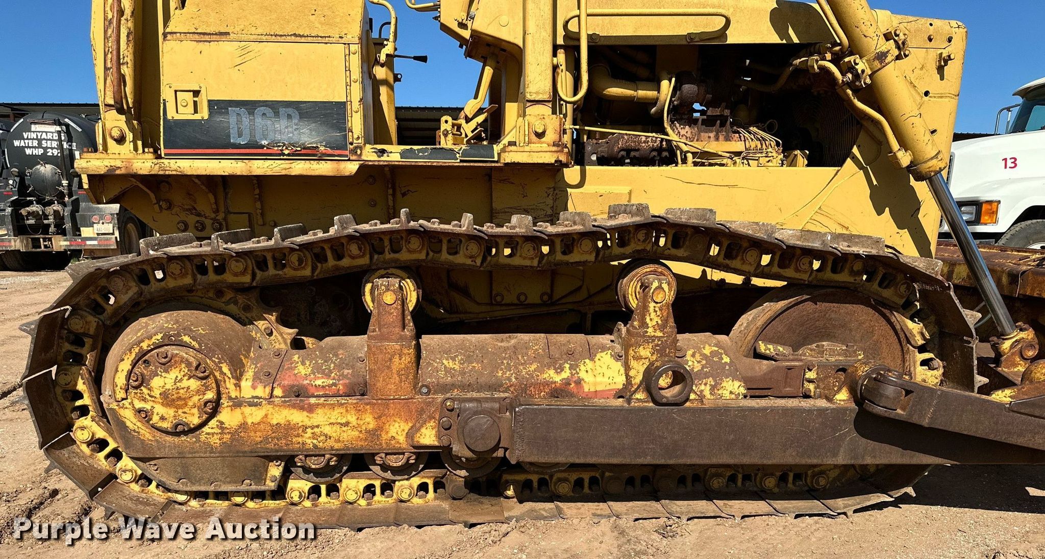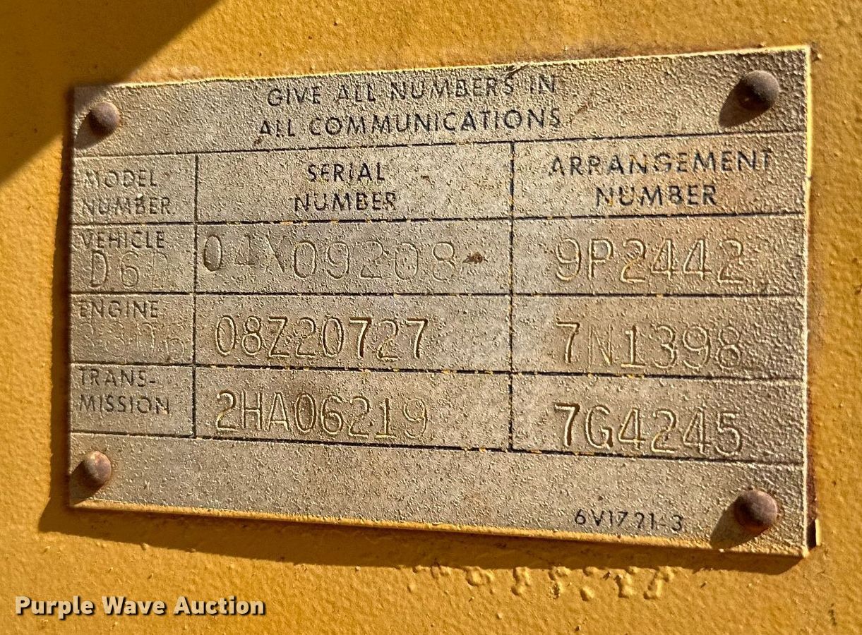 1984 Caterpillar D6D dozer. Hours: 2,726 on meter, Serial: 04X09208. Engine Caterpillar 3306, Serial: 08Z20727, Displacement: 10.5L, Cylinders: 6, Fuel type: Diesel. Transmission Powershift, 3F - 3R. Operators station OROPS, Steering: Clutch brake. Features Rear drawbar, Dozer blade Type: Straight, Dual-tilt, Width: 12'. Tracks Width: 22", Grouser pads: Single, Bottom rollers: 6. Vinyard Water Service, Inc.. 708 East 11th Street. Shamrock, TX 79079