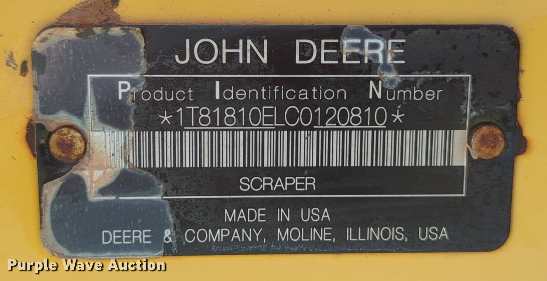 Purple Wave is selling a used Pull Type Scraper in Oklahoma. This item is a 2012 John Deere 1810E scraper with the following: Serial: 1T81810ELC0120810
