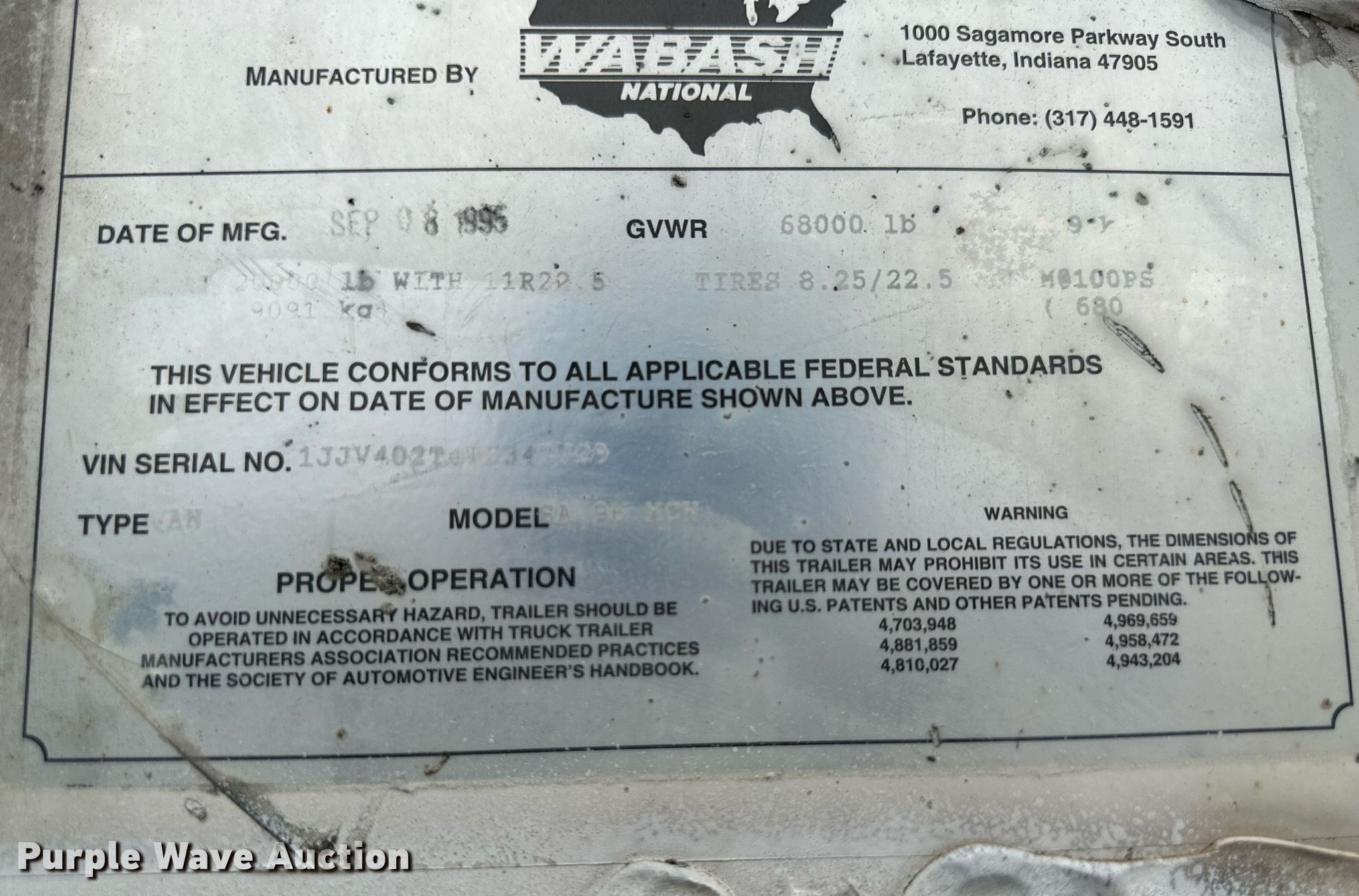1996 Wabash SA95MCW dry van office trailer. VIN: 1JJV402T4TL347729. Dimensions Overall: 48' L x 102" W, Office area: 24' L, Work area: 24' L. Features Deck type: Wood. Chassis Landing gear: Dual, Suspension: Spring, Brakes: Air, Axles: Tandem, GVWR: 68,000 lbs. Tires Steel wheels, Size: 295/75R22.5. Missouri title. Title distribution may be delayed up to 14 days from verification of funds. Lance Houston Excavating. 5030 Northwest Waukomis Drive. Kansas City, MO 64151
