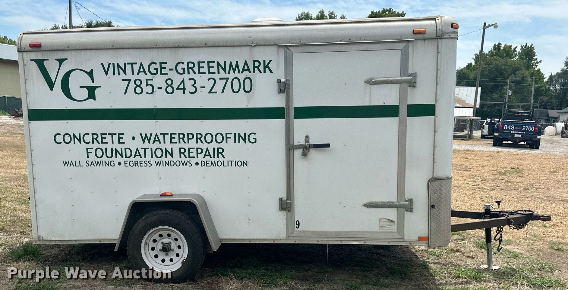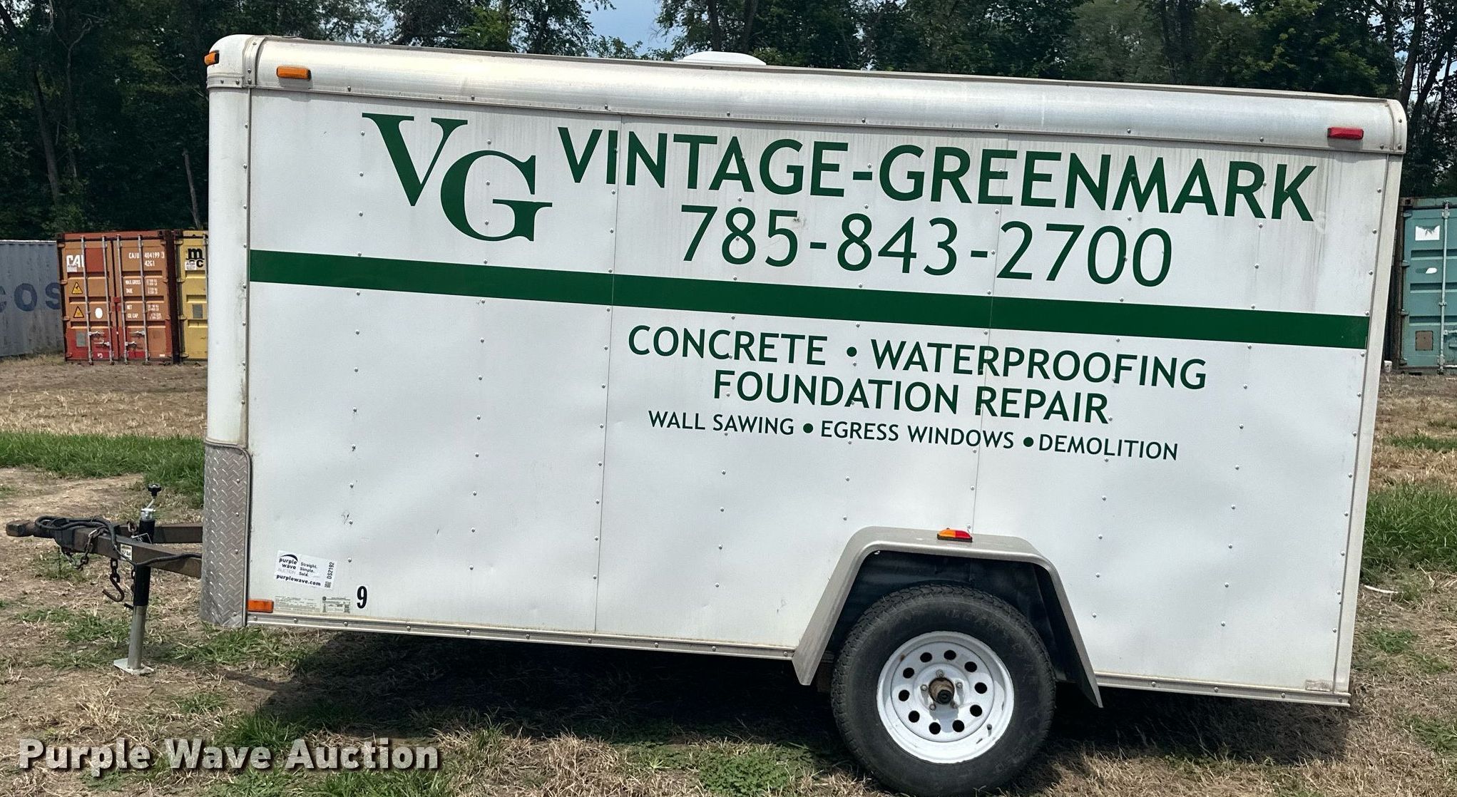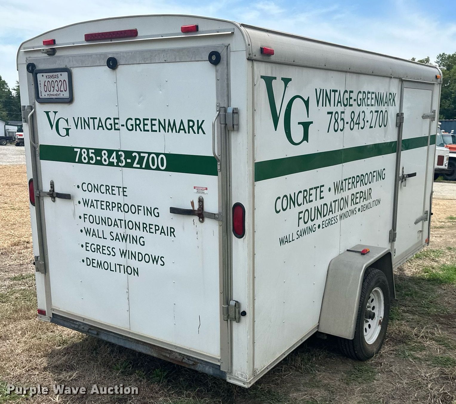 2012 Atlas Specialty Products enclosed cargo trailer. VIN: 5HCKU1215CE023382. Dimensions Overall: 16' 6" L x 96" W, Body: 13' L x 72" W, Rear door / ramp 68" L x 68" W. Features Deck type: Wood. Chassis Ball hitch: 2 5/16", Landing gear: Single, Suspension: Spring. Tires Steel wheels, Size: 205/75R15. Vehicle has an E-Title in the State of Kansas. A paper title will be distributed to the buyer within 30 days from verification of funds. Vintage Greenmark Construction. 827 Maple Street. Lawrence, KS 66044