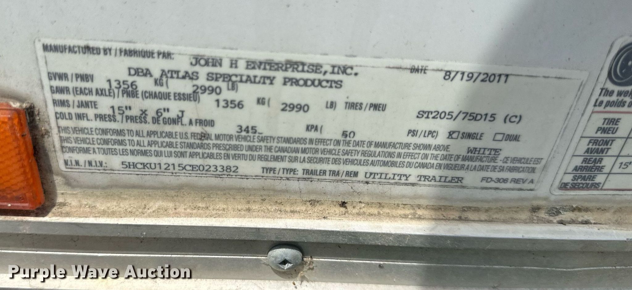 Purple Wave is selling a used Enclosed Cargo Trailer in Kansas. This item is a 2012 Atlas Specialty Products enclosed cargo trailer with the following: VIN: 5HCKU1215CE023382