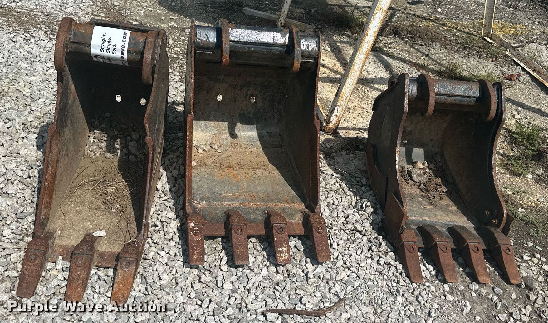 Purple Wave is selling a used Excavator Attach. in Kansas. This item is a (3) Bobcat excavator buckets with the following: Width: 12", Teeth: 3, Width: 16", Teeth: 4, Width: 18", Teeth: 4