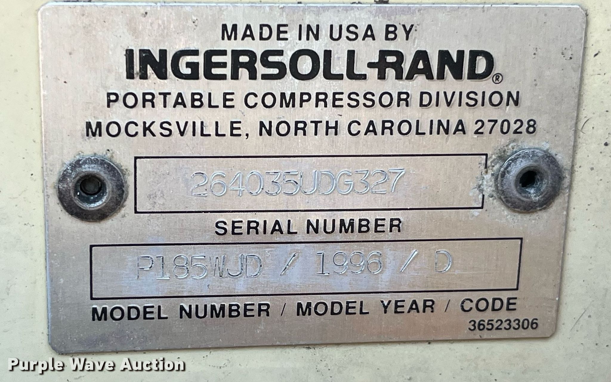 Purple Wave is selling a used Air Compressor in Illinois. This item is a 1996 Ingersoll Rand P185WJD air compressor with the following: Hours: 1,424 on meter, Serial: 264035UDG327
