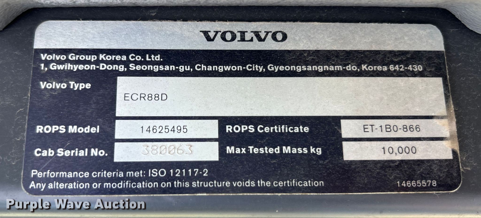 Purple Wave is selling a used Mini Excavator in Missouri. This item is a 2013 Volvo ECR88D mini excavator with the following: Hours: 887 on meter, Serial: VCE00E88H00210096