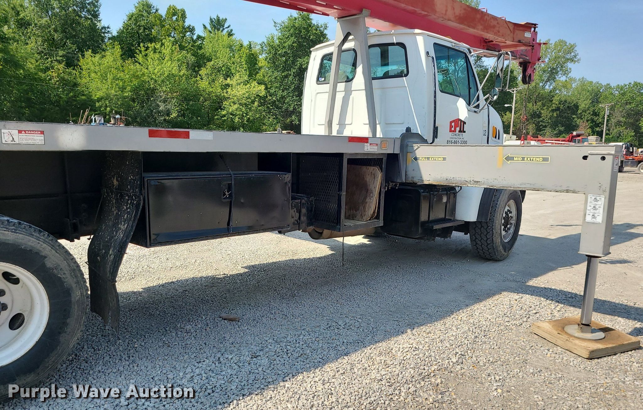 2001 Sterling LT7500 crane truck. Miles: 116,562 on odometer, VIN: 2FZHATAK61AJ34487. Engine Caterpillar 3126, Displacement: 7.2L, Cylinders: 6, Fuel type: Diesel. Transmission Eaton Fuller Roadranger, Manual, Speed: 10. Chassis Axles: Tandem, Suspension: Spring over walking beam, Brakes: Air, PTO, GVWR: 60,000 lbs. Interior AC, Heat. Features Flatbed 22' L x 96" W, Crane Manitowoc, Boom Telescopic, Sections: 4, Jib: 28', Boom controls, Crane ball & hook. Tires Front: 425/65R22.5, Rear: 11R22.5. Notes Dash warning indicator: ABS, Non-operational AC. Missouri title. Title distribution may be delayed up to 14 days from verification of funds. Epic Concrete Construction. 11600 East 98 Street. Kansas City, MO 64134