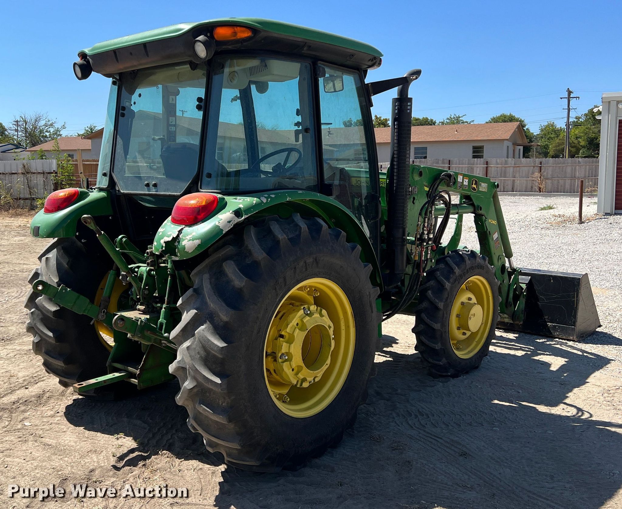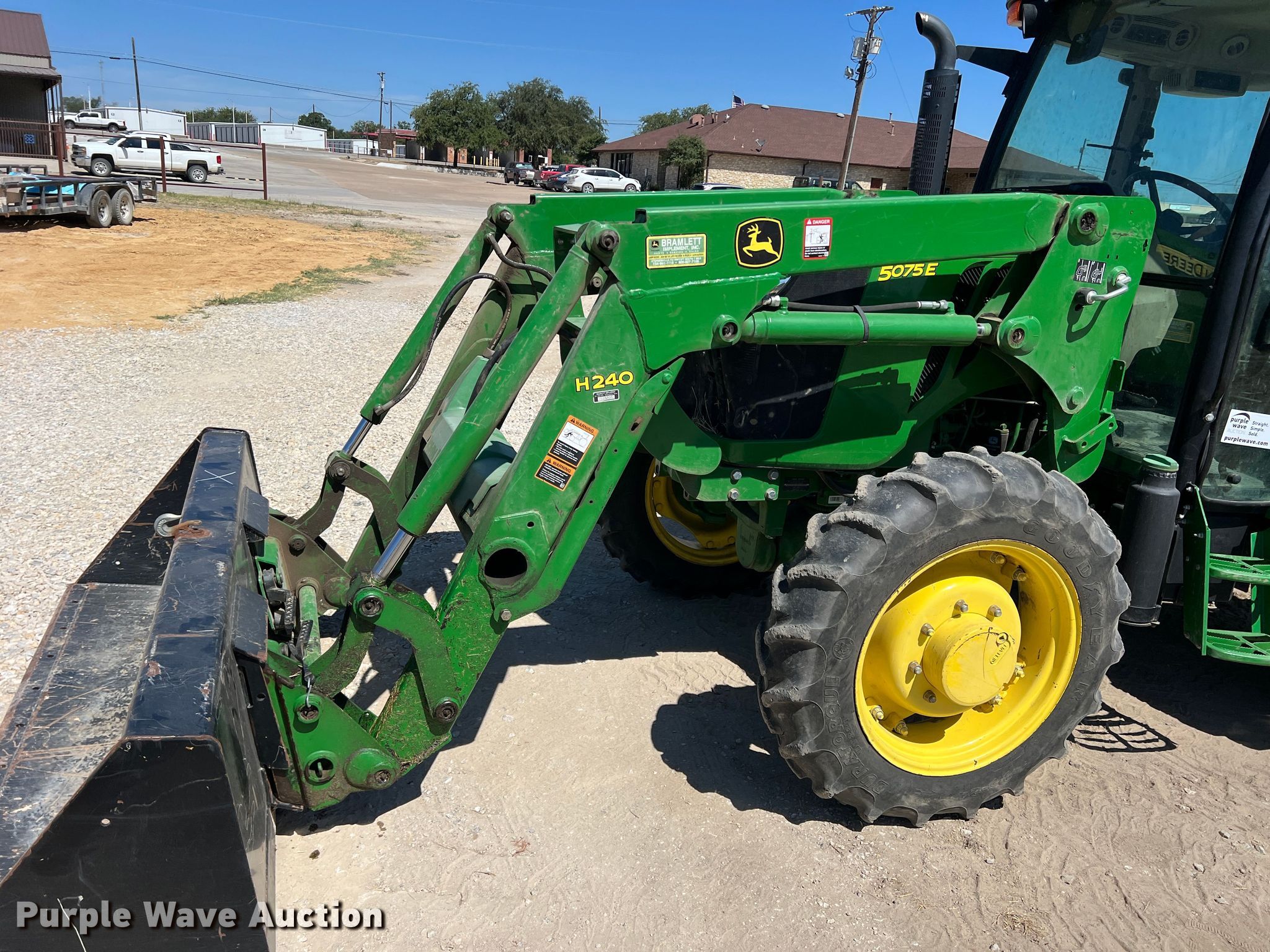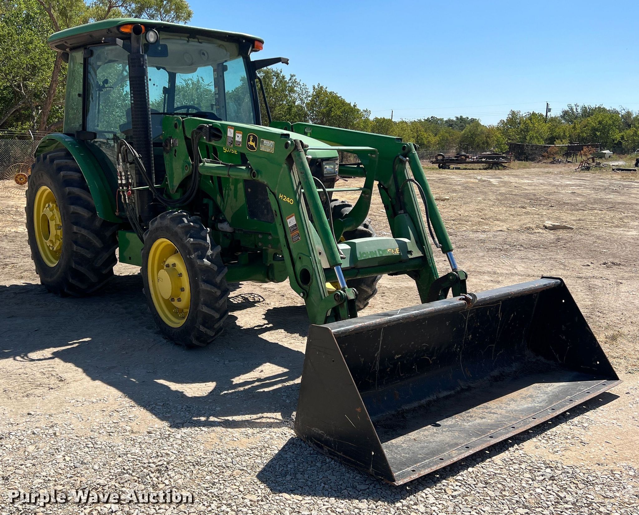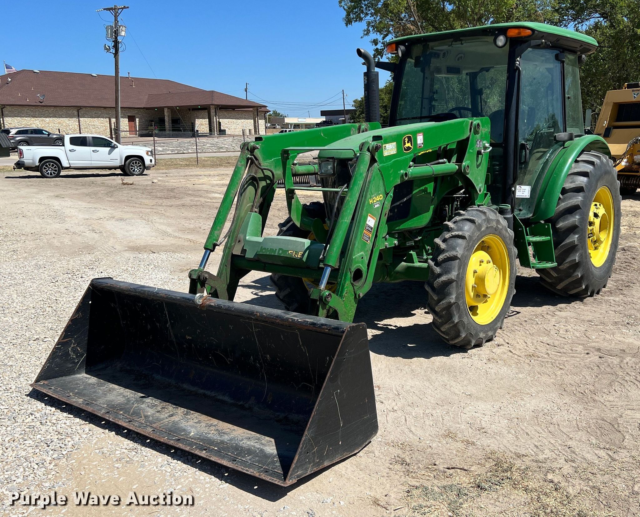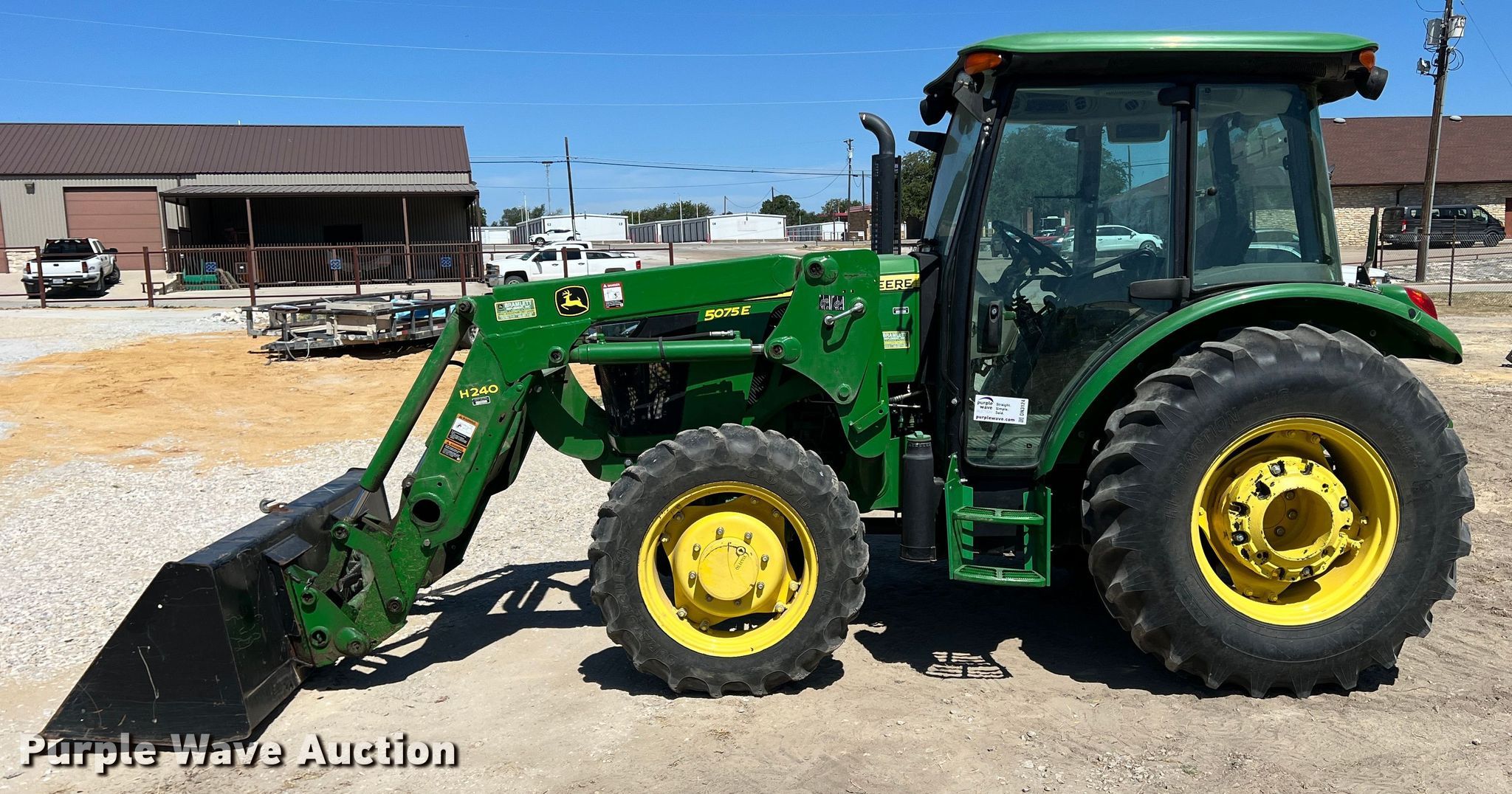 2015 John Deere 5075E MFWD tractor. Hours: 1,576 on meter, Serial: 1PY5075EVFY145760. Engine John Deere, Cylinders: 3, Fuel type: Diesel. Transmission Synchro, 9F - 9R, Left-hand reverser, Differential lock. Operators station AC, Heat. Features PTO: 540, Three point Top link, Seven pin outlet, Hydraulic remote sets Rear: 1, Loader John Deere H240, Controls: Joystick, Bucket Width: 84".. Tires Front: 9.5-24, Rear: 16.9-24, Wheel weights: 4. Notes Bucket tilt cylinder hydraulic leak. First National Bank of Dublin. 825 North Patrick Street. Dublin, TX 76446