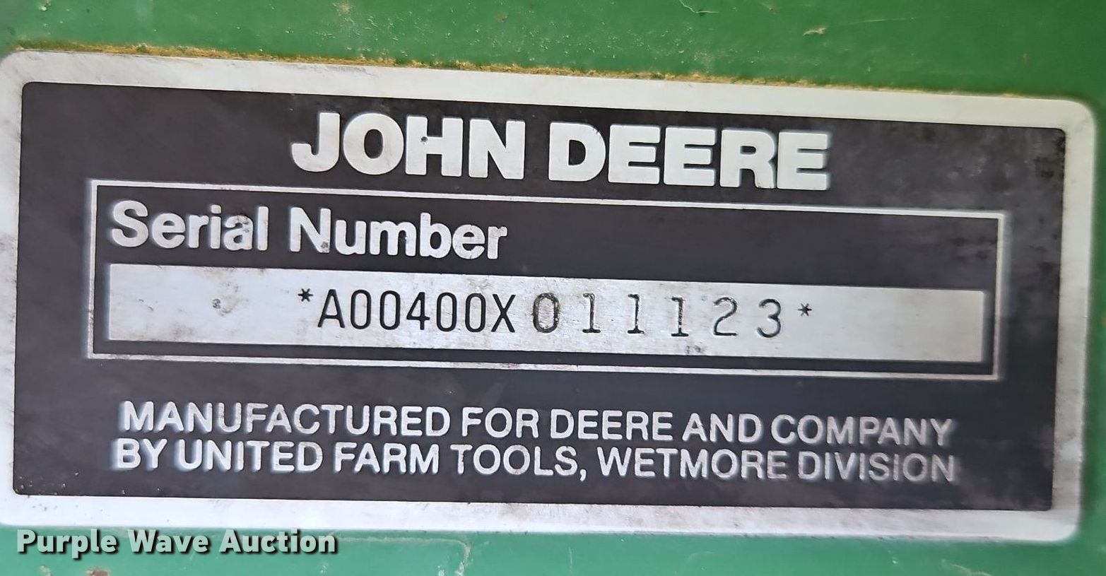 John Deere 400 grain cart. Serial: A00400X011123. Features Capacity: 400 bushels, Auger diameter: 12", Shut-off gate: Hydraulic, Sight glass, Roll tarp, PTO: 1000. Tires Size: 20.00-20, Brand: BF Goodrich. 4820 E Chouteau Rd. Hume, MO 64752
