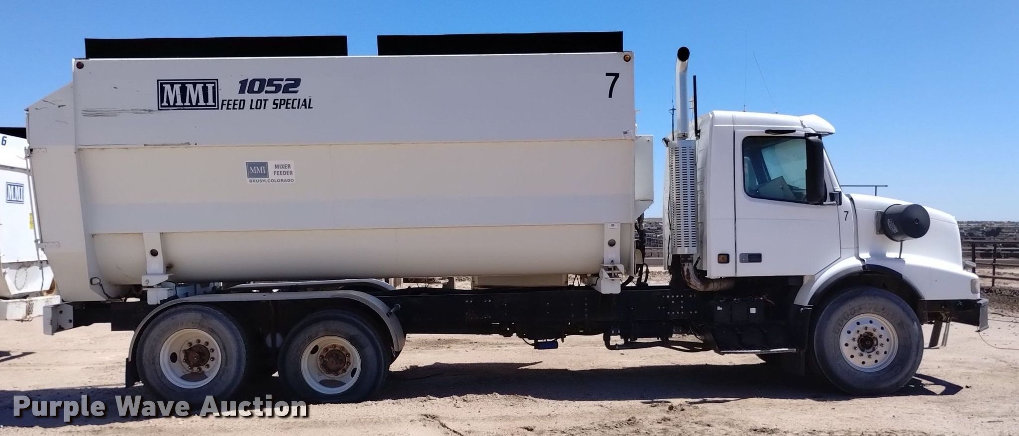 2002 Volvo VHD feed mixer truck. Miles: 224,919 on odometer, VIN: 4V5KC9UE92N332907. Engine Cummins ISM, Displacement: 10.8L, Cylinders: 6, Fuel type: Diesel, HP: 320. Transmission Allison, Automatic. Chassis Differential lock: Full, Axles: Tandem, Gear ratio: 5.380, Suspension: Spring over walking beam, Brakes: Air, PTO, GVWR: 66,000 lbs. Interior AC, Heat, Cruise control. Features Feed mixer bed MMI 1052FLS, In-cab controls, Scales Digi-Star, In-cab controls, Discharge: Side Width: 48", Chute: Hydraulic, Door: Hydraulic, Liner. Tires Front: 445/65R252, Rear: 12R22.5. Notes Dead battery, Unknown operating condition of AC, (3) augers and planetary removed, but included, Tire need replaced, Unknown operating condition. Colorado title. Cobalt Cattle Company. 12988 County Rd 42. Eckley, CO 80727